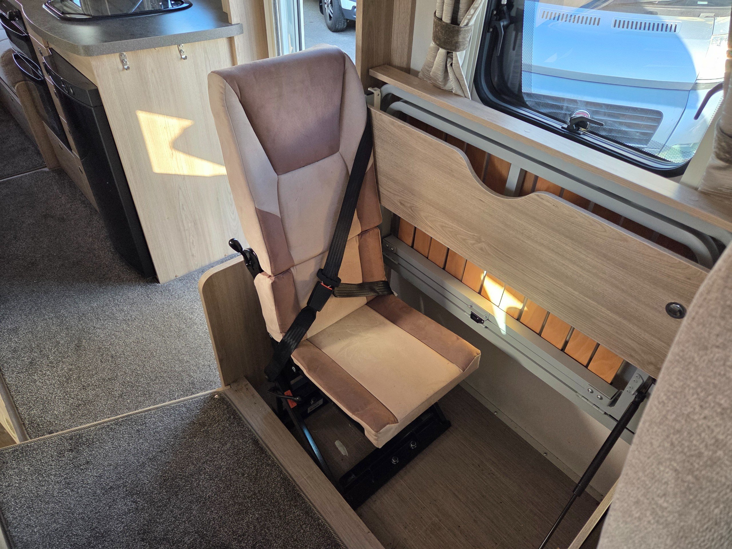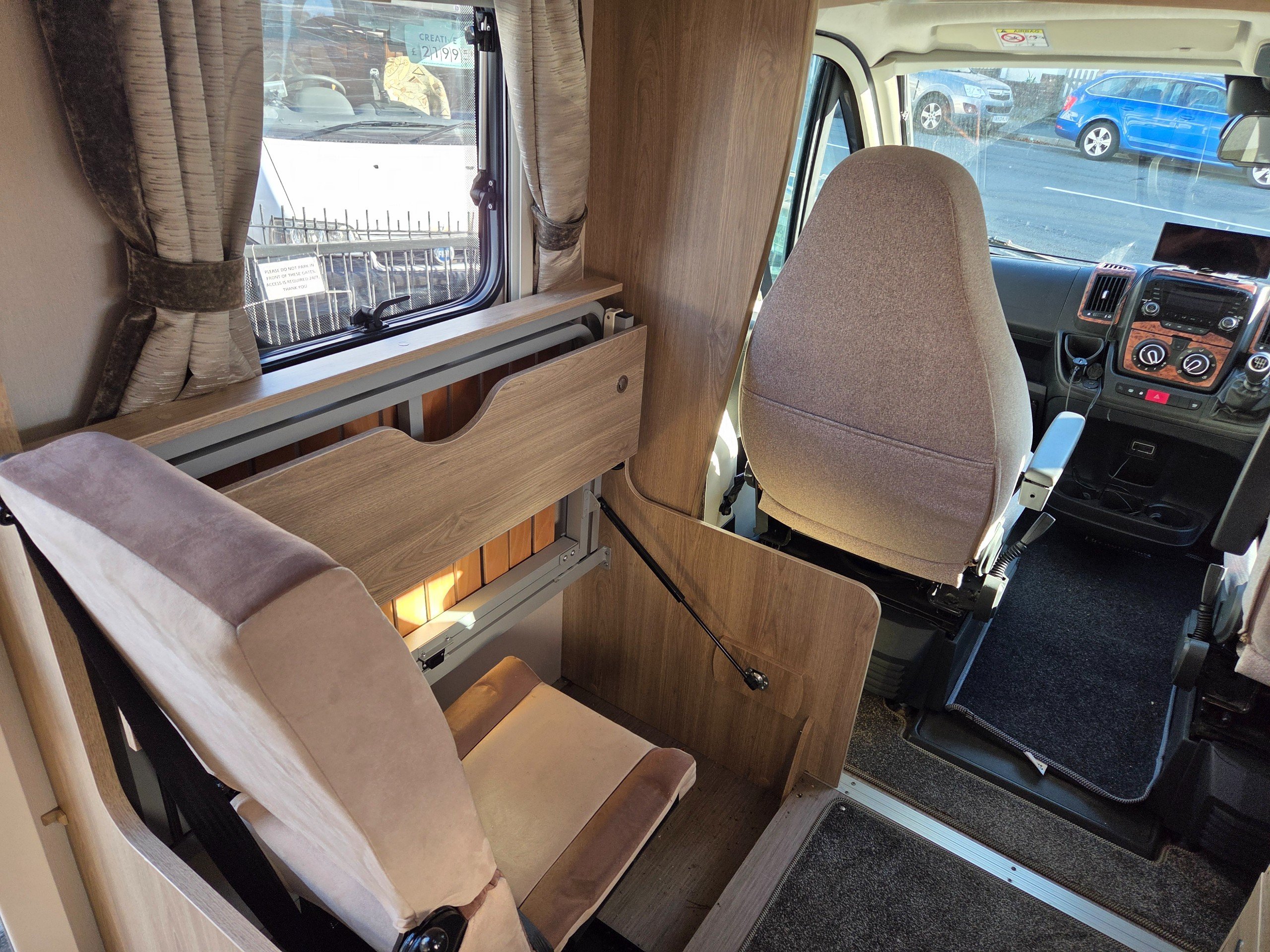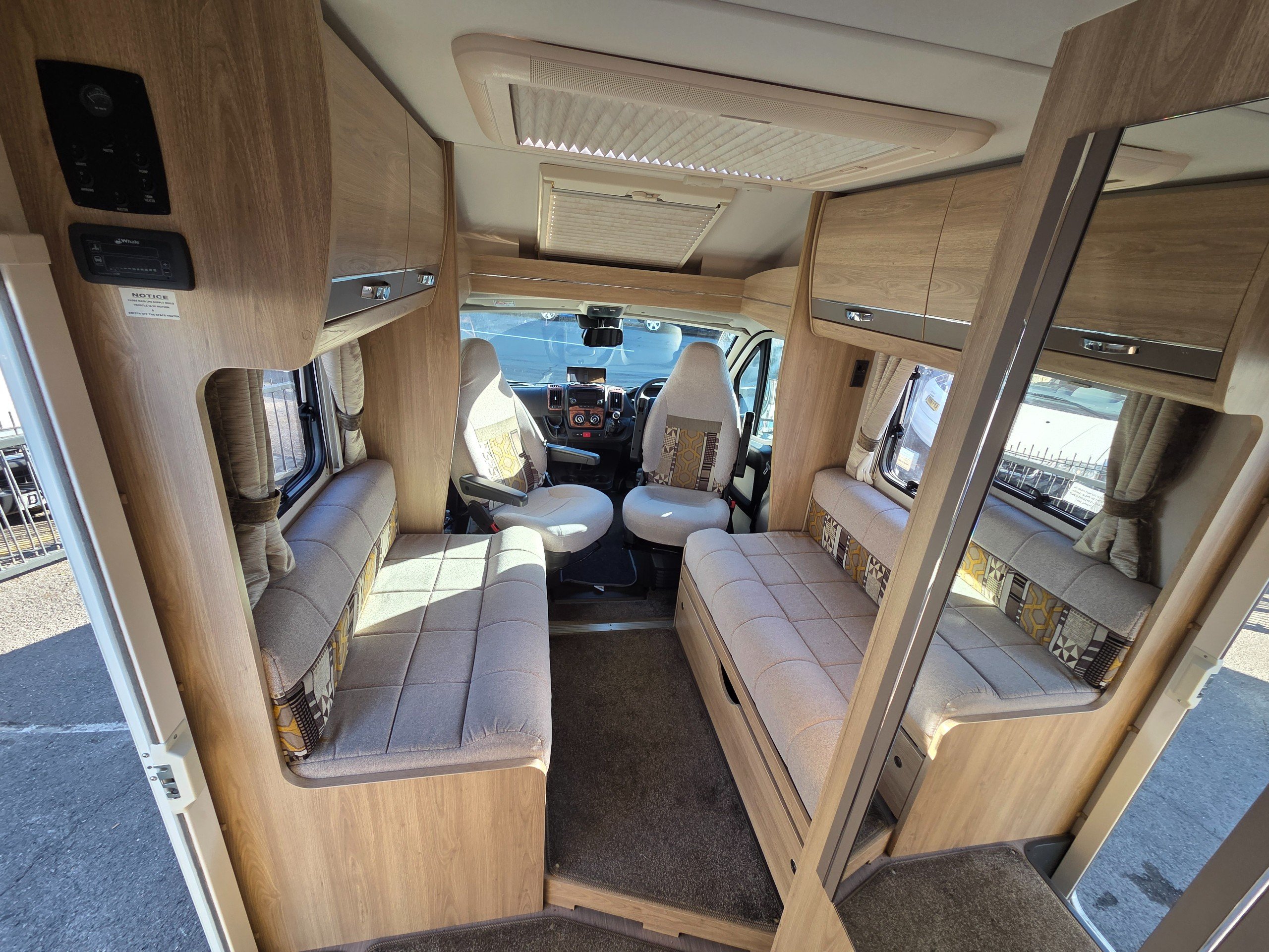 To the front is another lounge this made up from the front seats swivelling around and 2 side settees. There are over head cabinets again and storage available under both seats. This motorhome benefits from having 2 seats that making fold out into traveling seats with 3 point seat belts which means all berths has a belt.