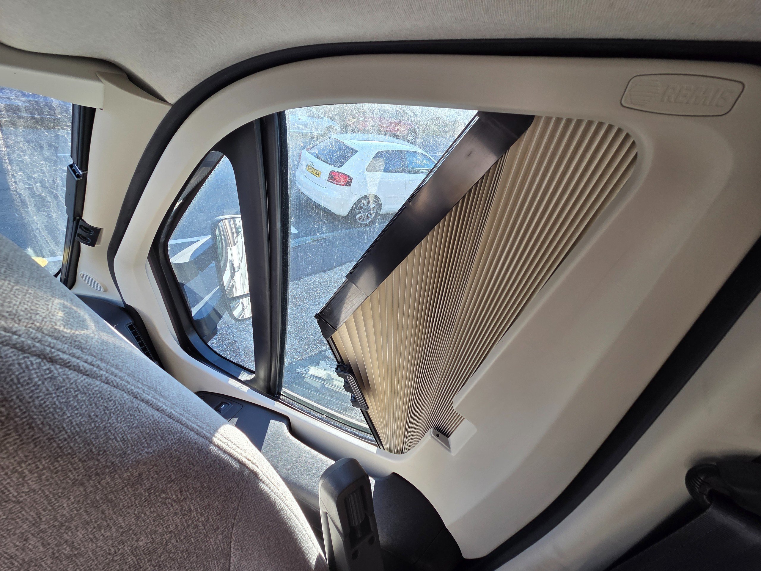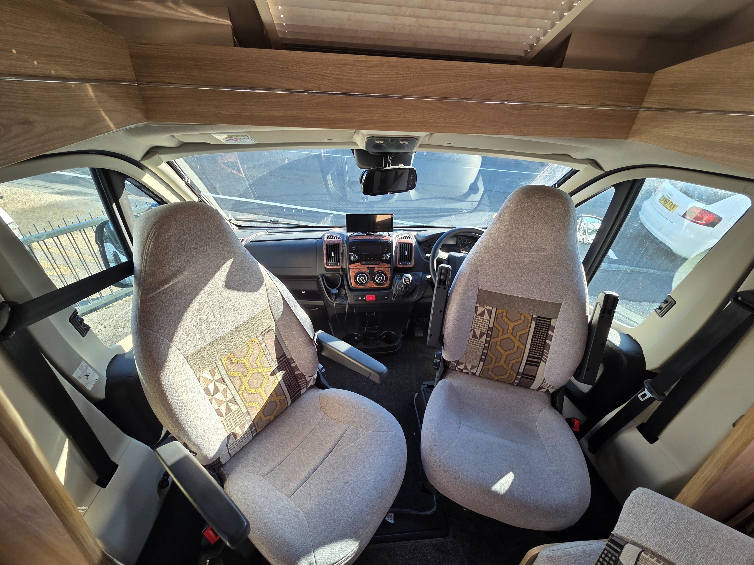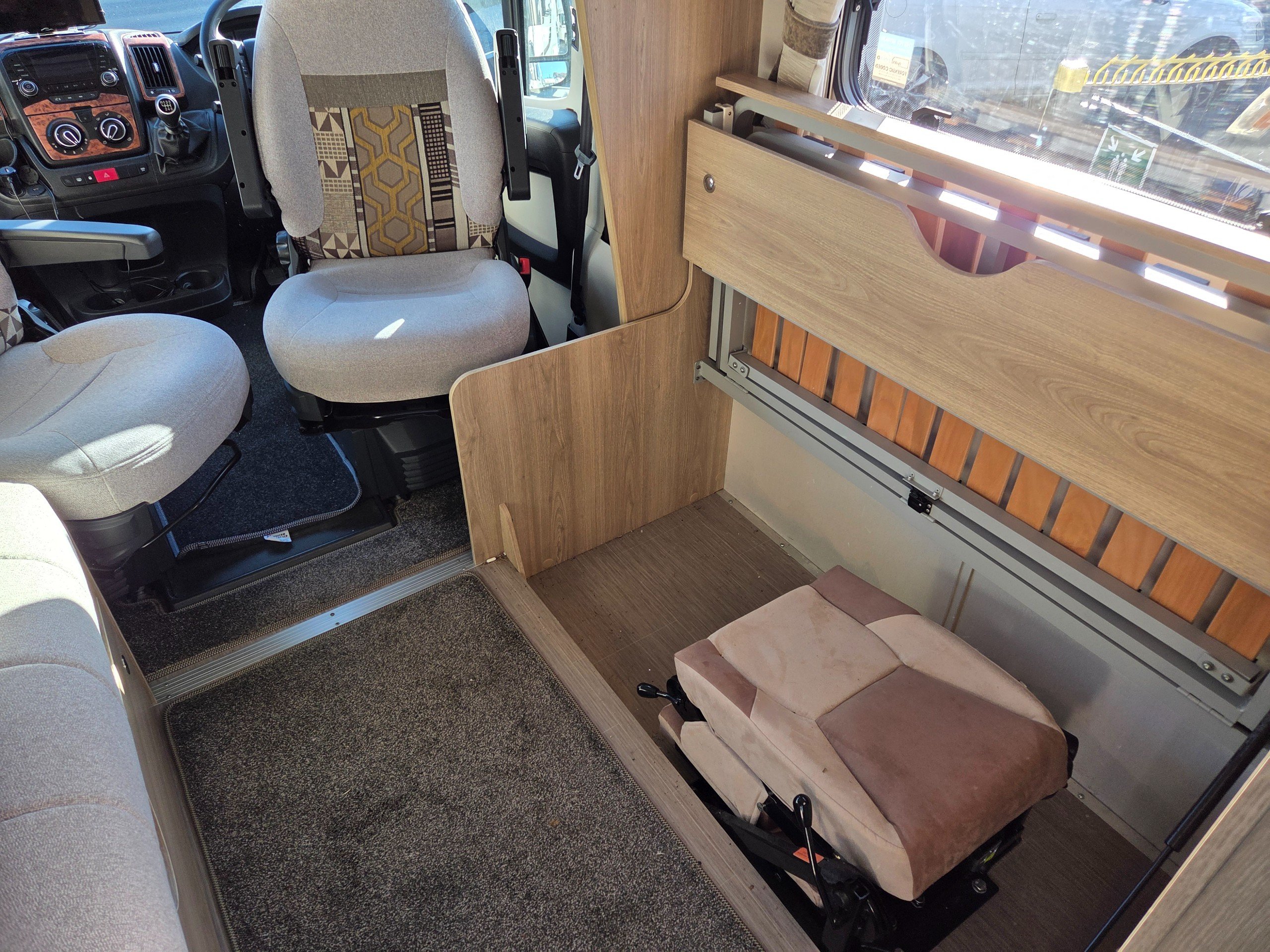 To the front is another lounge this made up from the front seats swivelling around and 2 side settees. There are over head cabinets again and storage available under both seats. This motorhome benefits from having 2 seats that making fold out into traveling seats with 3 point seat belts which means all berths has a belt.