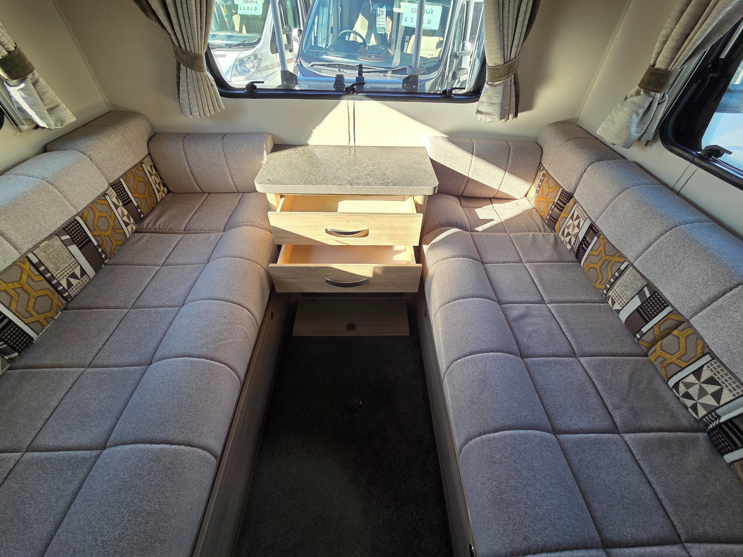 The layout of this motorhome is rear U shaped lounge. (with optional middle drawers that can swapped out for cushions)