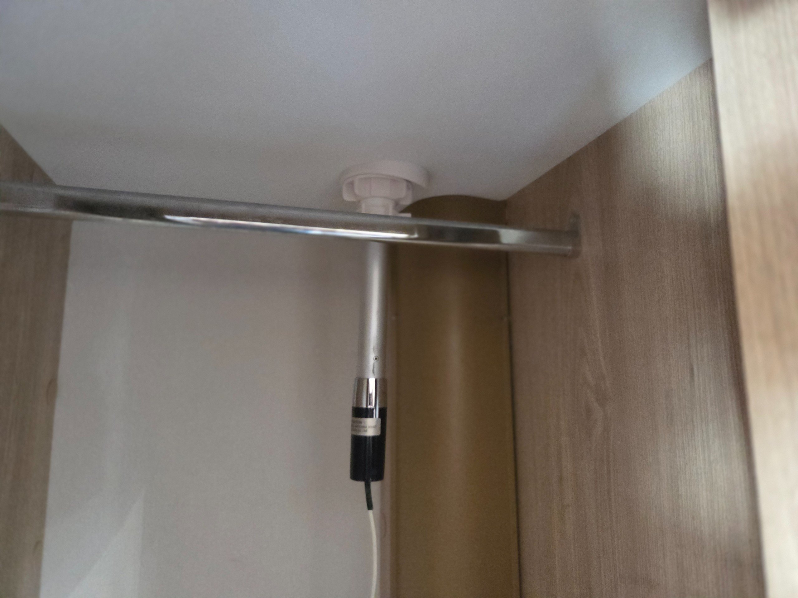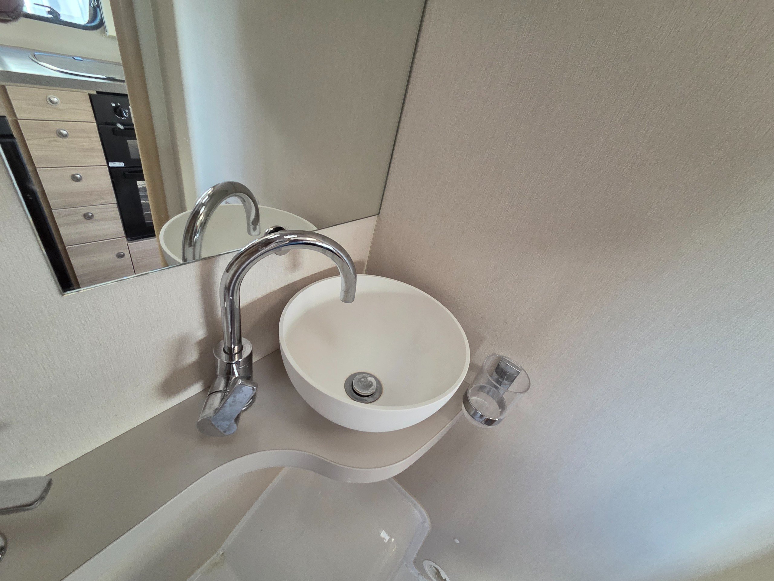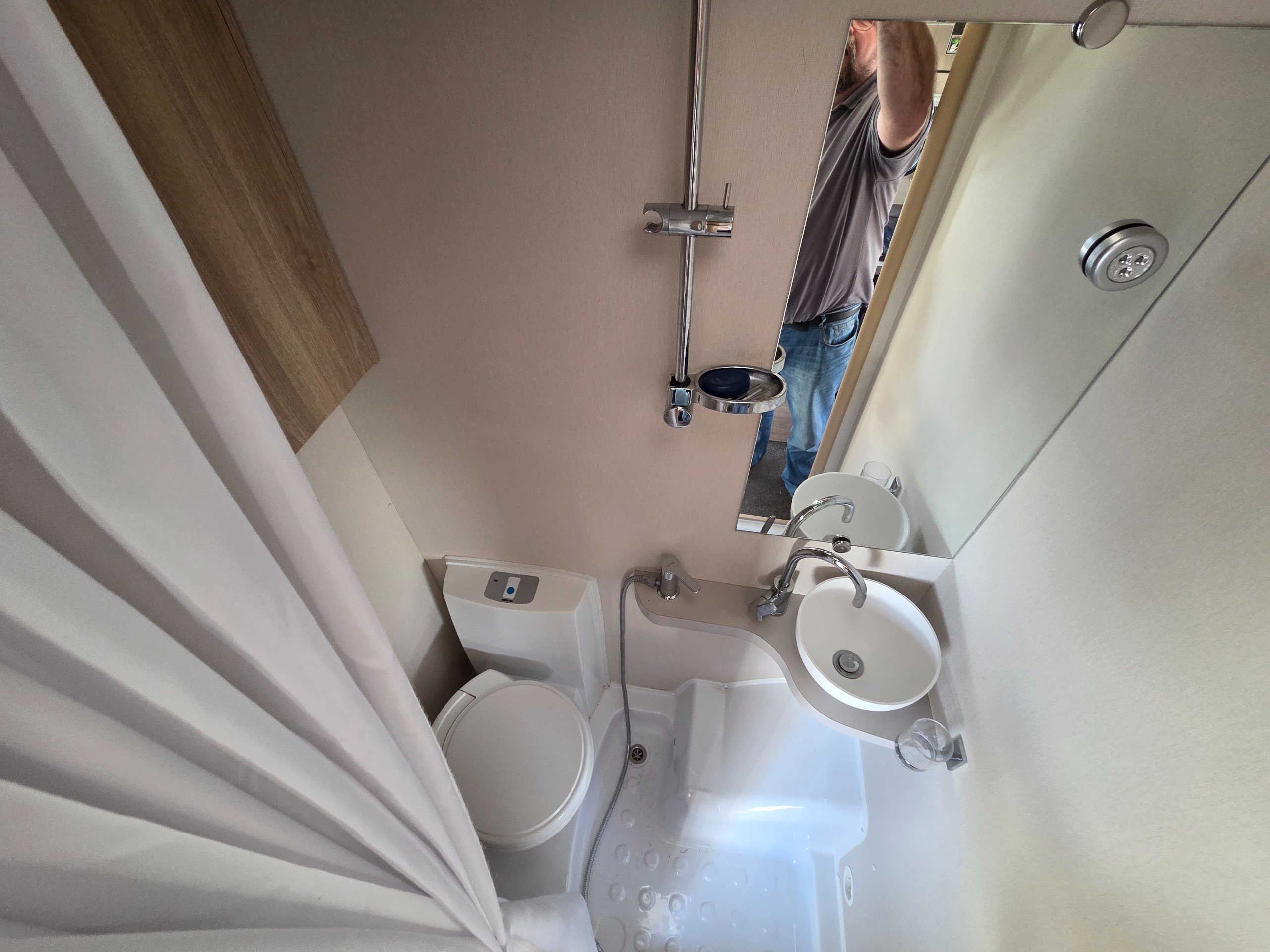 The washroom is oppposite and has an electric swivel toilet, corner hand basin with work surface for the toothbrush and paste, storage up high for the toiletries, shower, vanity mirror and shower curtain.
