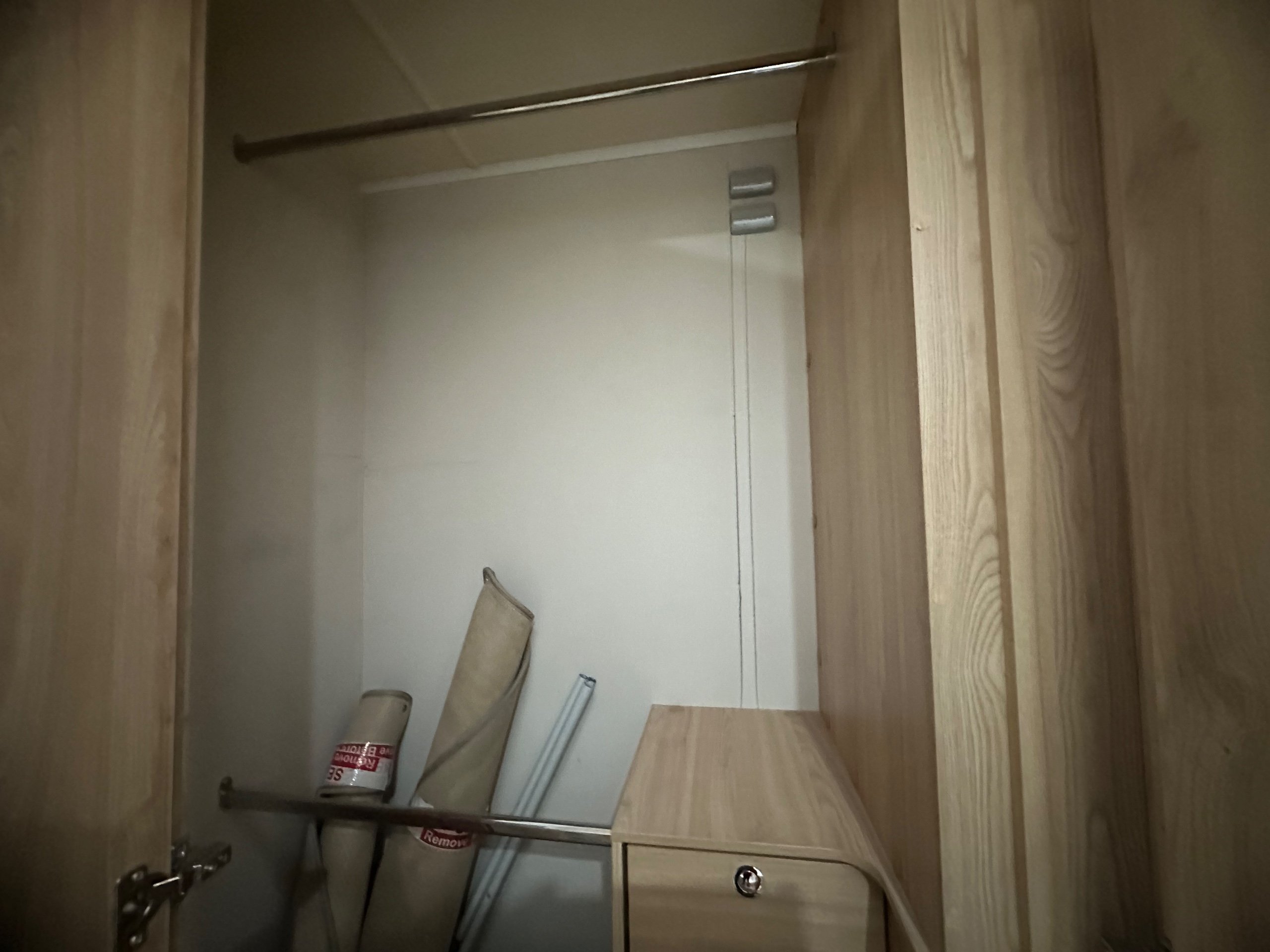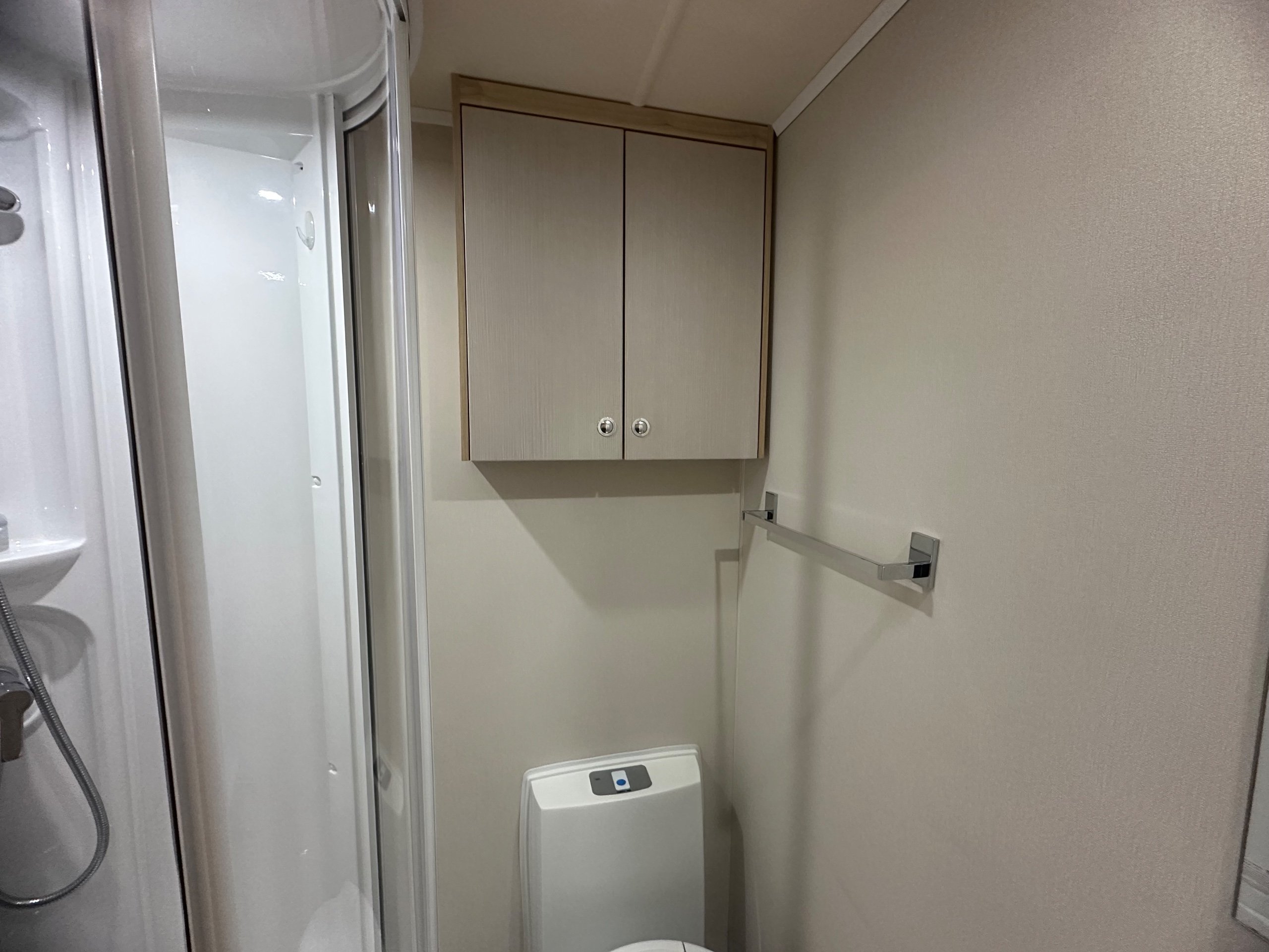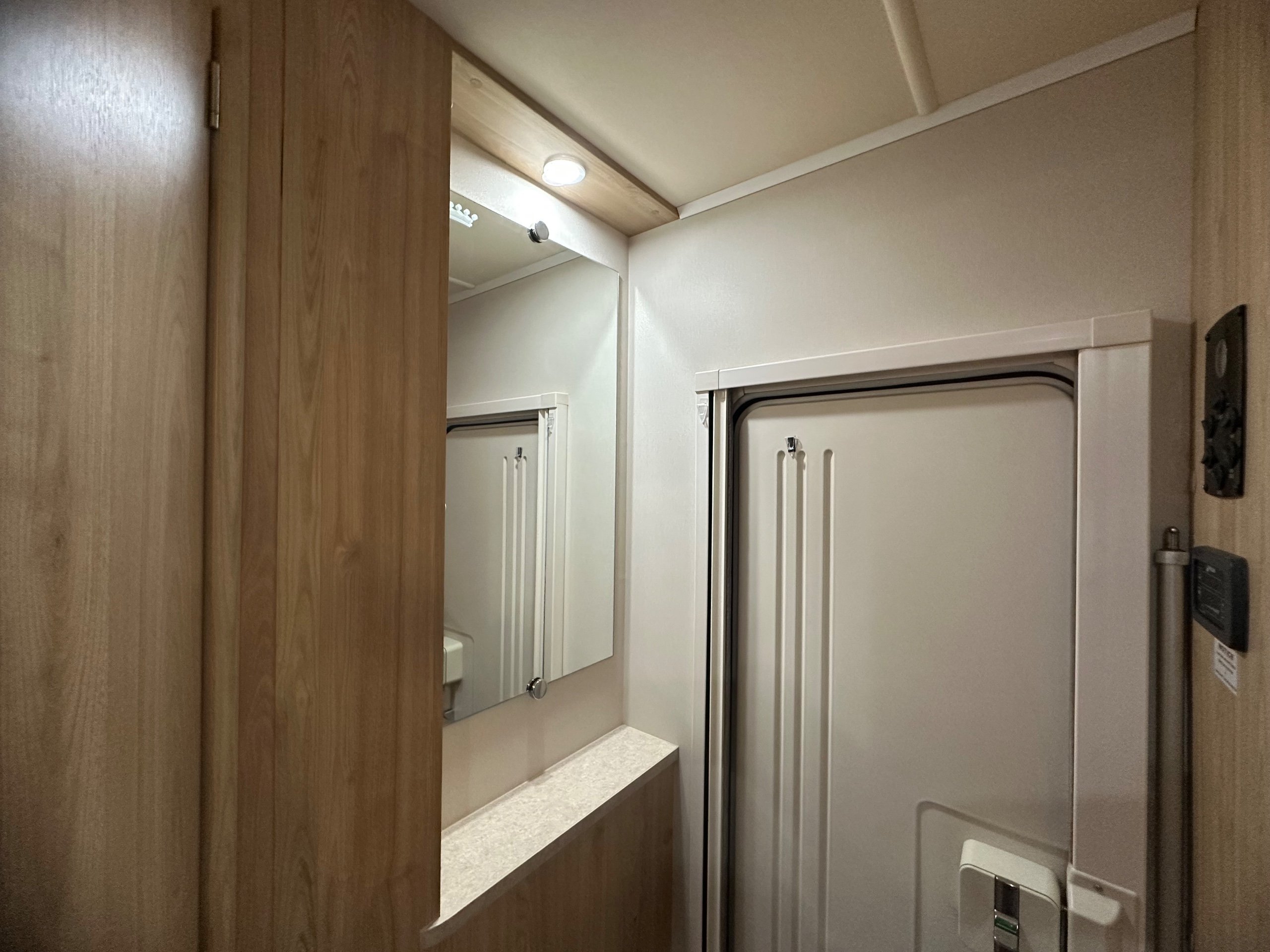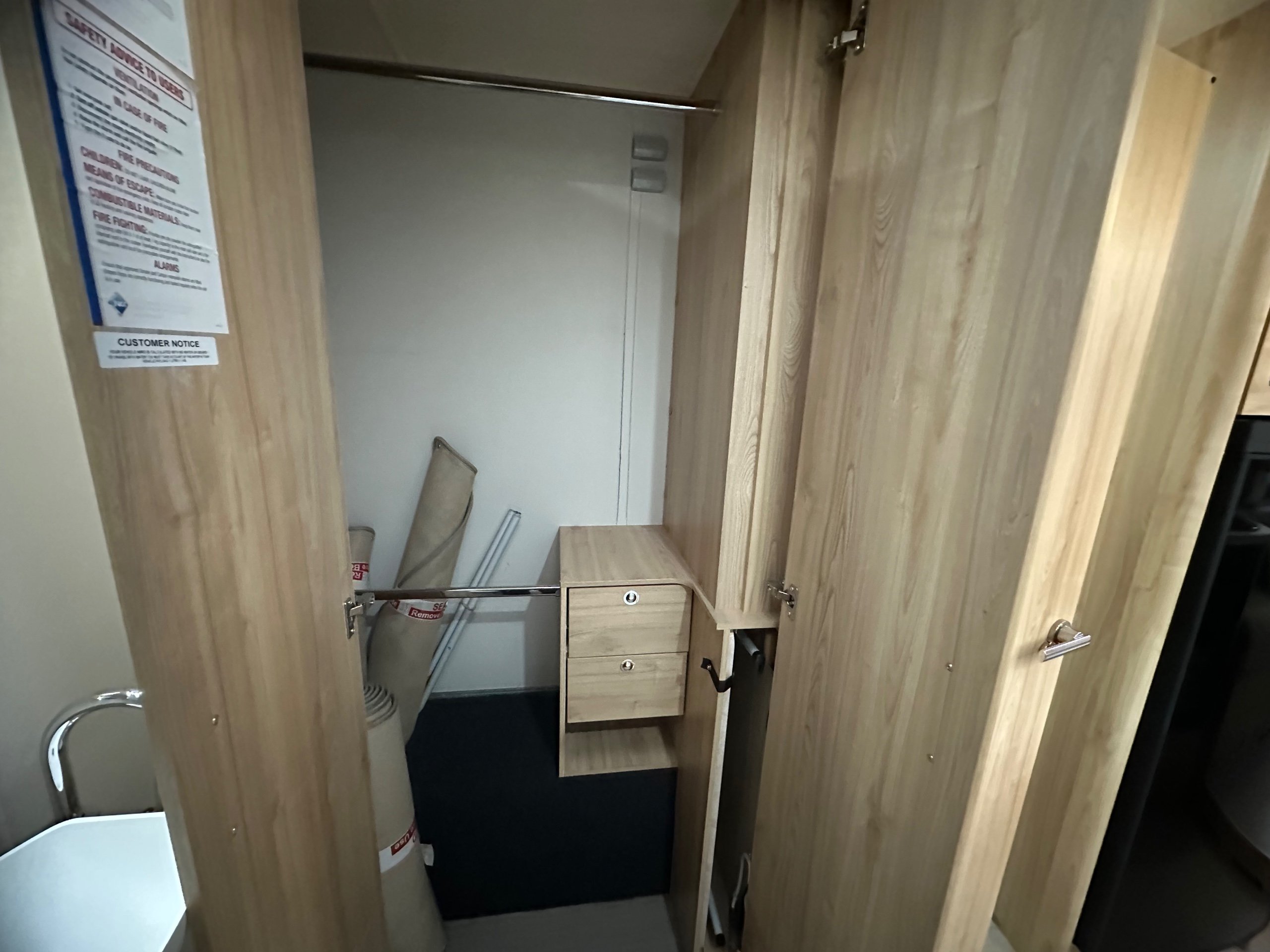 The layout of this motorhome is rear washroom which has a large separate shower the size you would expect to find in an ensuite at a hotel, separate hand basin, electric flushing toilet, vanity mirror, toilet roll holder, hand towel ring and the biggest spectacular of all a wardrobe larger than the one in my bedroom.