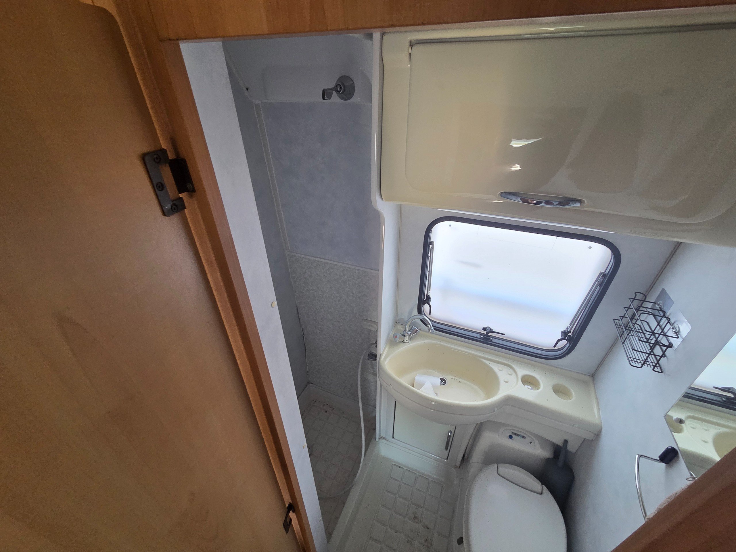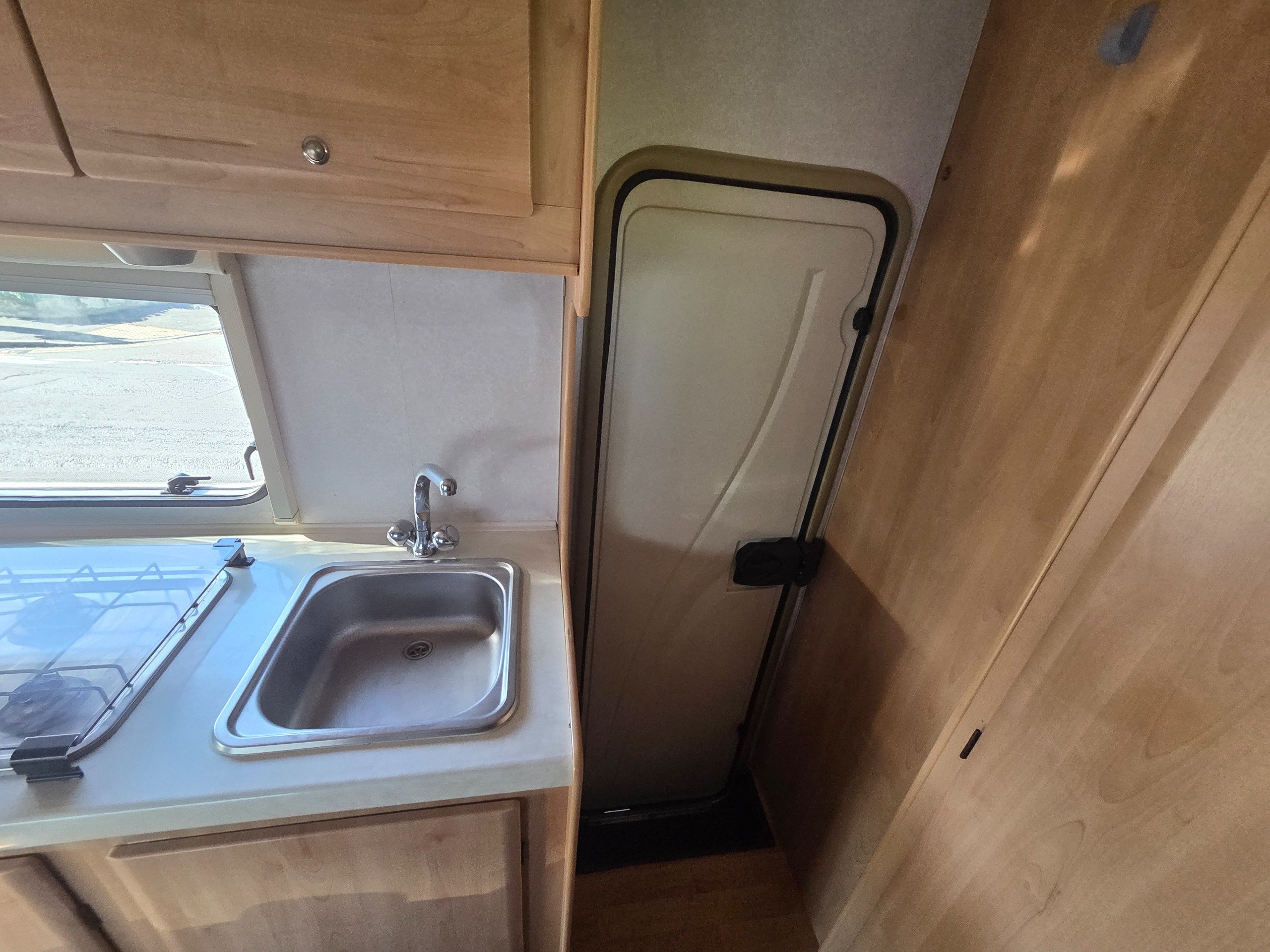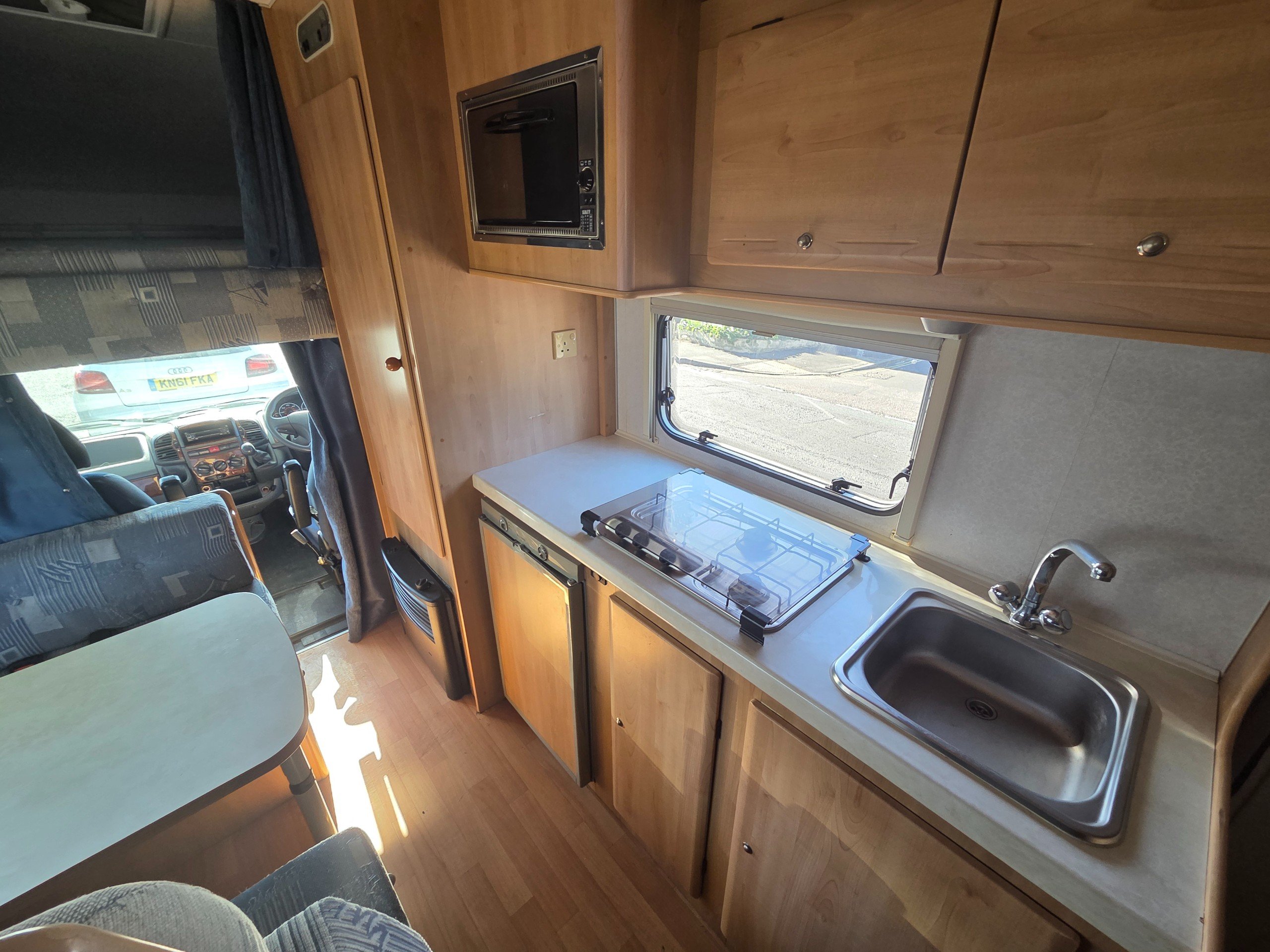 The rest of the nearside is all kitchen with an oven with built in grill, 3 burner gas hob, large sink, 3 way fridge with freezer compartment, plenty of groceries storage and a large wardrobe just the other side of the habitation door.