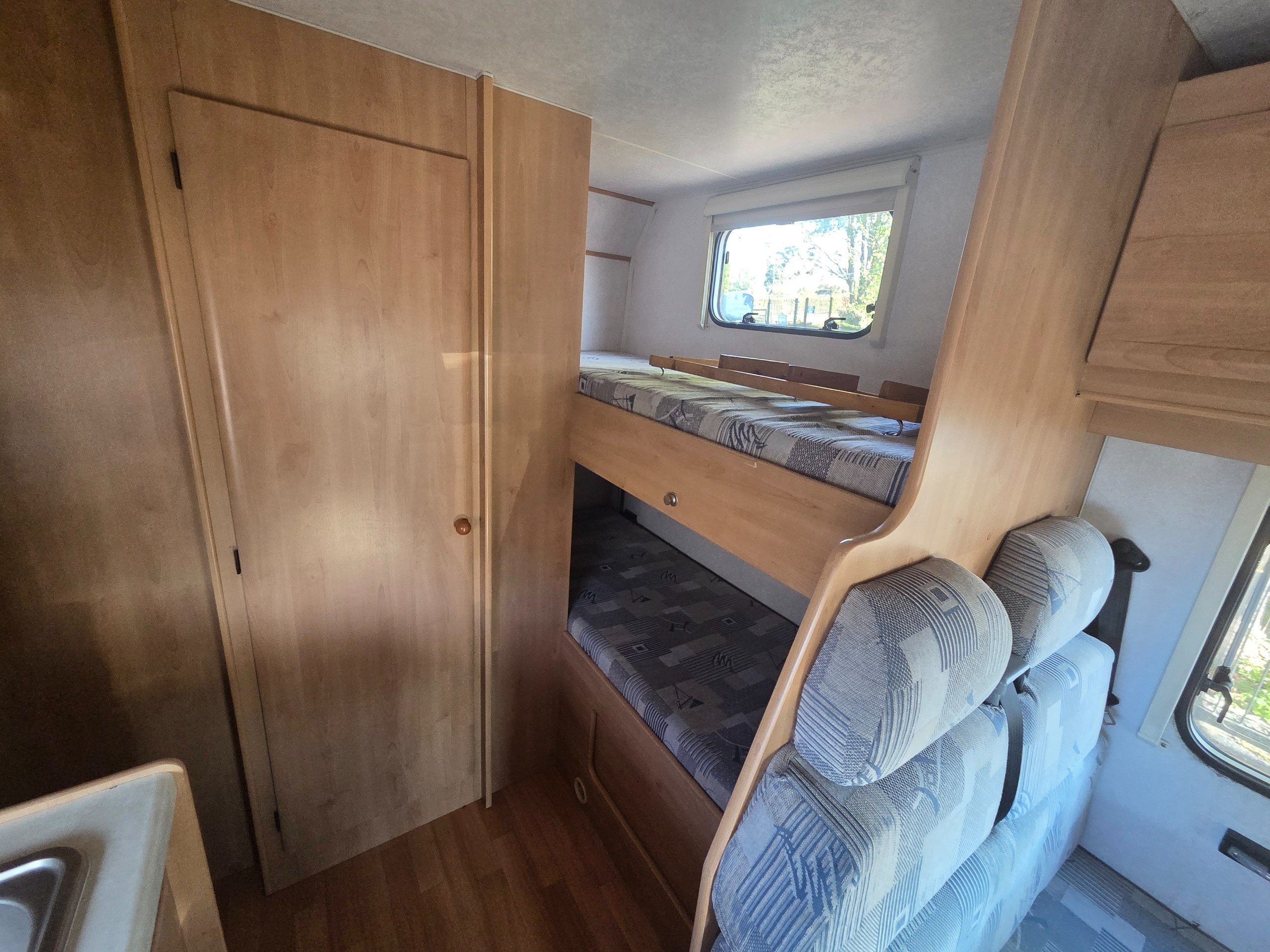 The rear washroom is to the offside and this has a separate shower, electric flushing toilet, hand basin built in cup holder, toiletries storage under the sink and overhead and vanity mirror too so a really good size.The bunks are to the near side and the bottom bunk could be used for storage if not in use. both would fit an adults in but also great for the kids to have there own little hide away in the evening.