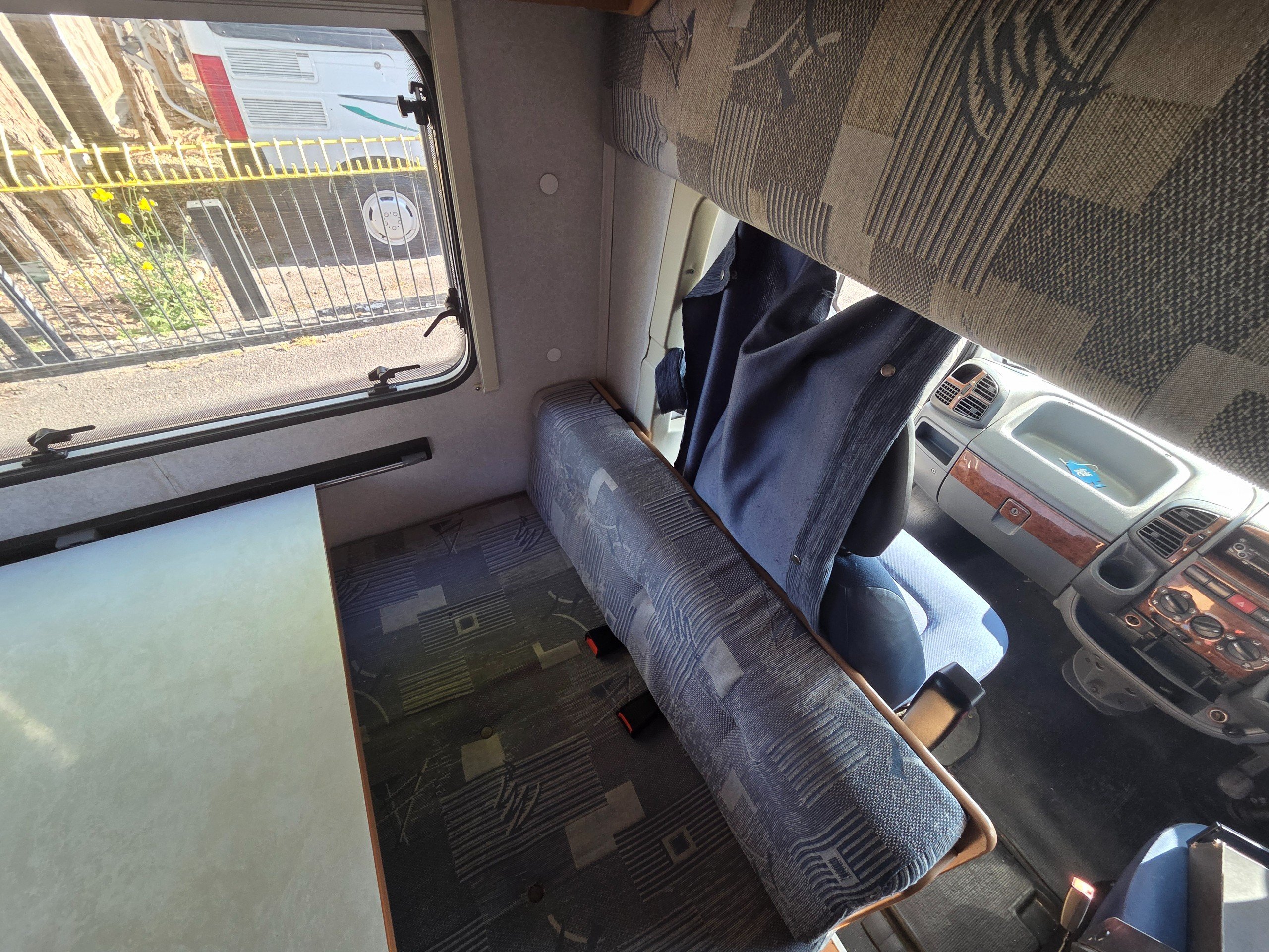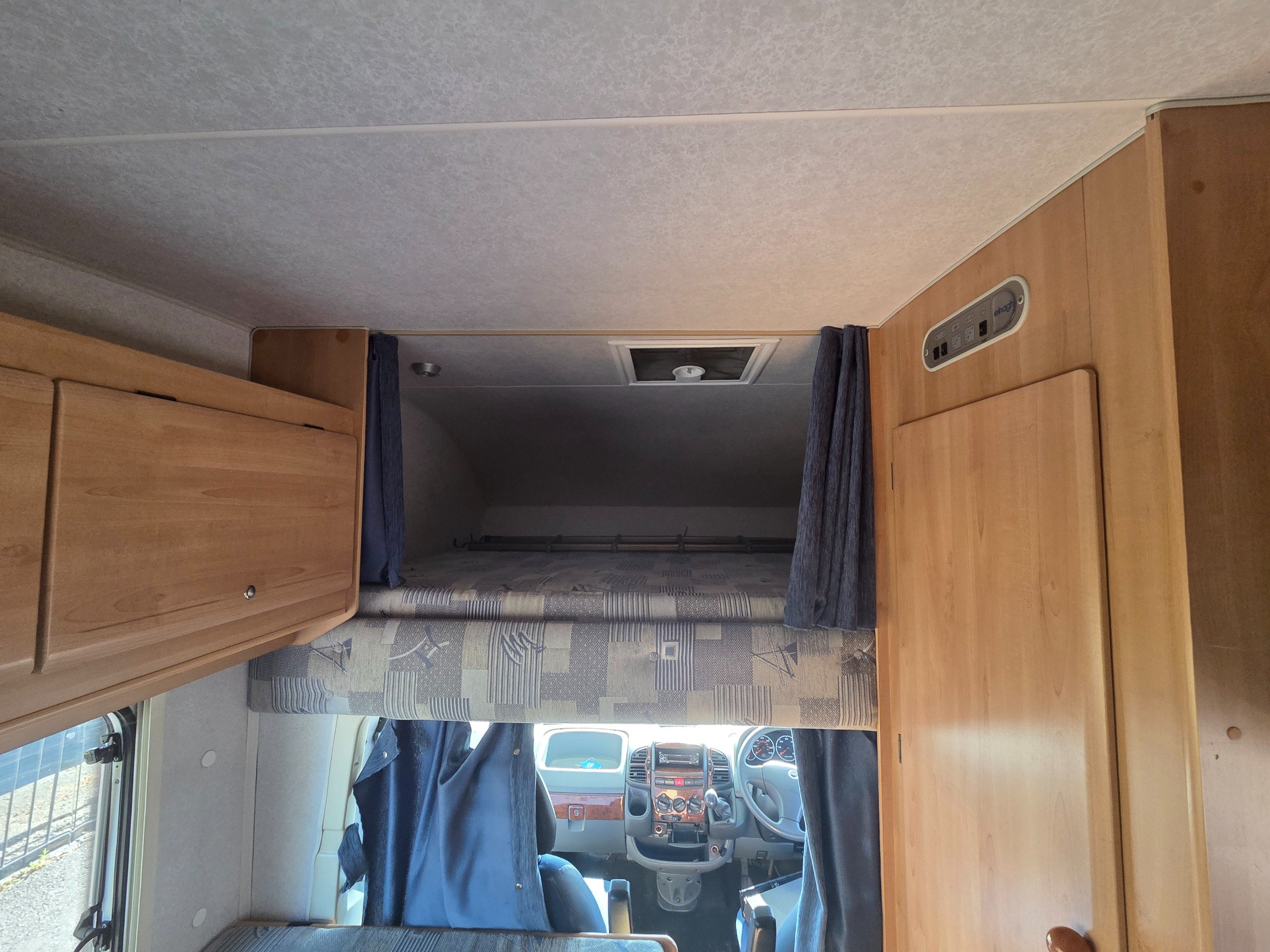 Centrally is a dinnette which makes into a double bed and houses extra travelling seat belts. The cab its self isnt used in this layout so has curtains to close it off and then up over the cab is another double bed making the 5th and 6th berth.