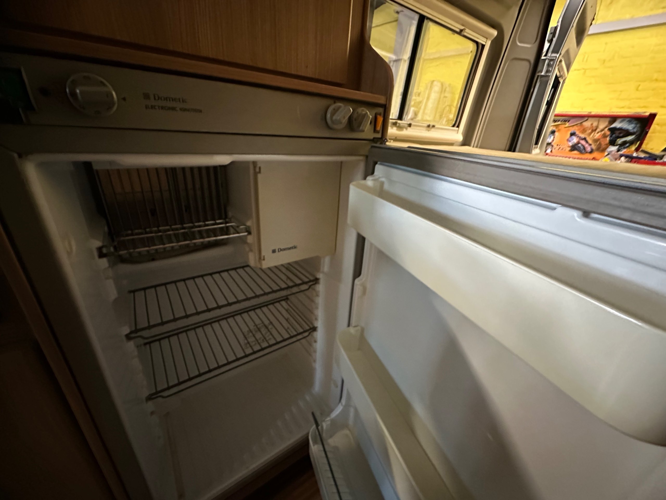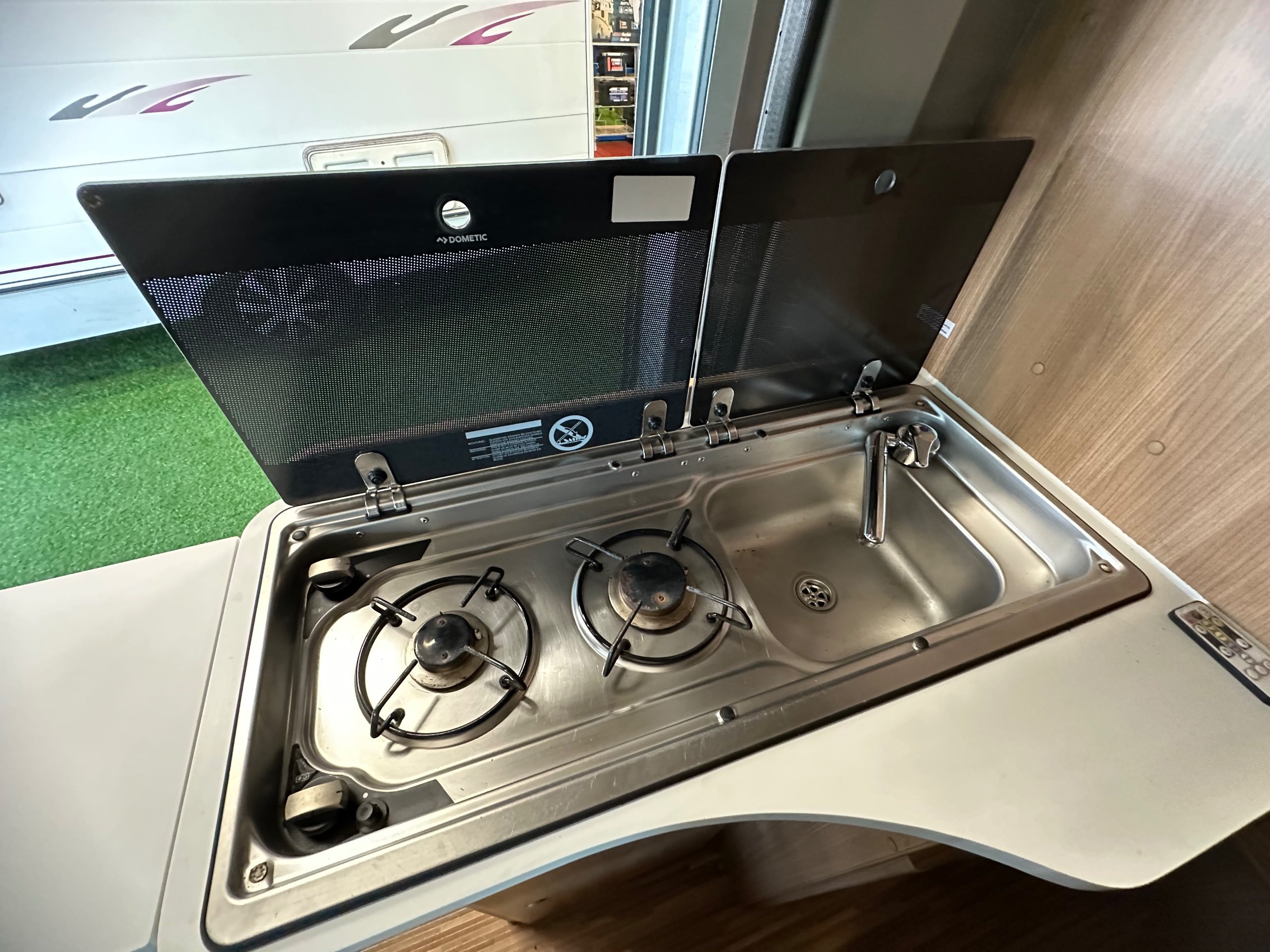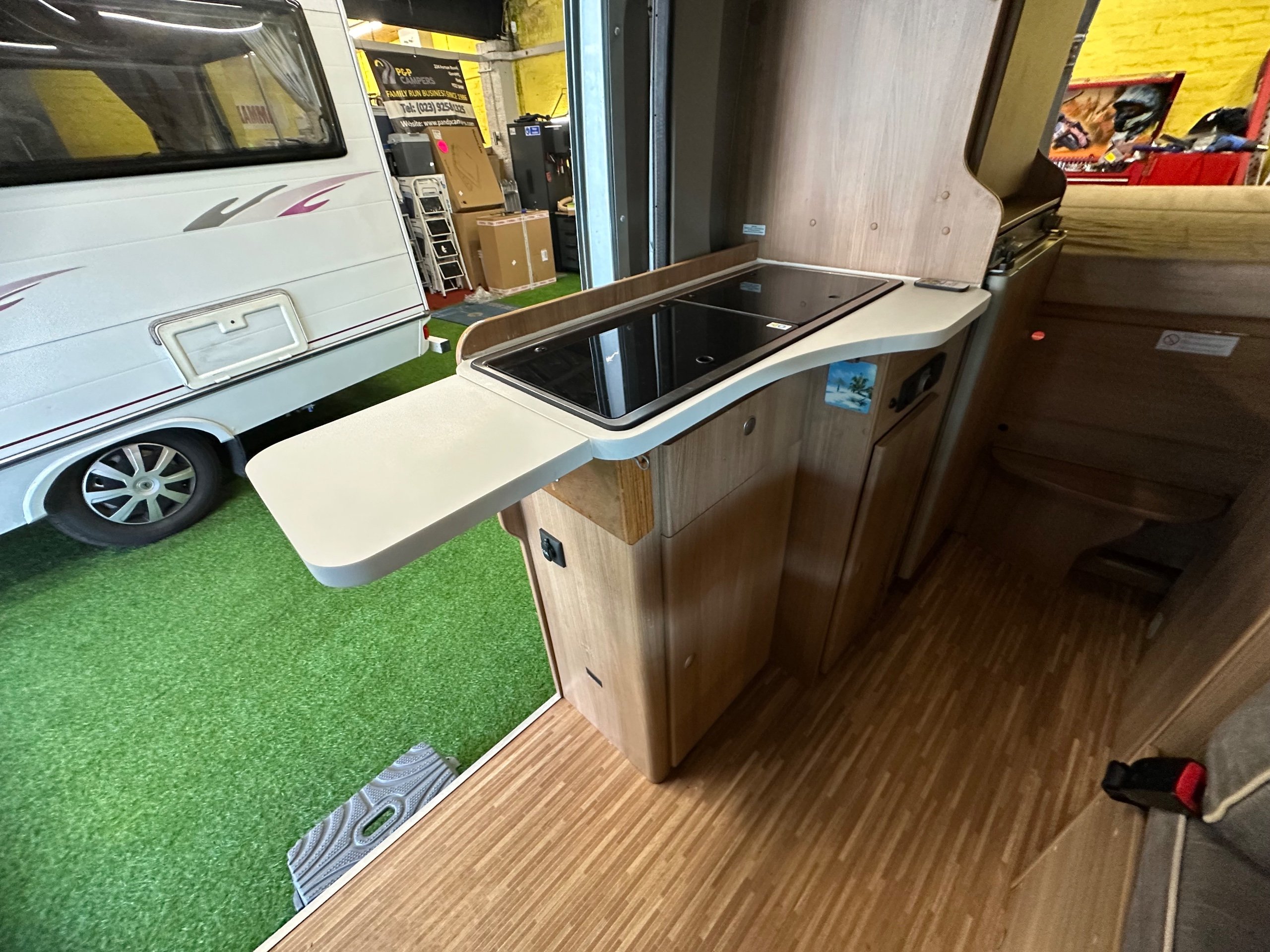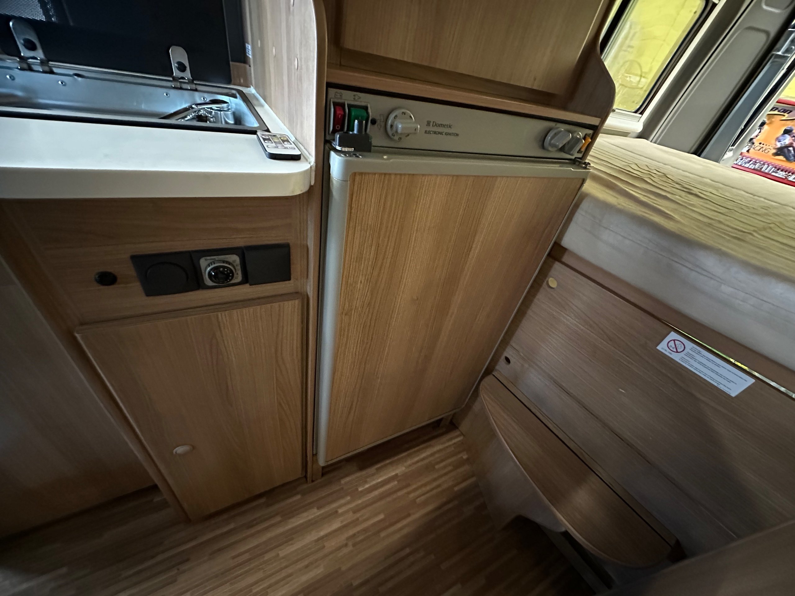 To the offside is the wardrobe below with the 3 way fridge over this has a built in freezer compartment. Moving forward is the kitchen this has a 2 burner gas hob with glass lid, sink with glass lid, Combi boiler which operates via gas and electric and storage for the groceries, cutlery and pots and pans.