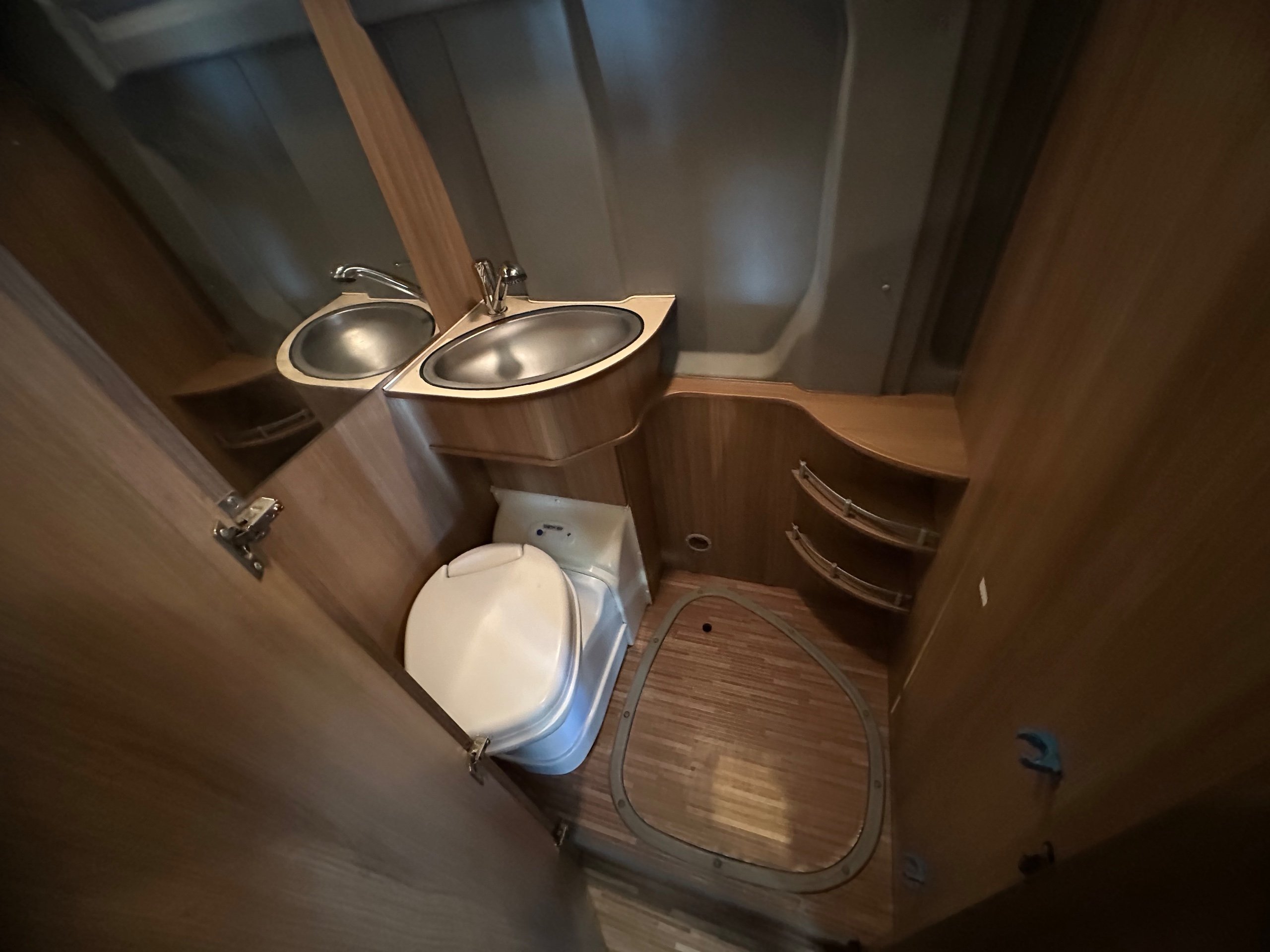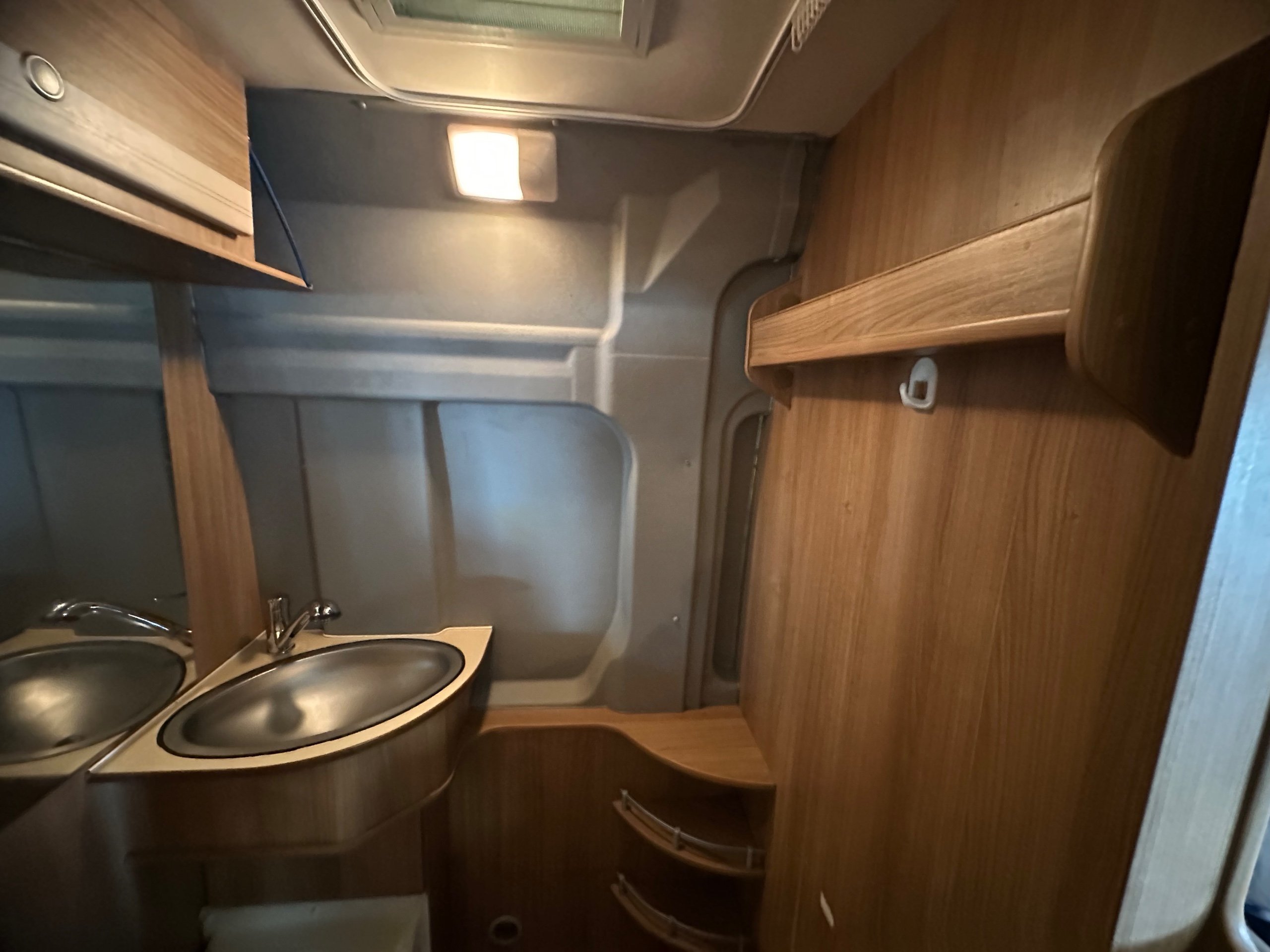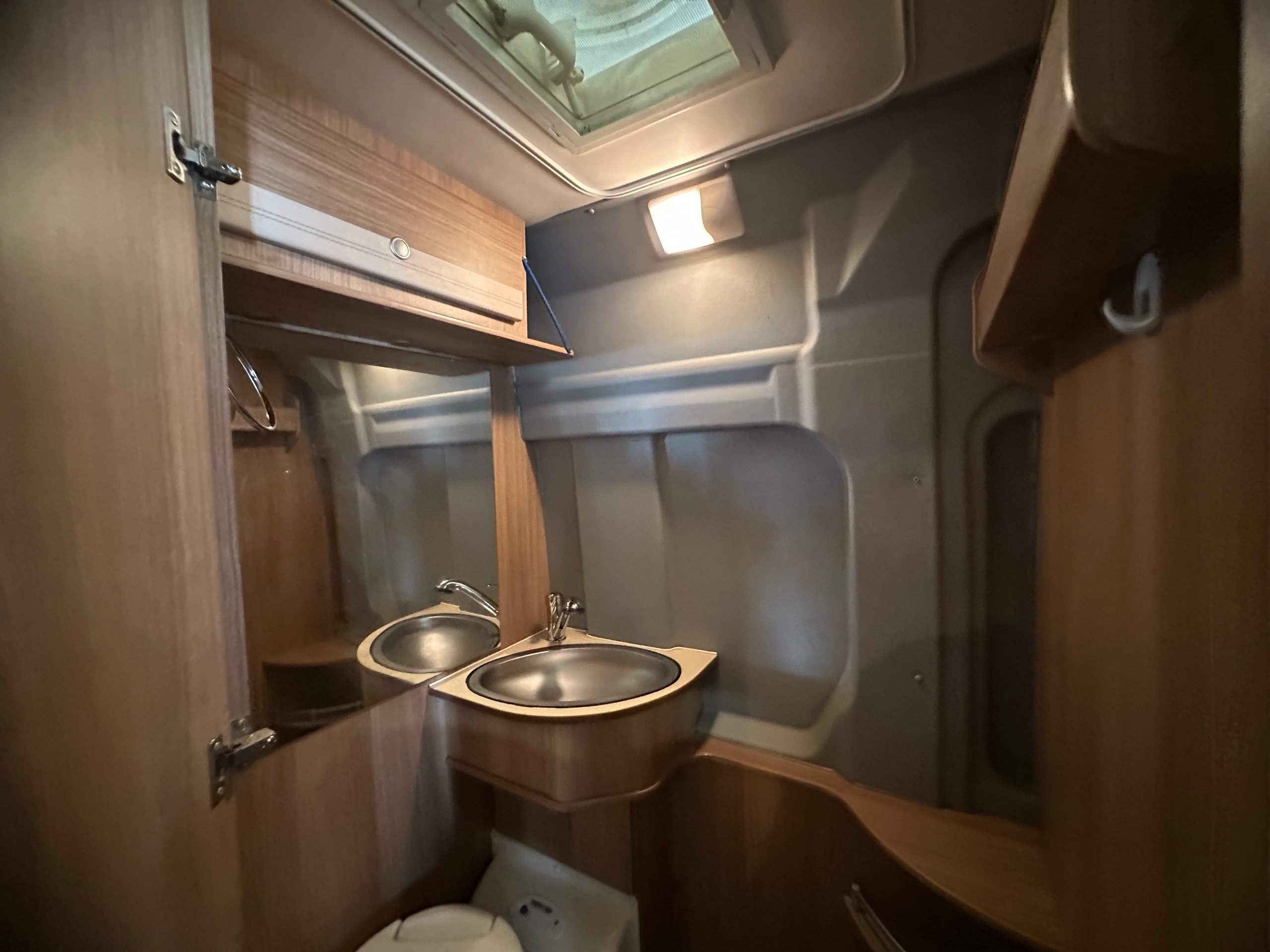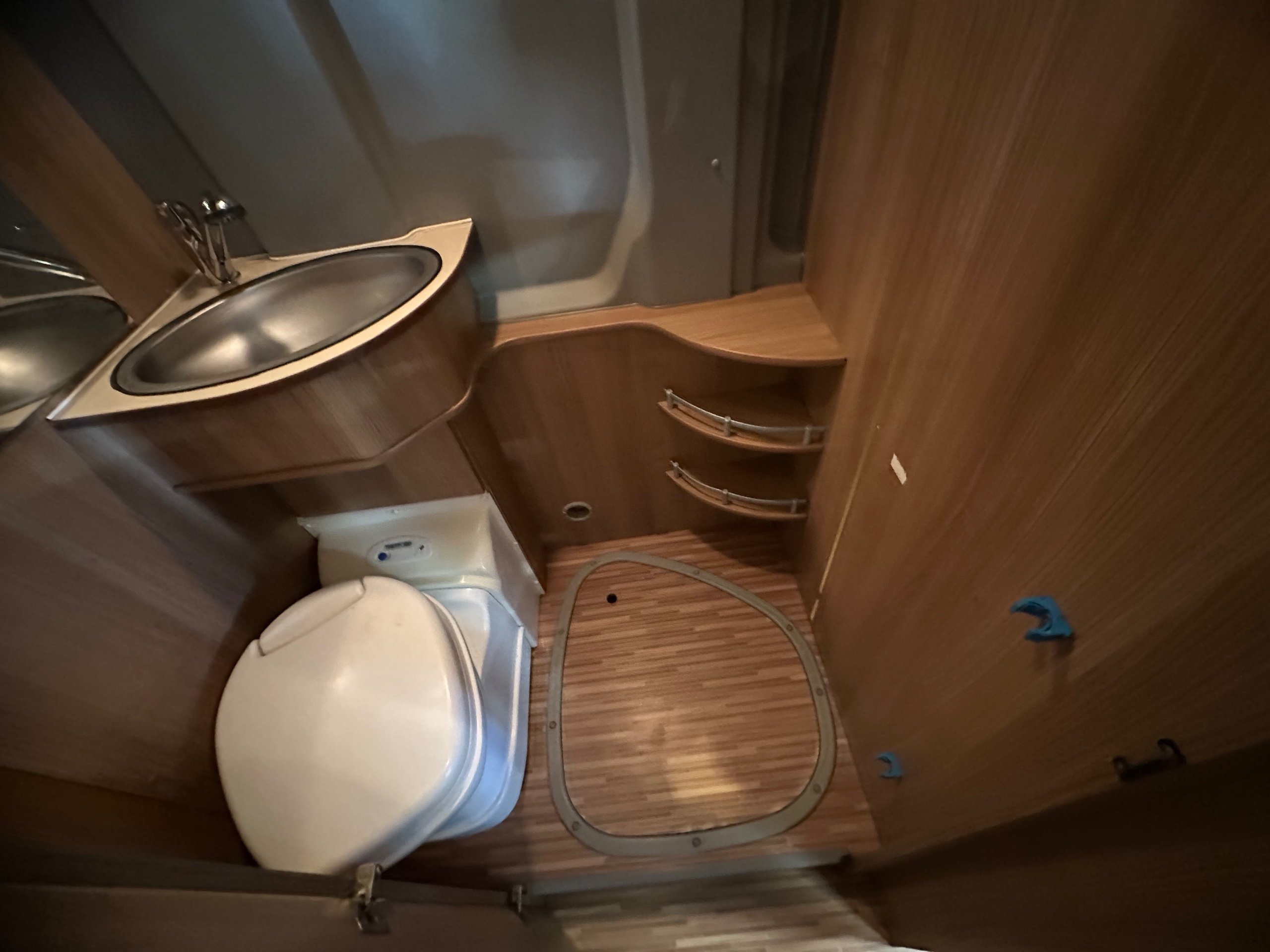 Centrally is the washroom this has built in shower tray which you remove a section of the floor as pictured to use. There is wrap around curtain so you don't get the toilet wet, electric flushing toilet, hand basin which has the integrated shower head along with storage for the toiletries.