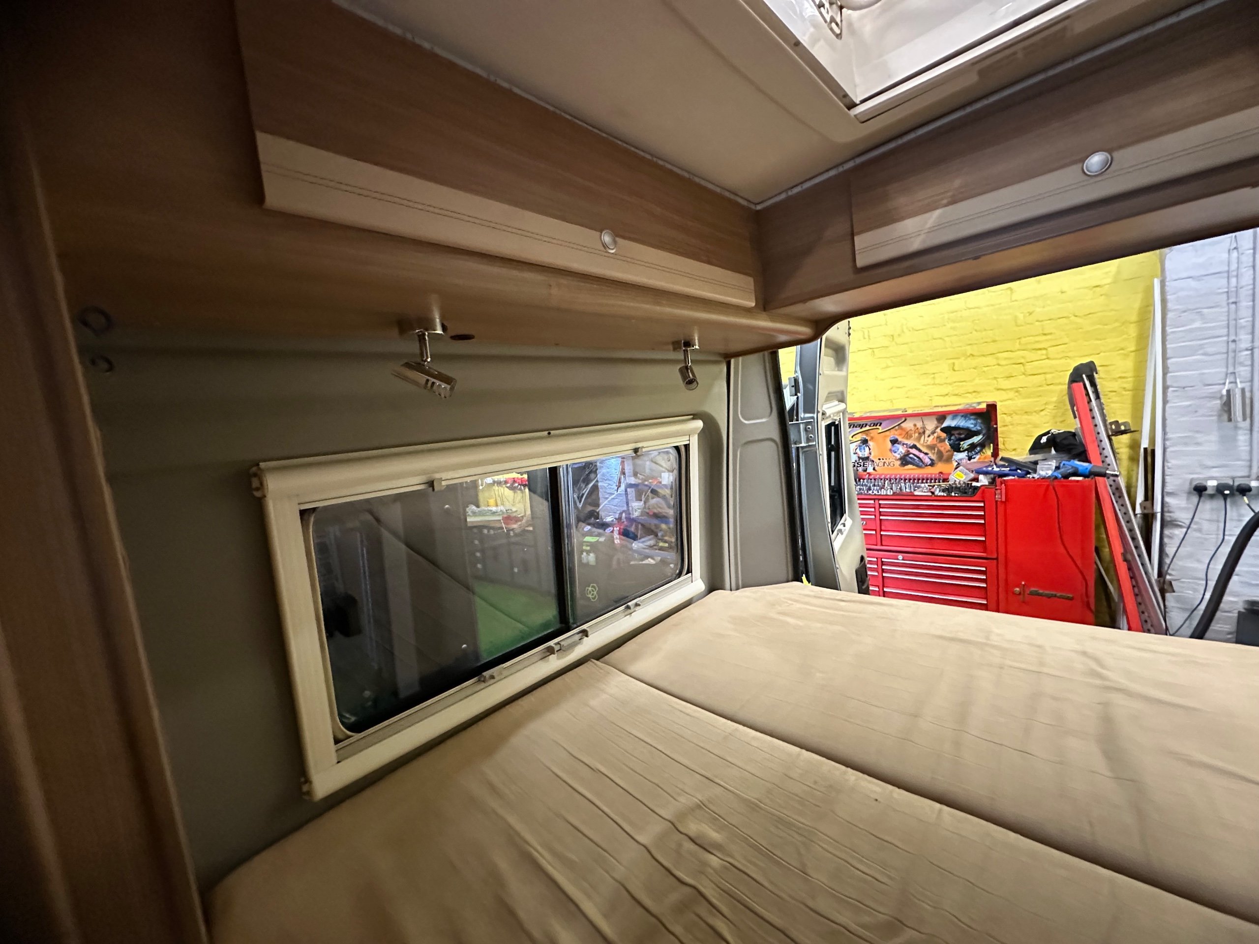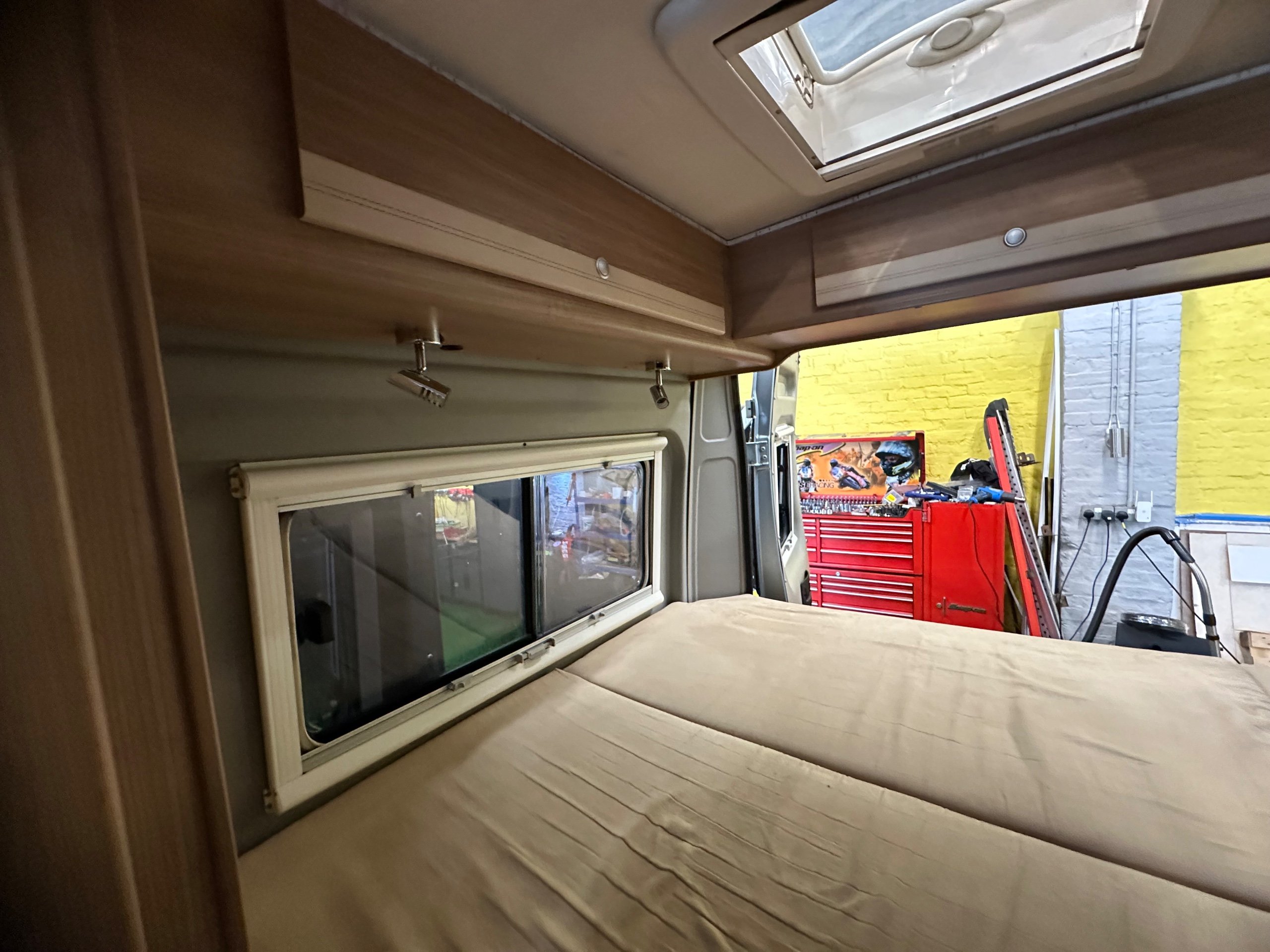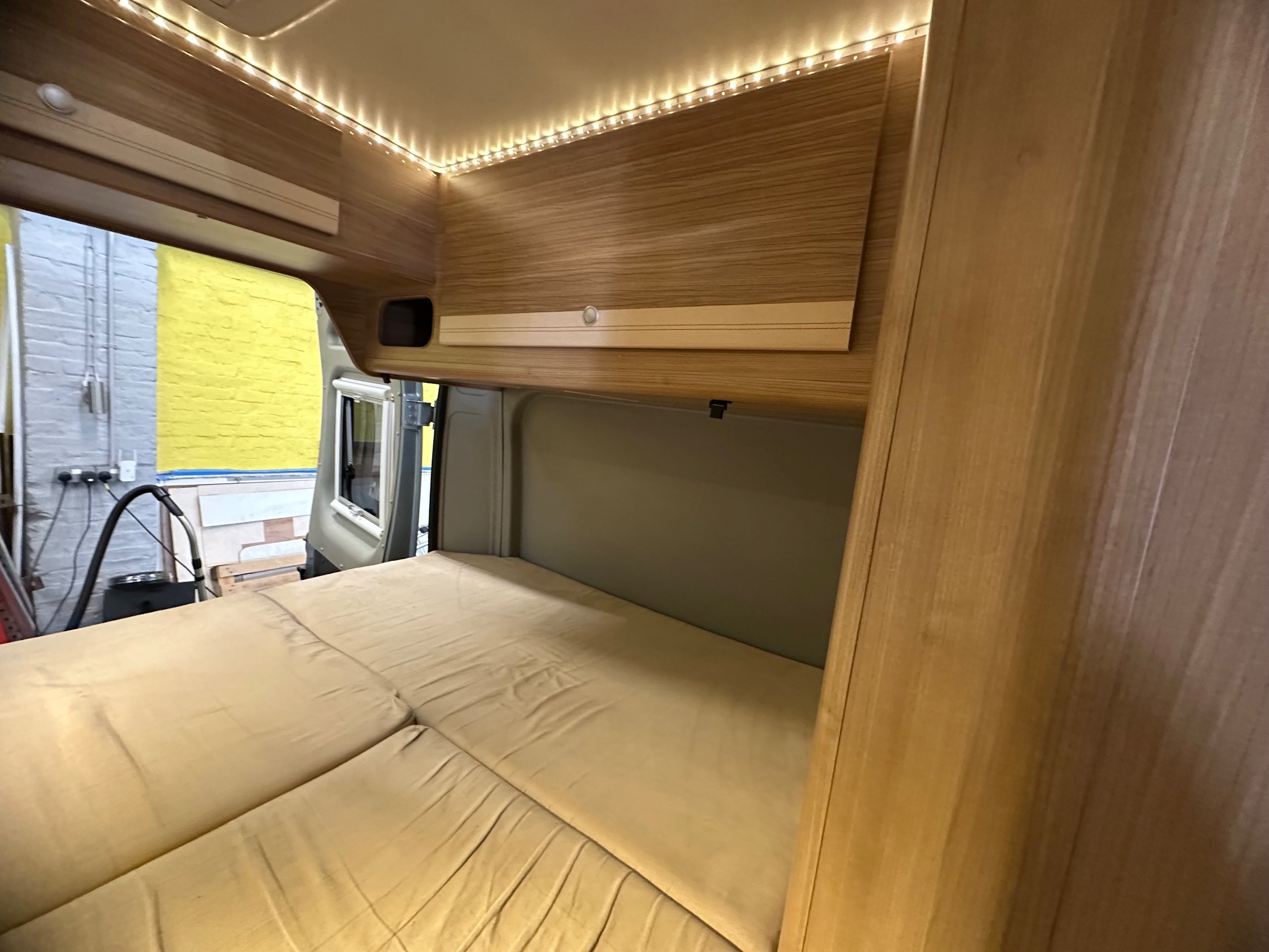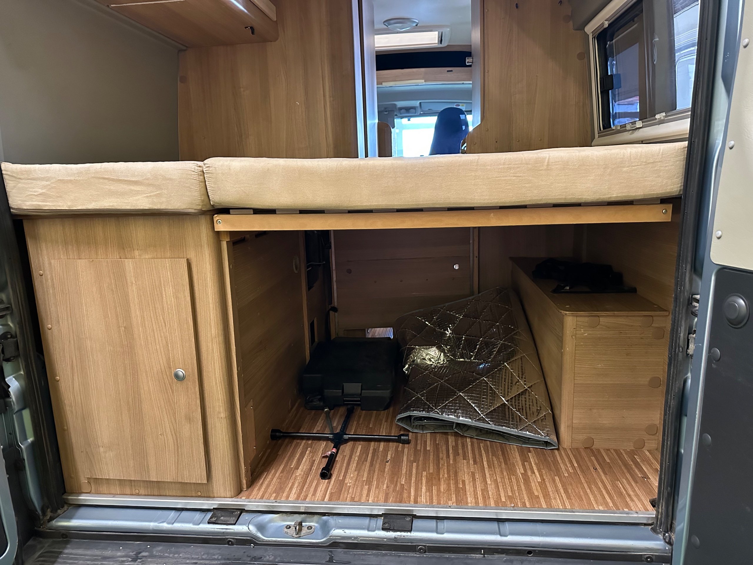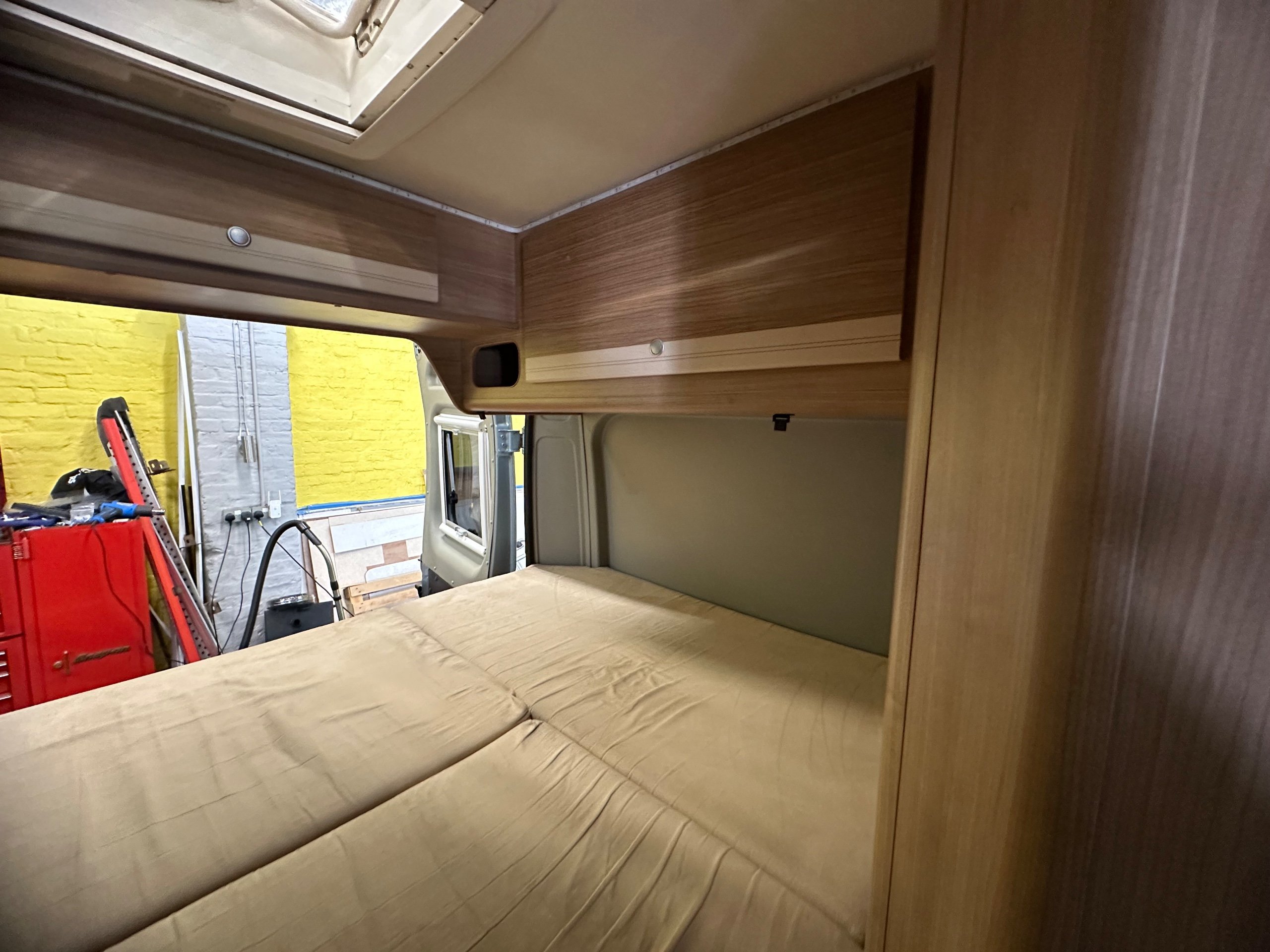 The layout of this motorhome is rear transverse bed. which is a double bed. Being of a mid height and accessed via a step enables the motorhome to have a good size garage underneath which has access via the rear barn doors. The gas locker is in the garage to the nearside which is again a good size and will comfortably fit 2x 13kg Calor bottles in. There is ample garage space for the Brompton's and outdoor chairs etc. There are over head lockers in the bedroom area for storage of books and a space for the TV along with storage pockets dotted about too.