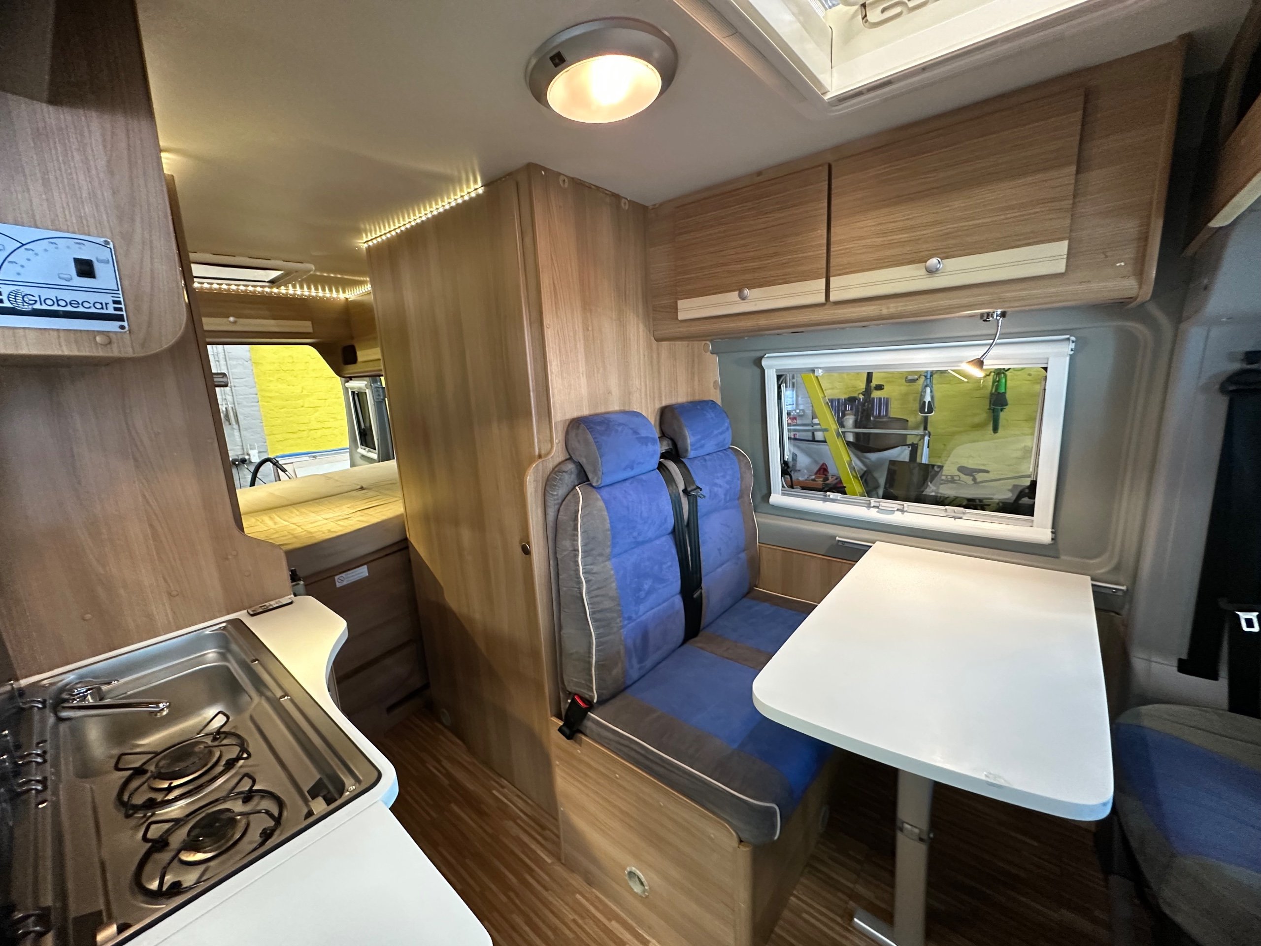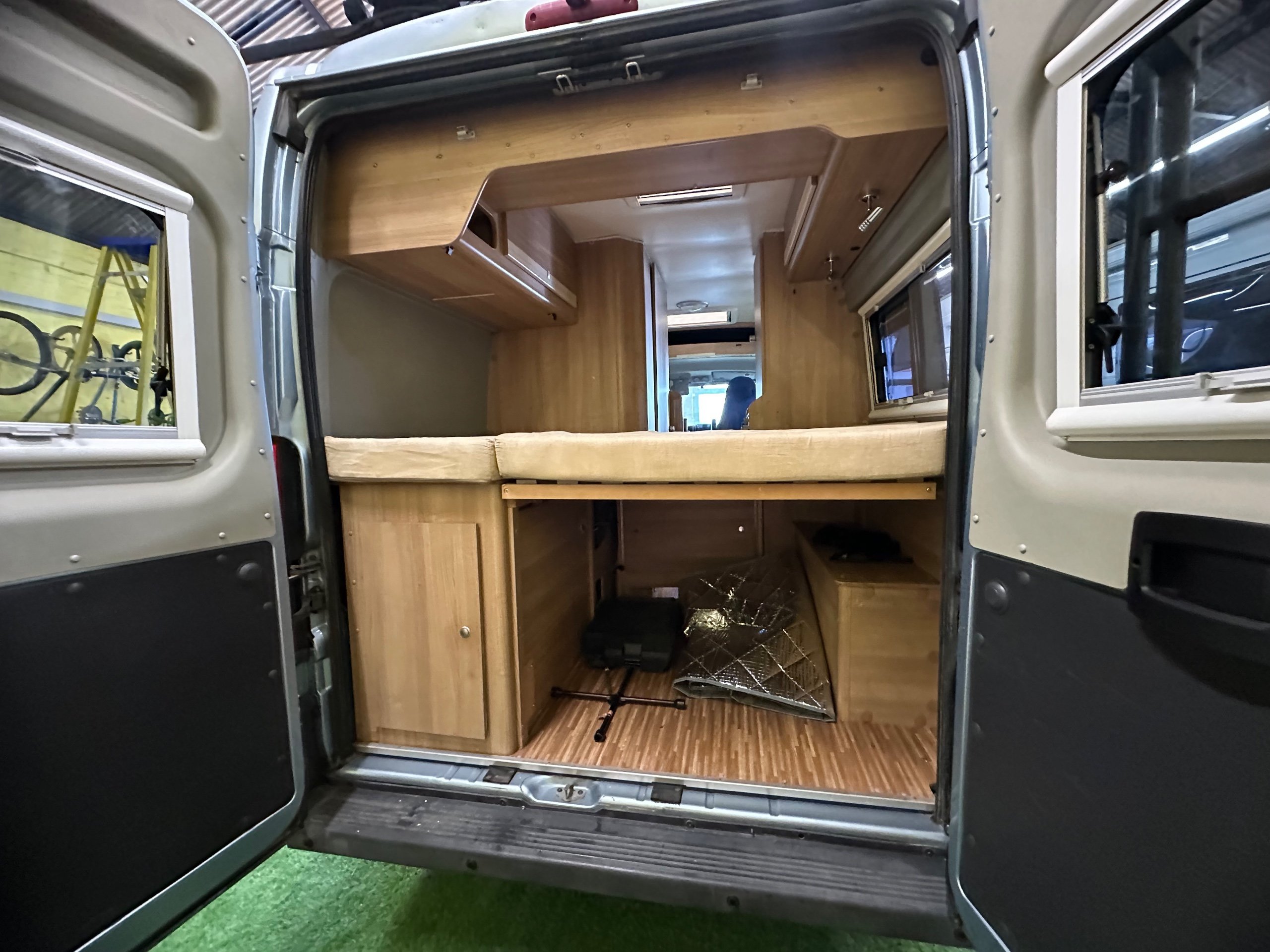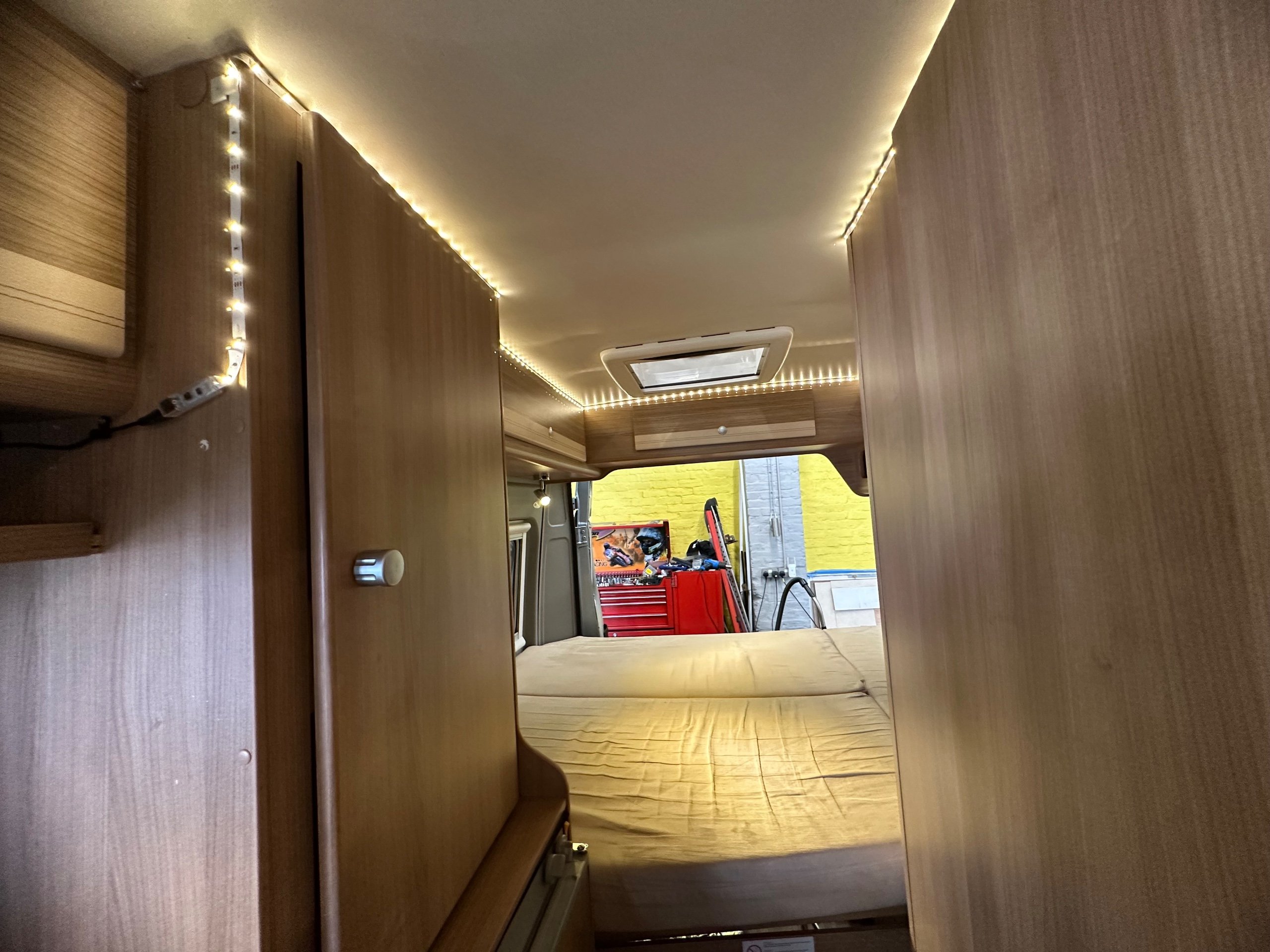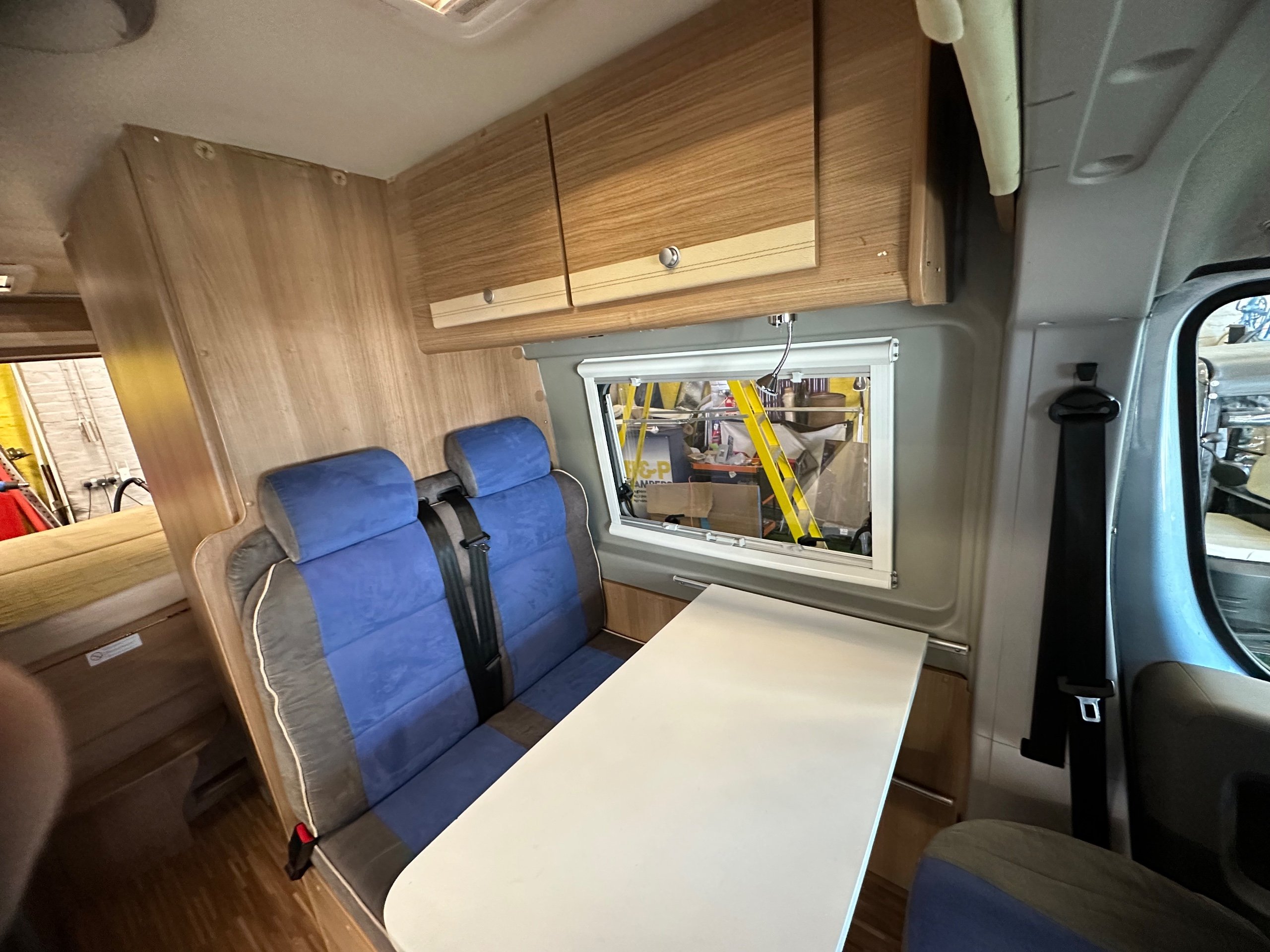 The layout of this motorhome is rear transverse bed. which is a double bed. Being of a mid height and accessed via a step enables the motorhome to have a good size garage underneath which has access via the rear barn doors. The gas locker is in the garage to the nearside which is again a good size and will comfortably fit 2x 13kg Calor bottles in. There is ample garage space for the Brompton's and outdoor chairs etc. There are over head lockers in the bedroom area for storage of books and a space for the TV along with storage pockets dotted about too.