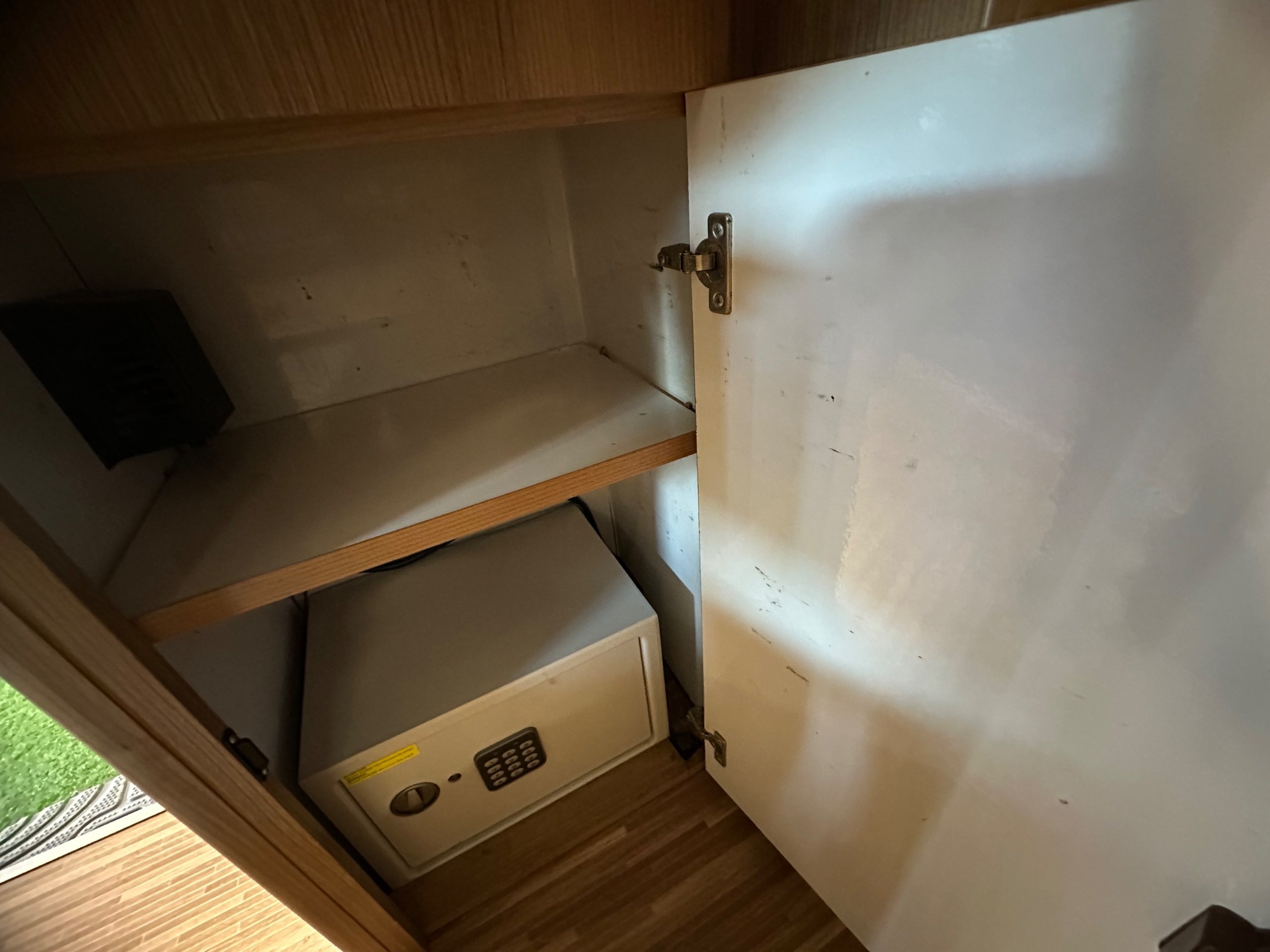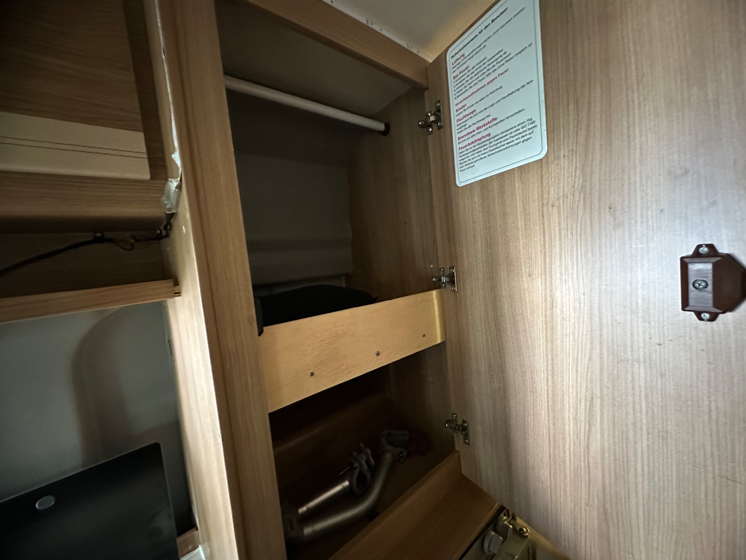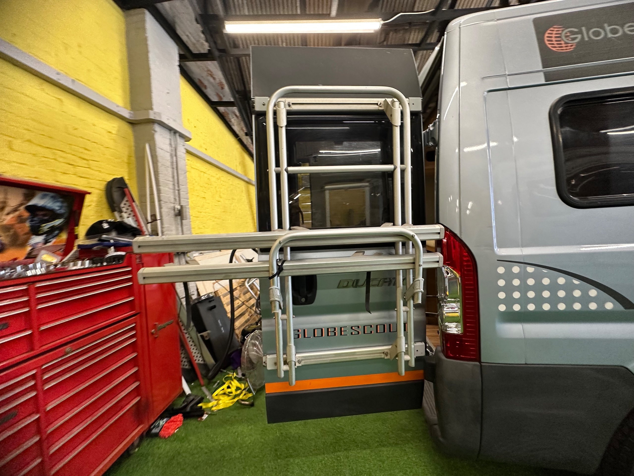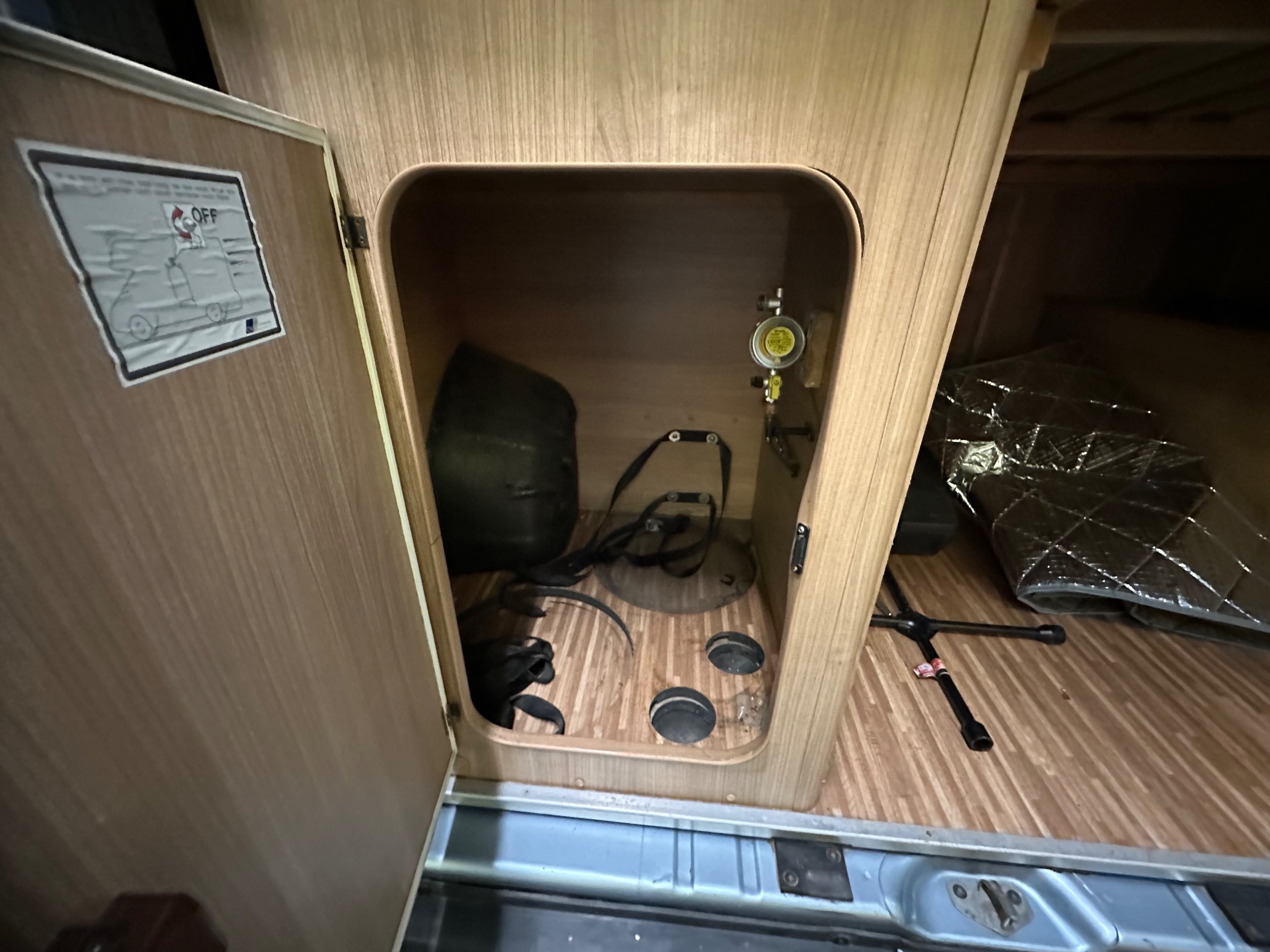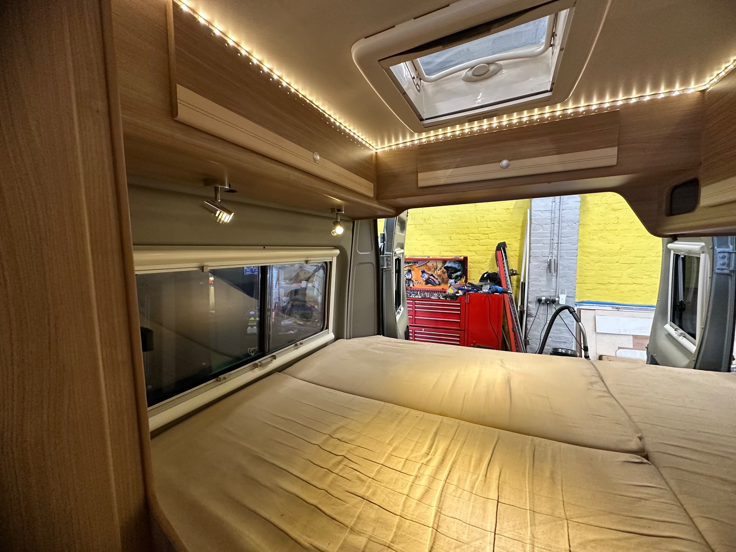 The layout of this motorhome is rear transverse bed. which is a double bed. Being of a mid height and accessed via a step enables the motorhome to have a good size garage underneath which has access via the rear barn doors. The gas locker is in the garage to the nearside which is again a good size and will comfortably fit 2x 13kg Calor bottles in. There is ample garage space for the Brompton's and outdoor chairs etc. There are over head lockers in the bedroom area for storage of books and a space for the TV along with storage pockets dotted about too.