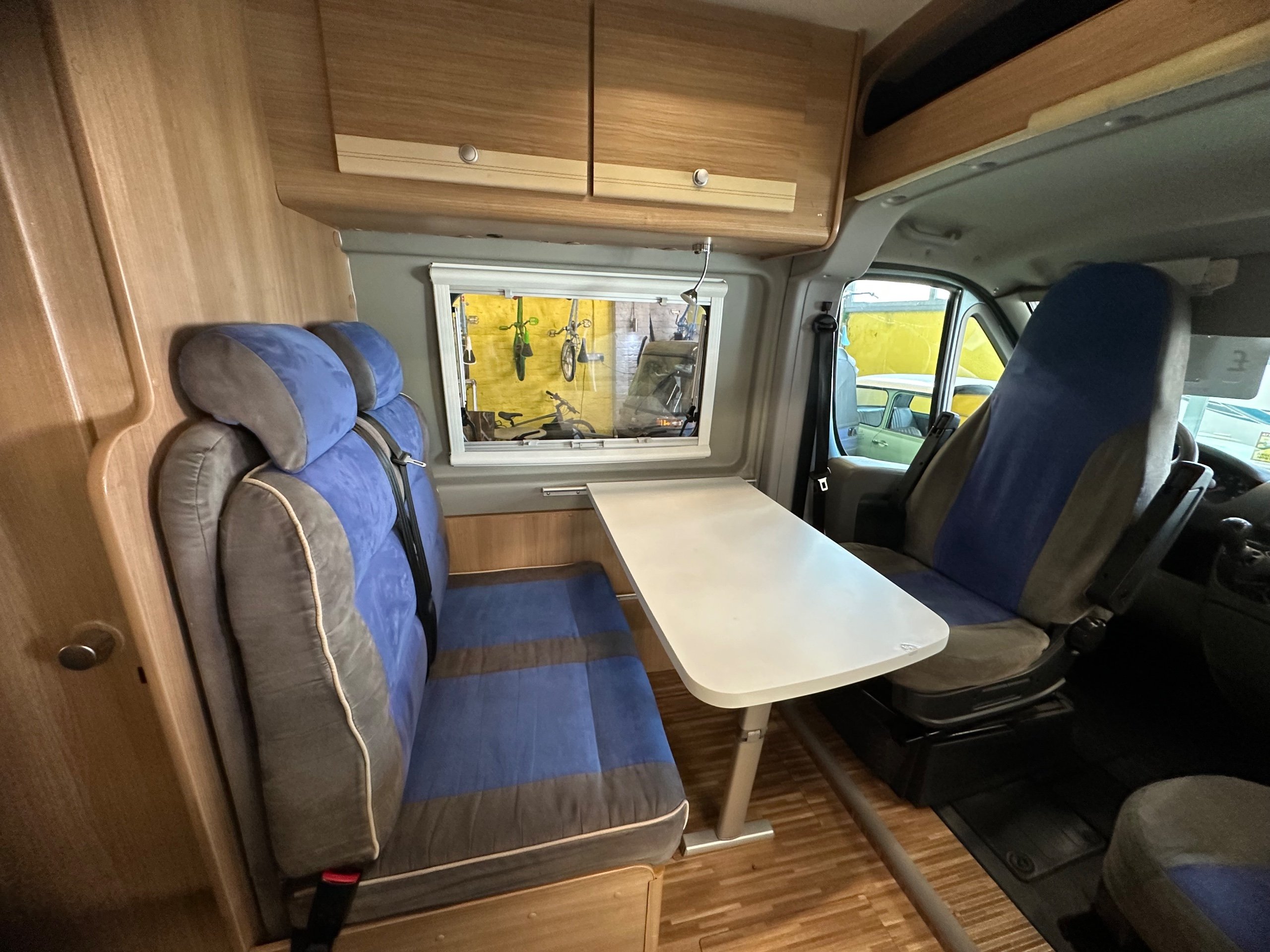 The dinette to the front houses 2 extra travelling seat belts these are both 3 point belts great for the grandkids or other guests on day trips. You can comfortably have 4 guest around the table for dinner with both front travelling seats swiveled around. The sliding door has a wide electric step.