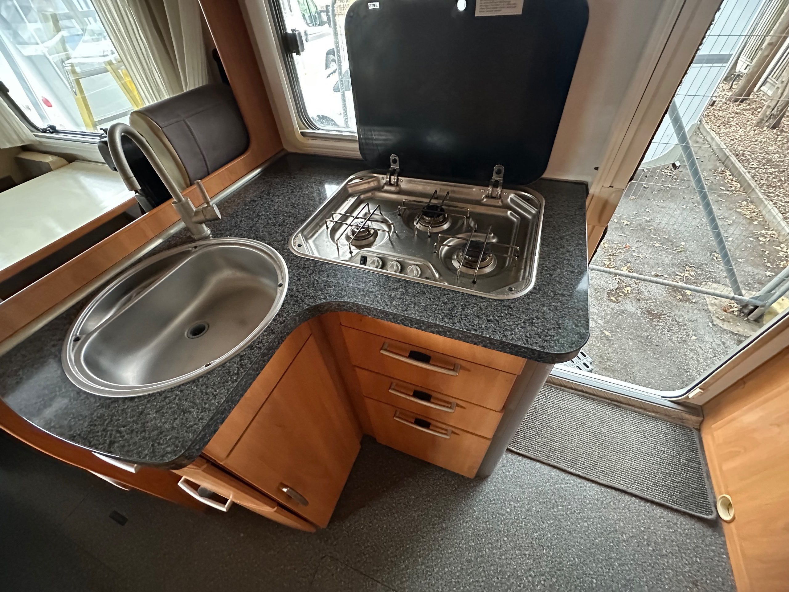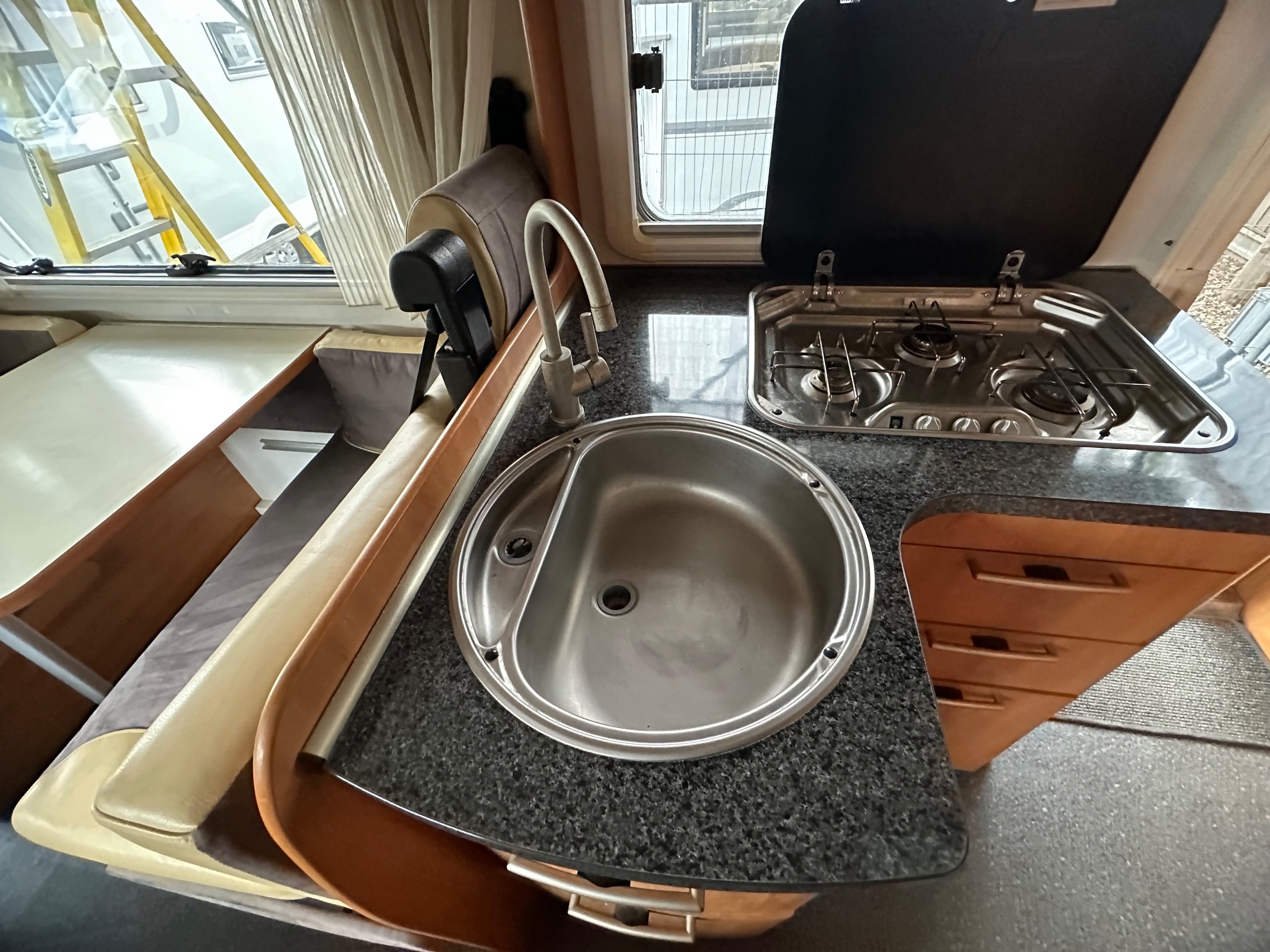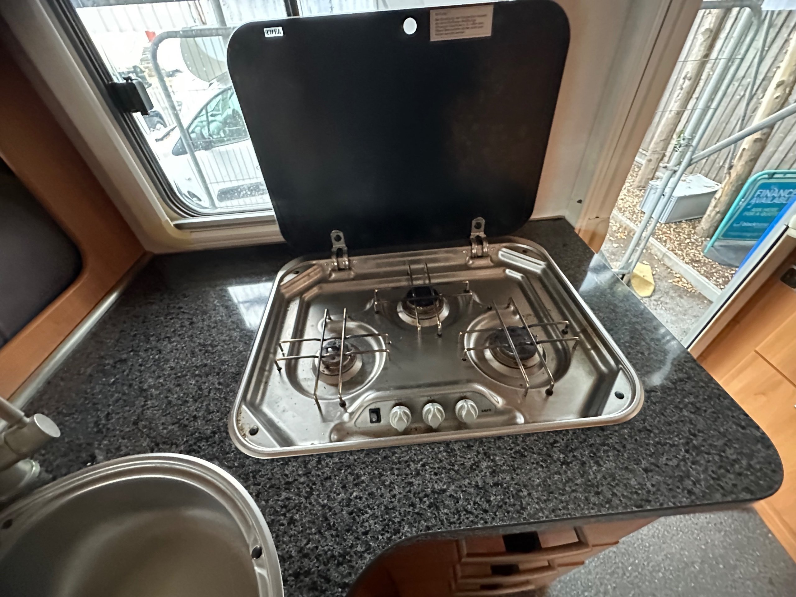 Onto the kitchen this a large 3 way fridge with separate freezer compartment, good sized oven, 3 burner gas hob, large bowl sink as well as plenty of storage for the groceries.