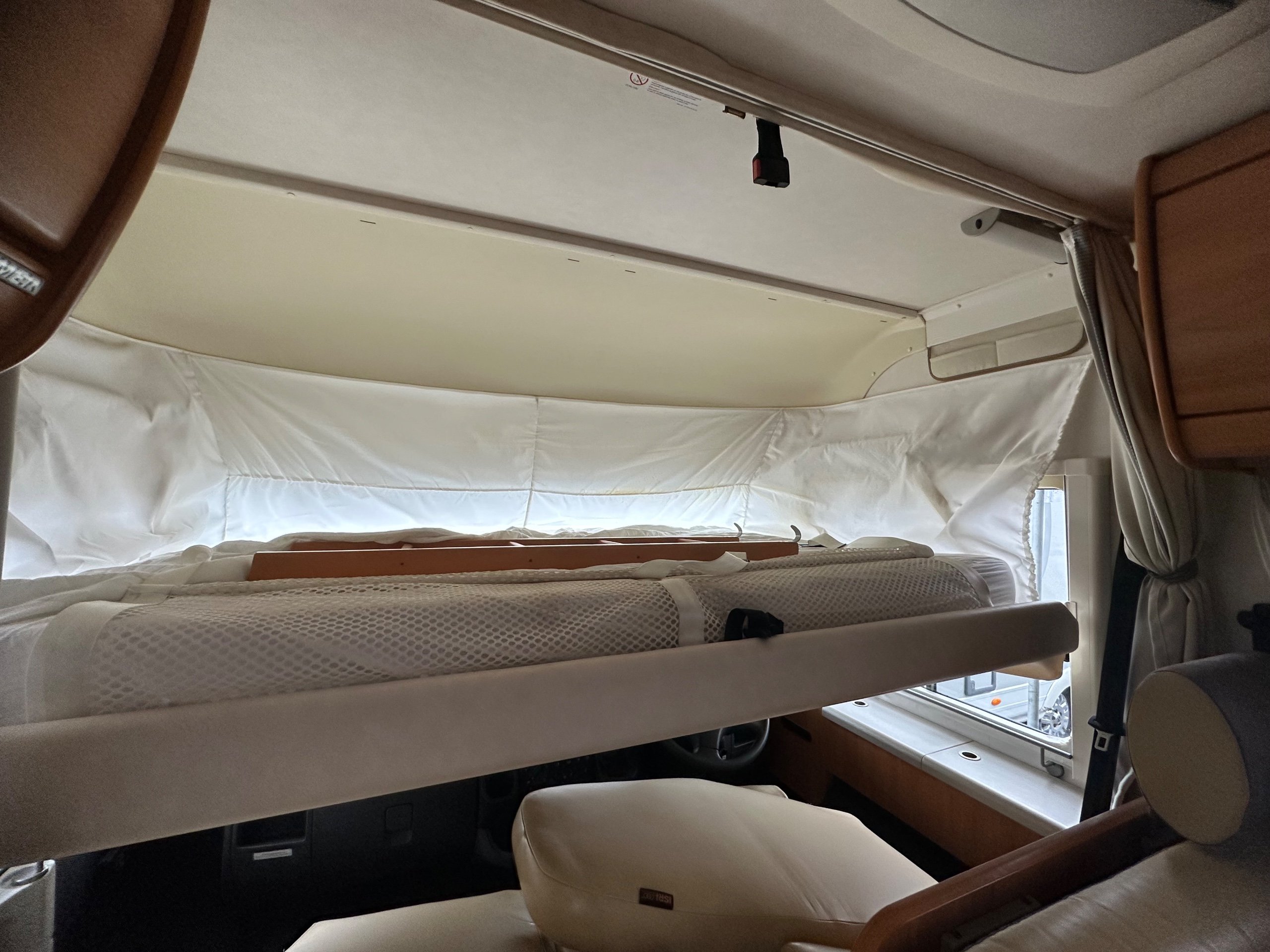 Centrally is the lounge this is a great social family size and I see many memories being made here. The lounge is made up of a long single side settee that can be made into a single bed, a dinnetee which has 4 extra travelling seat belts 3 of which are 3 point belts. The dinnette can be made into a double bed. Both cab sweat swivel around and over the cab is the bed the A-classes are famous for the drop the down that comes down to a height that much easier to get in and out of and has you could sit up in bed and have a cup of tea. These A class beds are much bigger the standard doubles too .