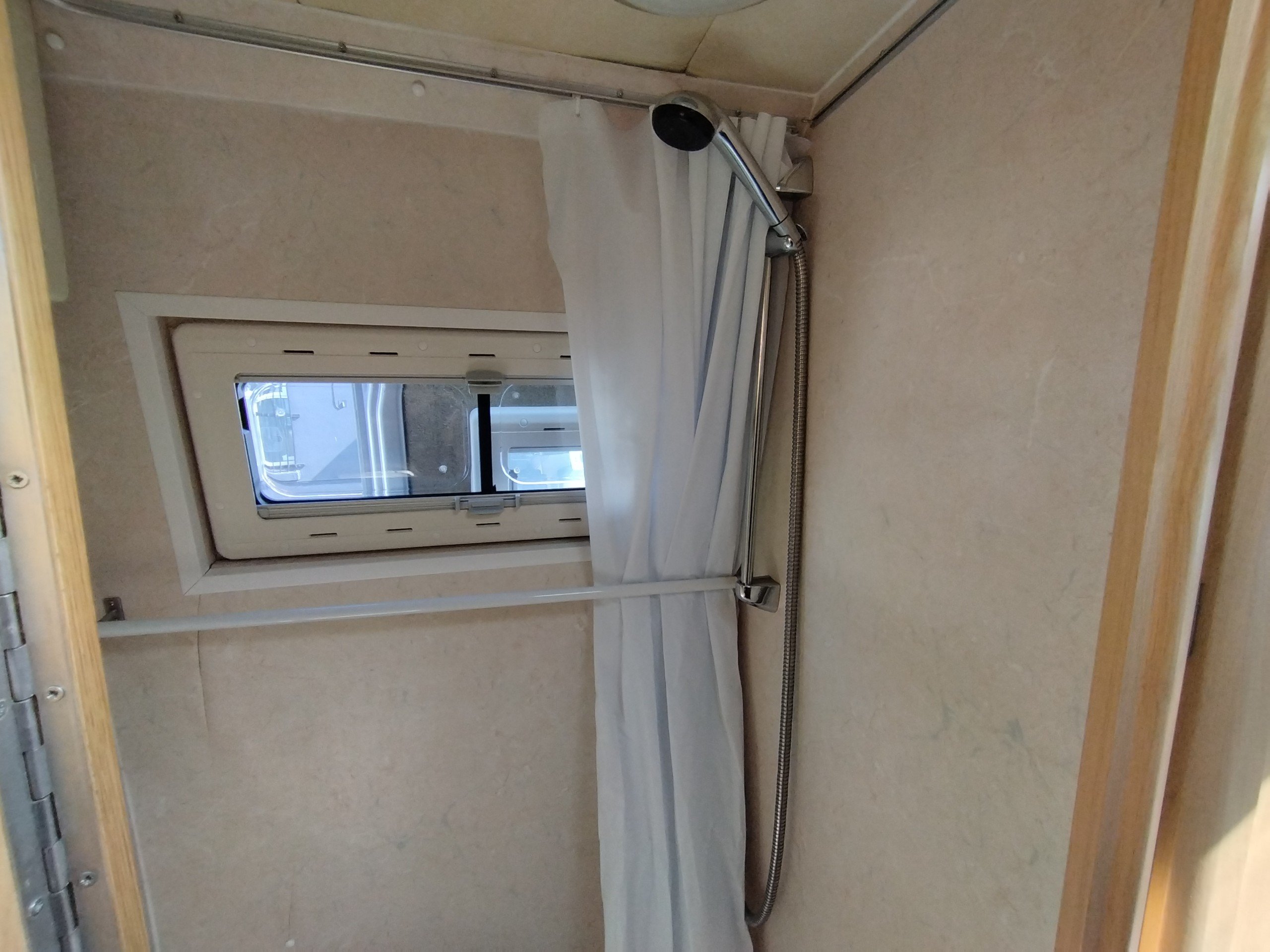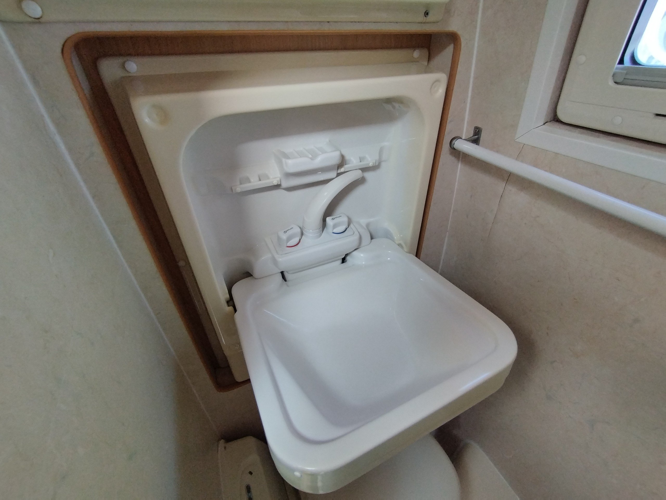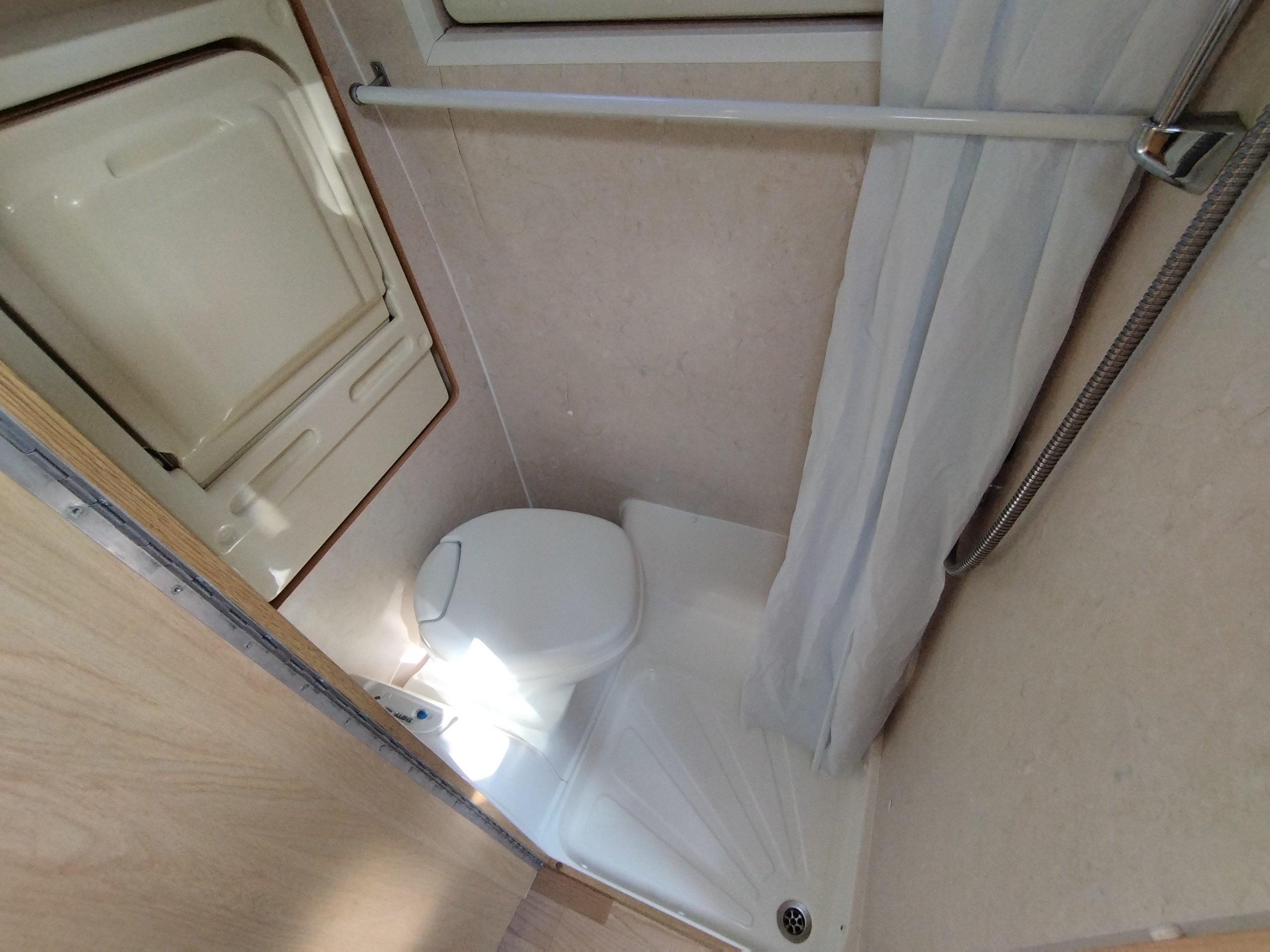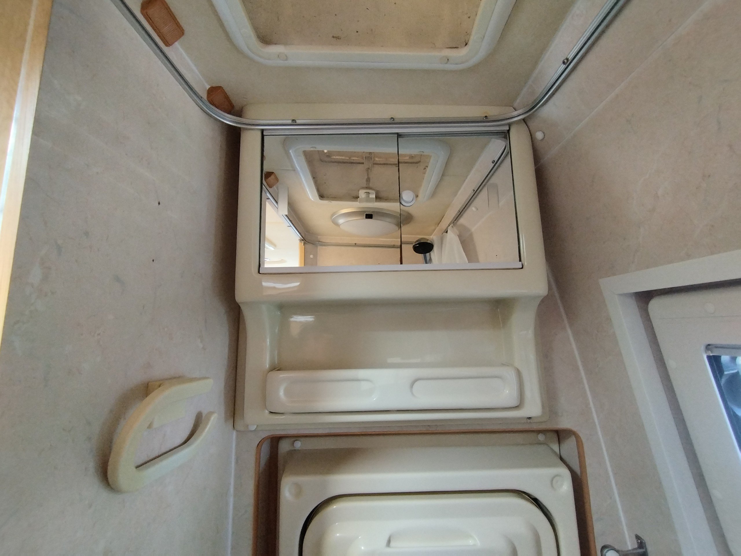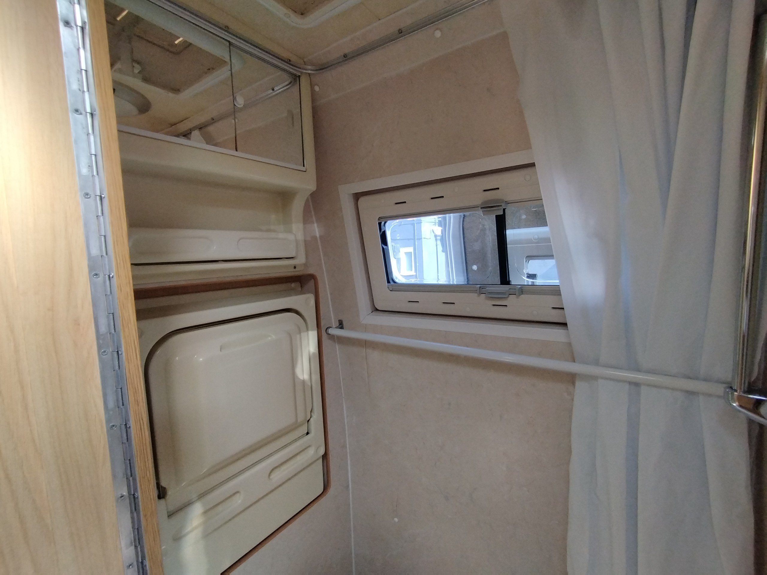 The washroom is to the rear nearside of the motorhome and has a a shower, swiveling electric flushing toilet, drop down hand basin, washroom cabinet, sliding window for good ventilation and vanity mirror.