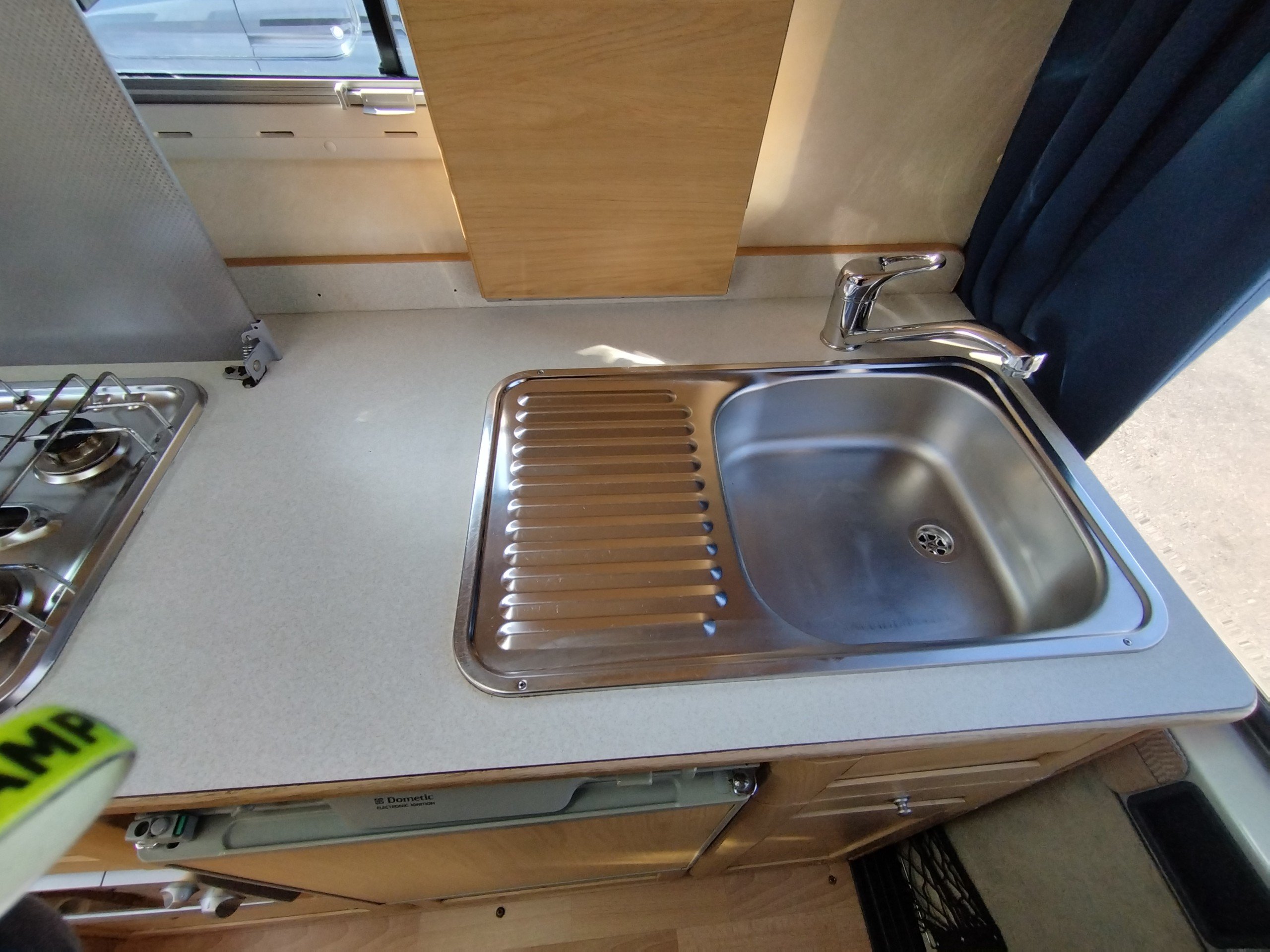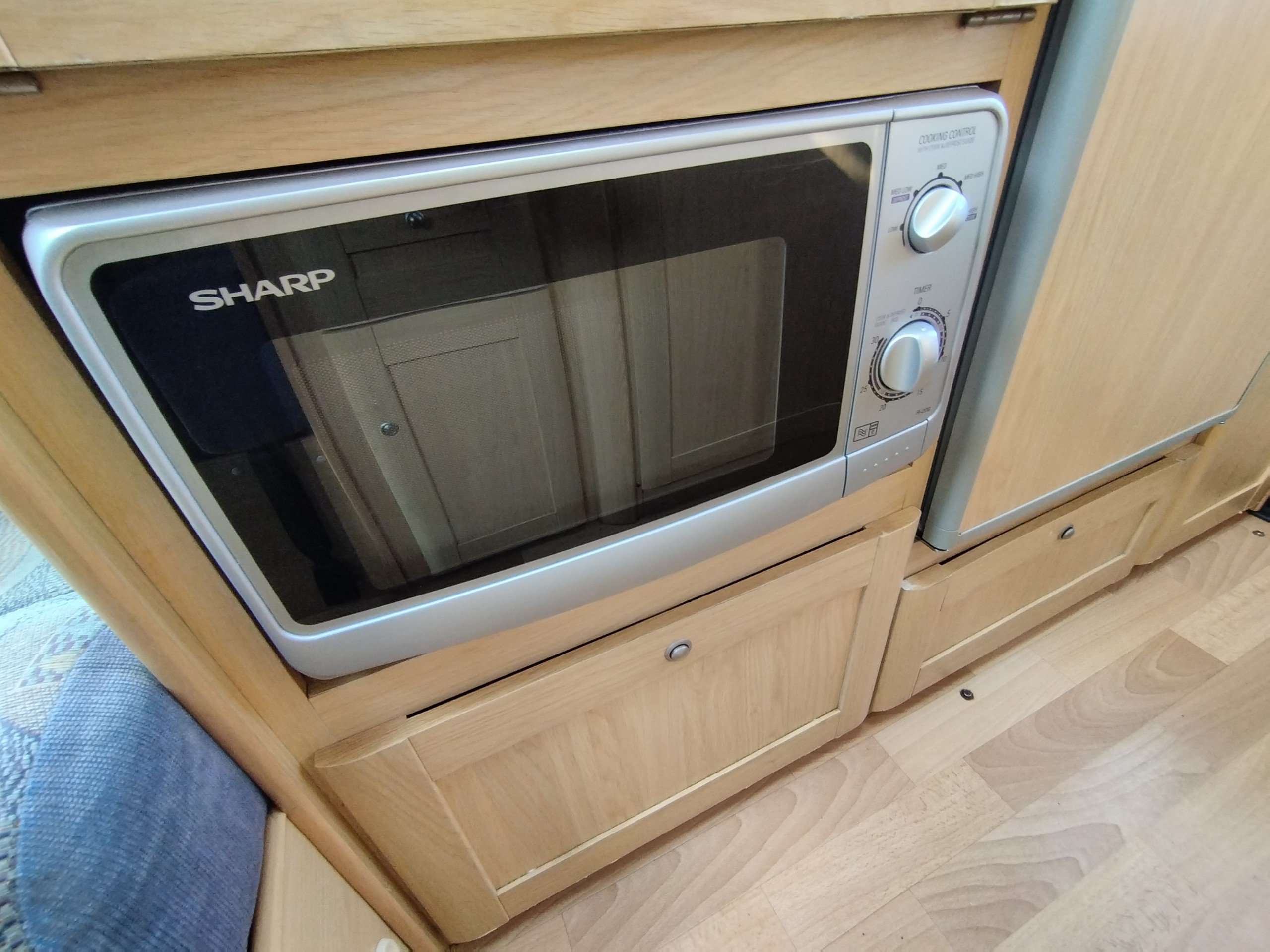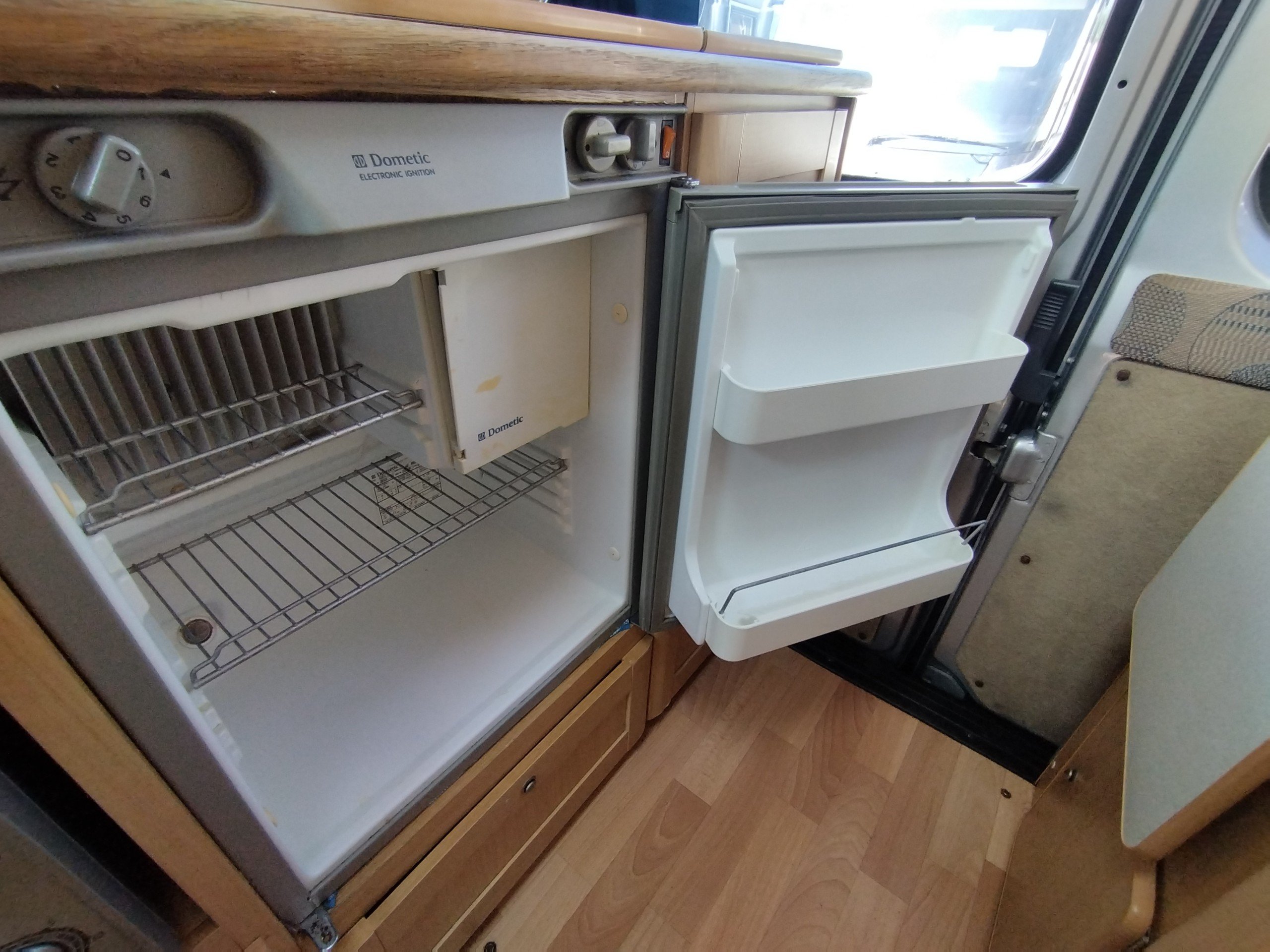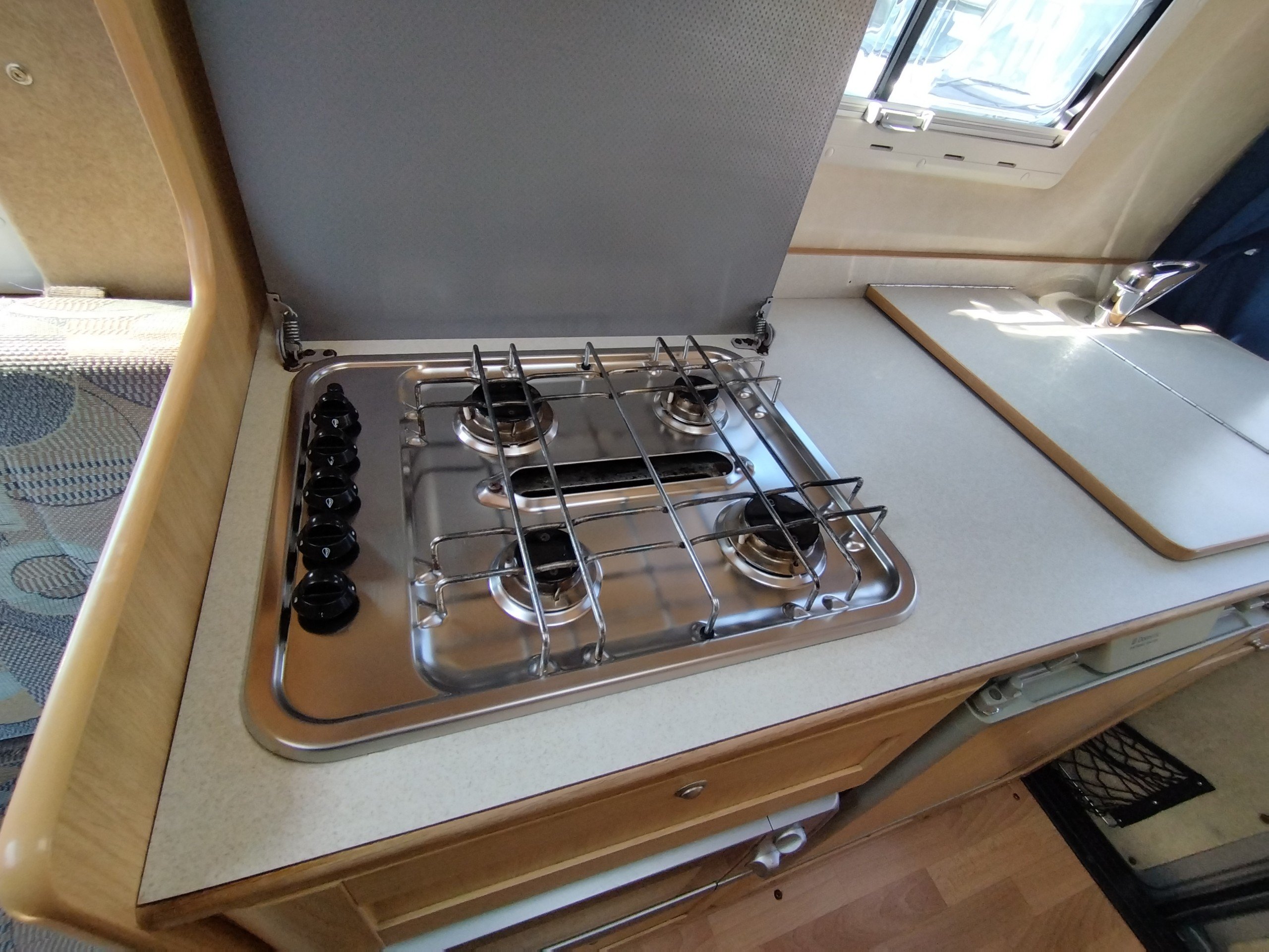 The kitchen is opposite and has a 4 burner gas hob with glass lid for extra workspace when not in use, grill, microwave, 3 way fridge with freezer box, sink with built in drainer and storage for the groceries.