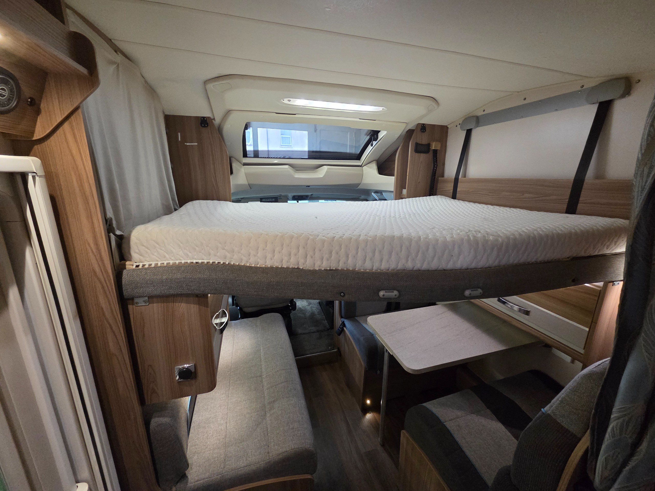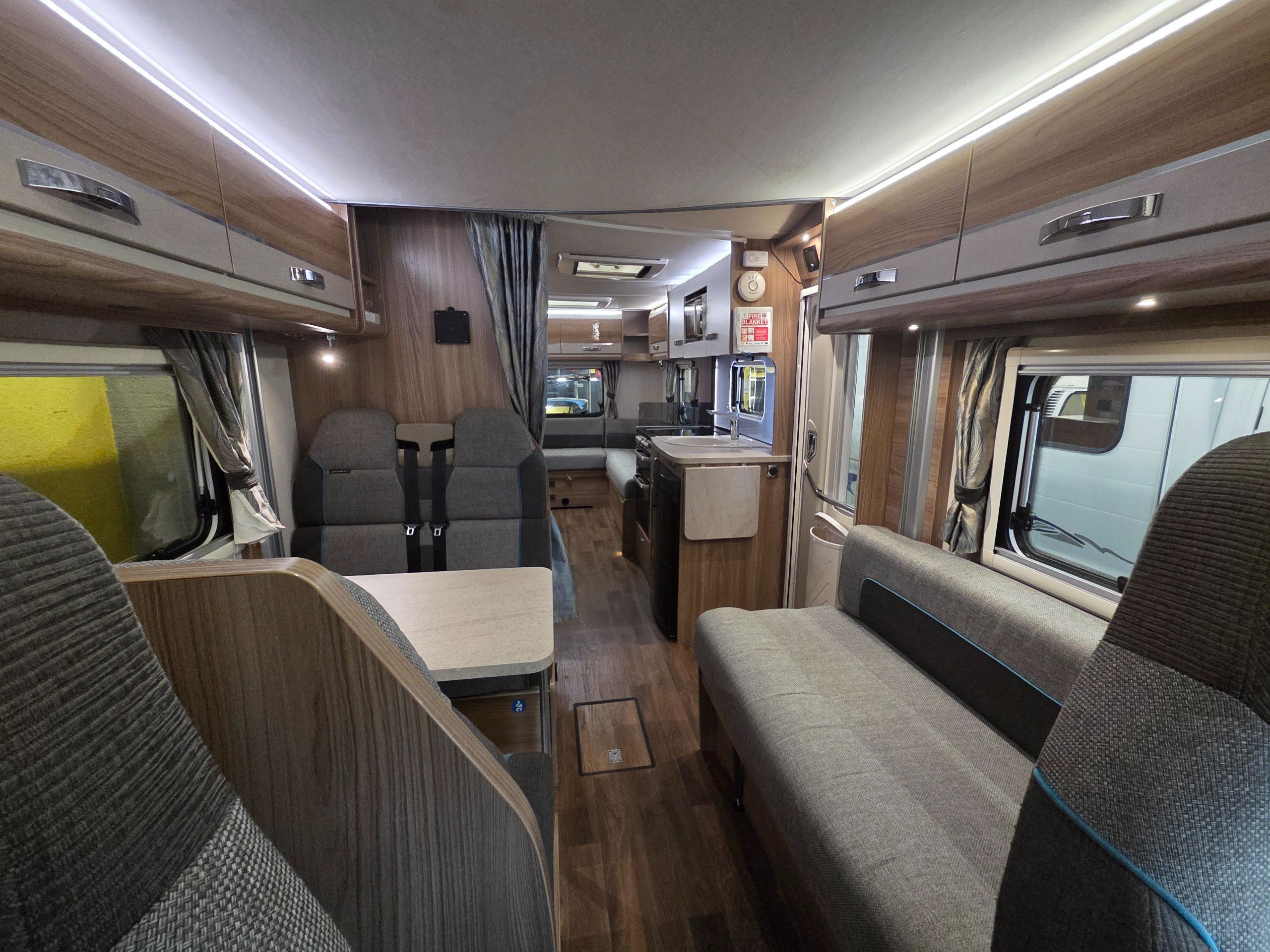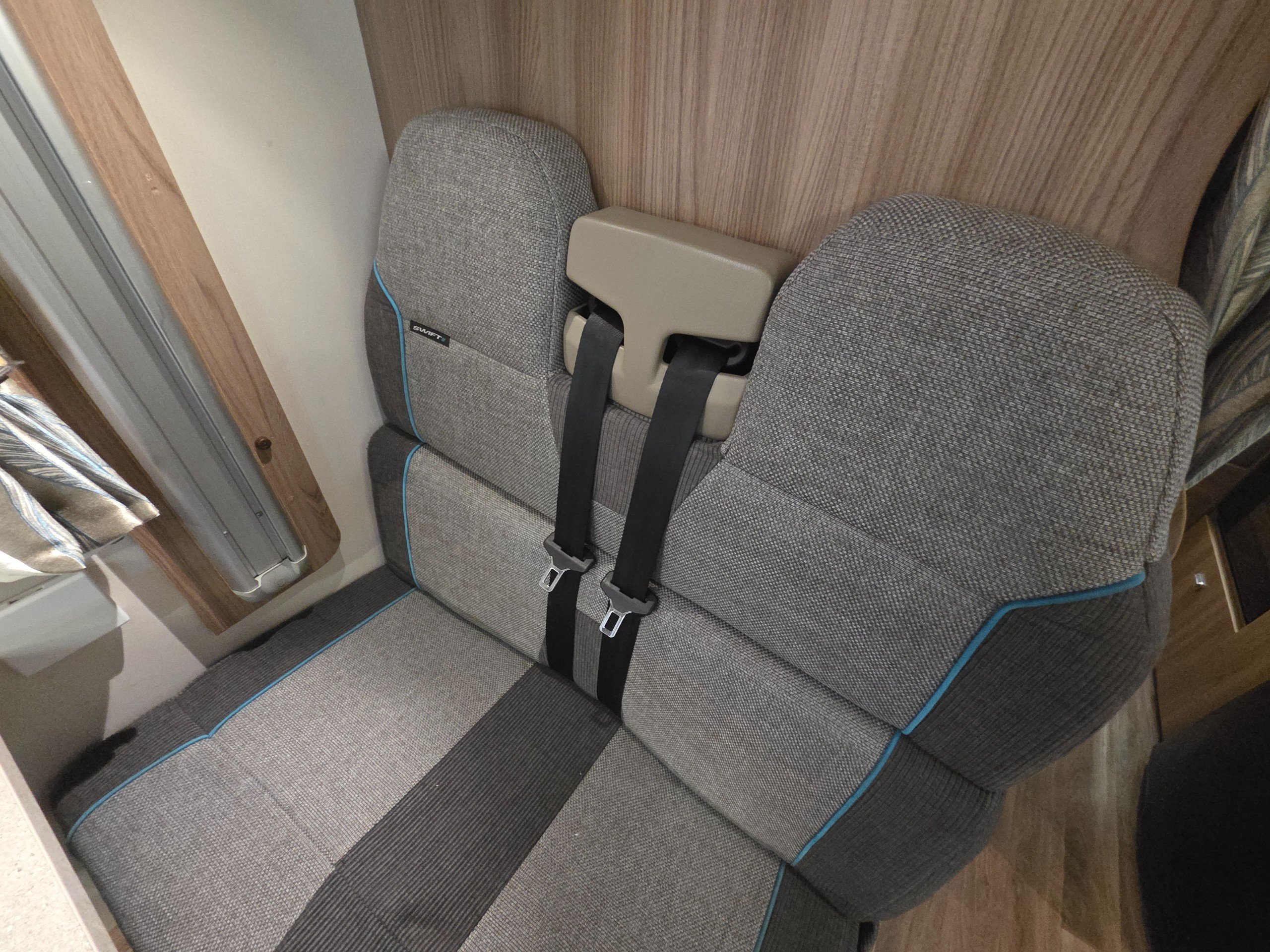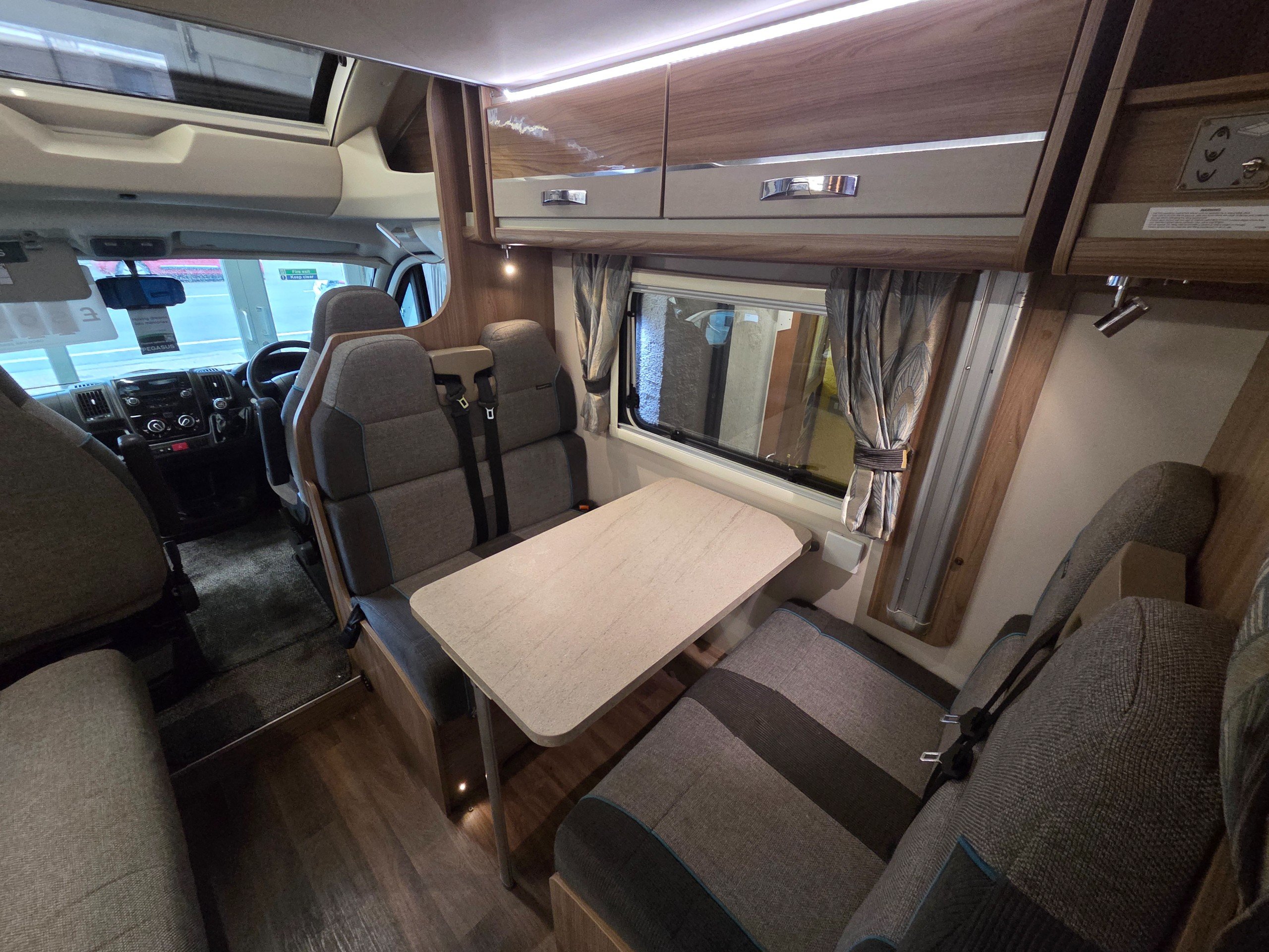 Up front is the lounge this makes into a double bed and also has an electric bed that drops down from above. There is a dinnette which houses 4 x 3 point seat belts and a side bench settee too so a very social space to be.