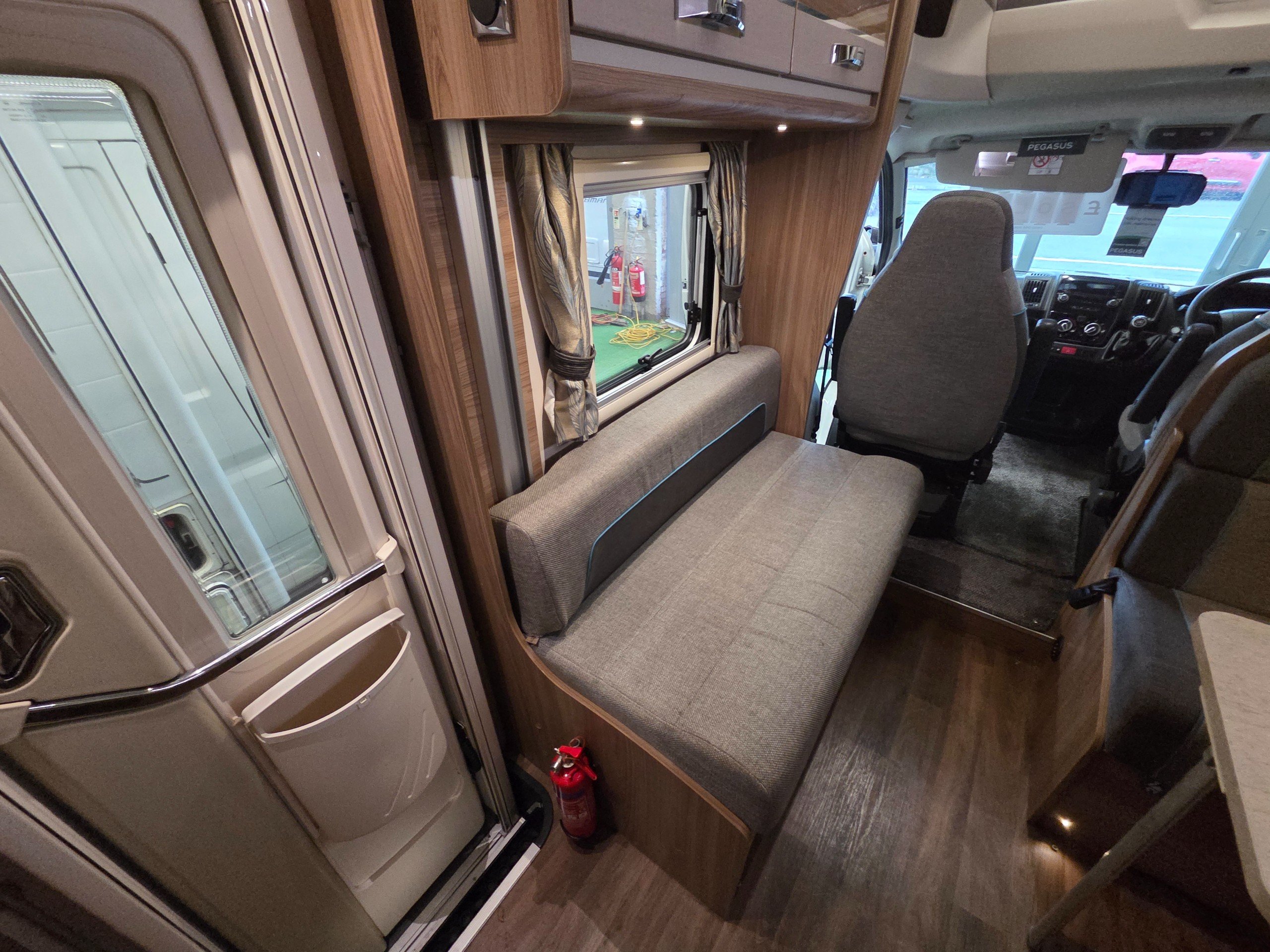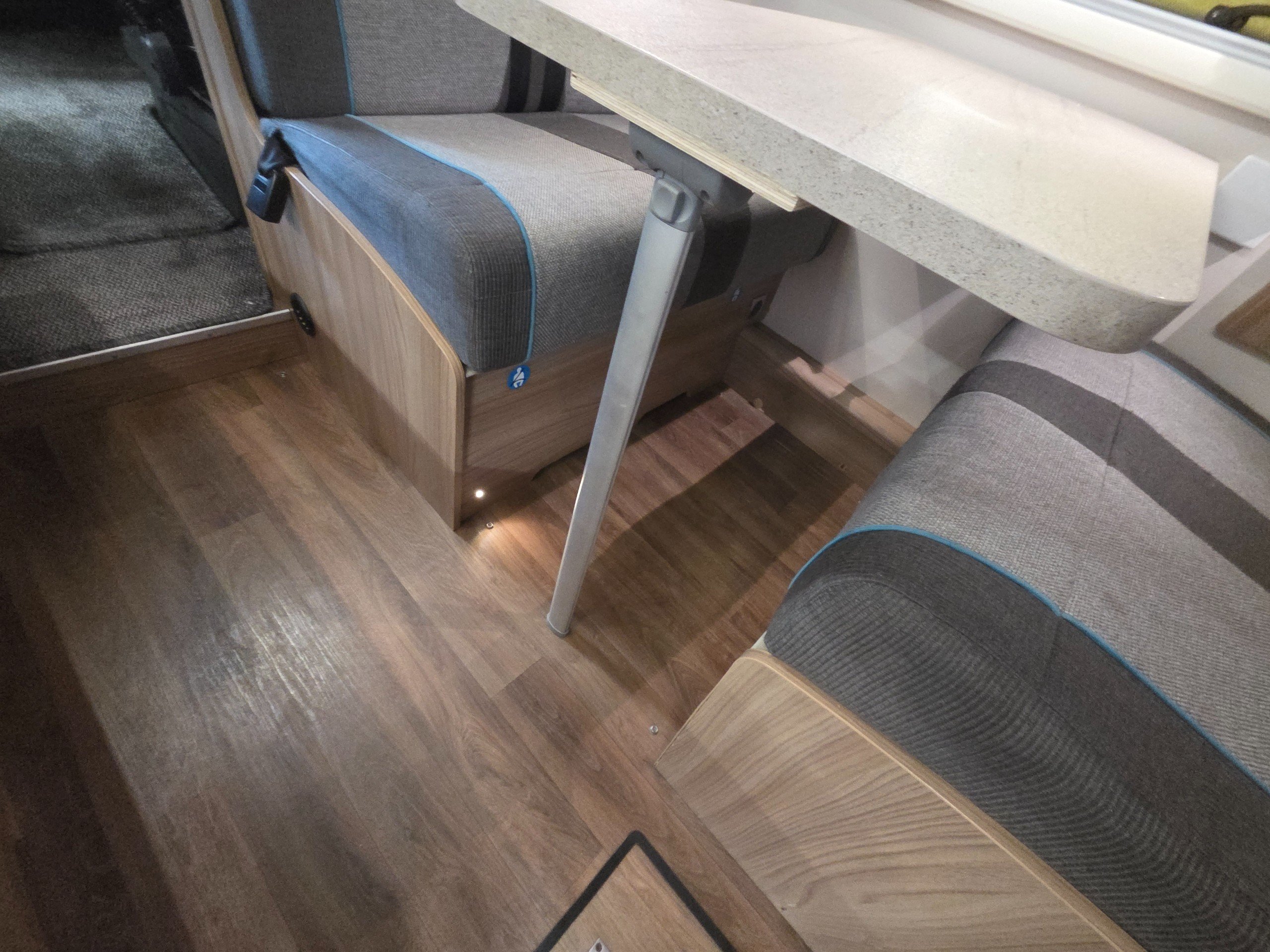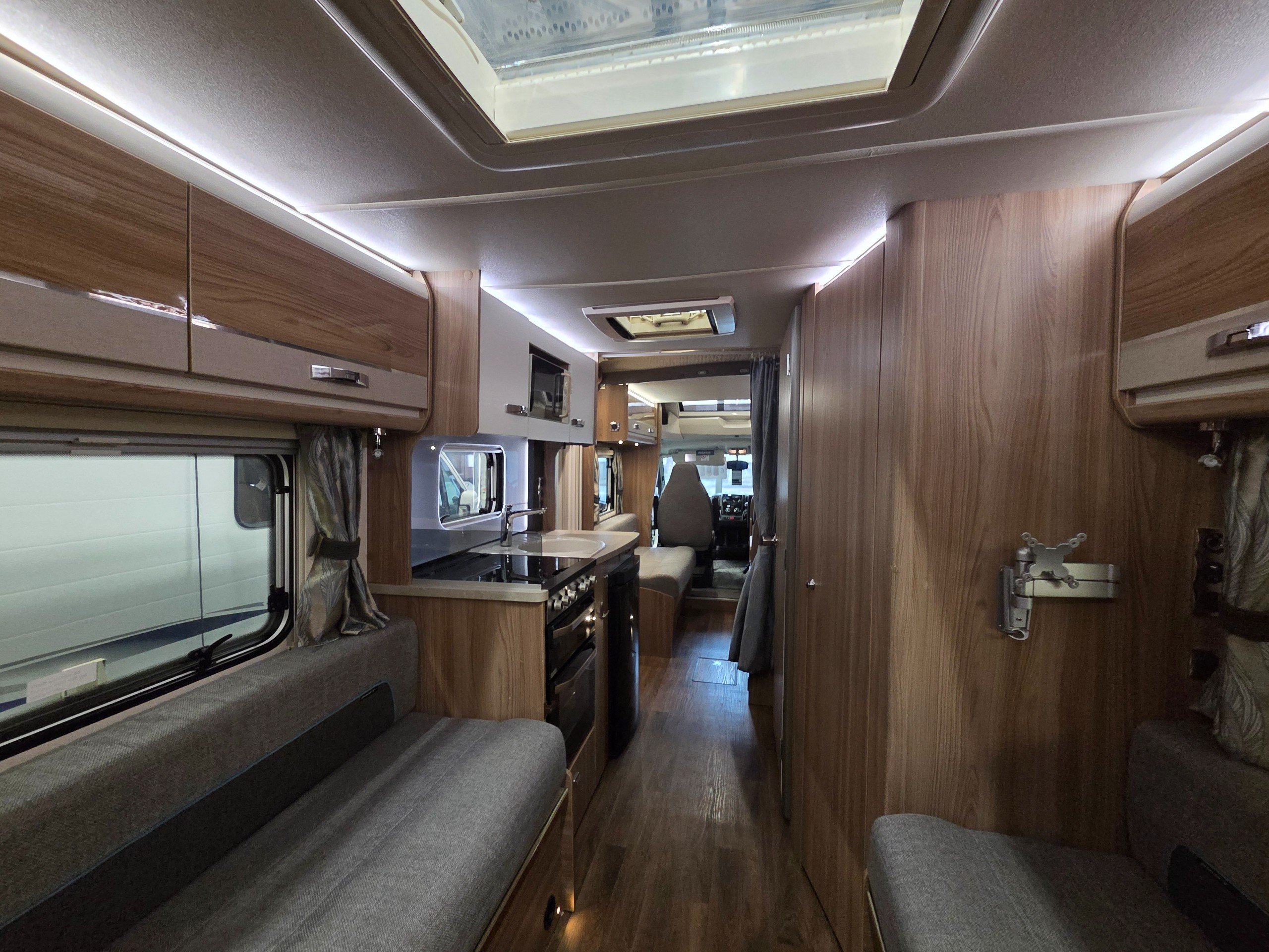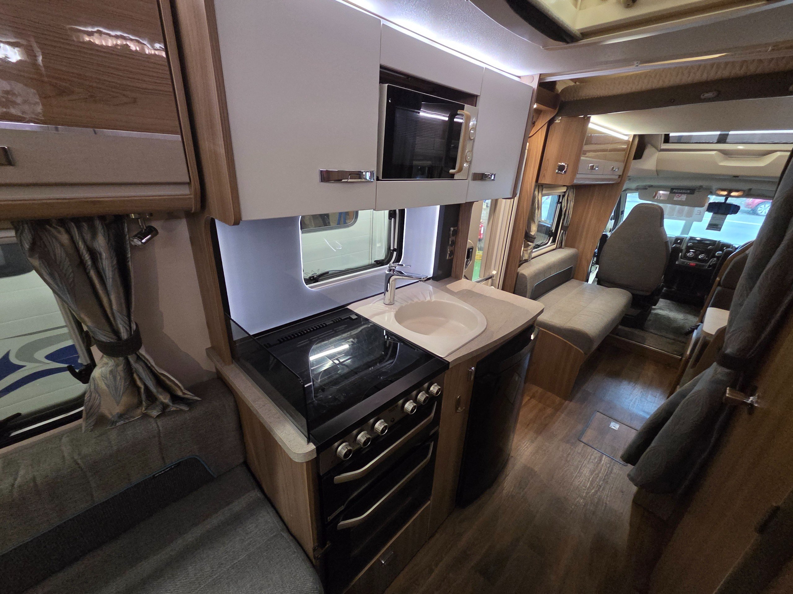 Up front is the lounge this makes into a double bed and also has an electric bed that drops down from above. There is a dinnette which houses 4 x 3 point seat belts and a side bench settee too so a very social space to be.