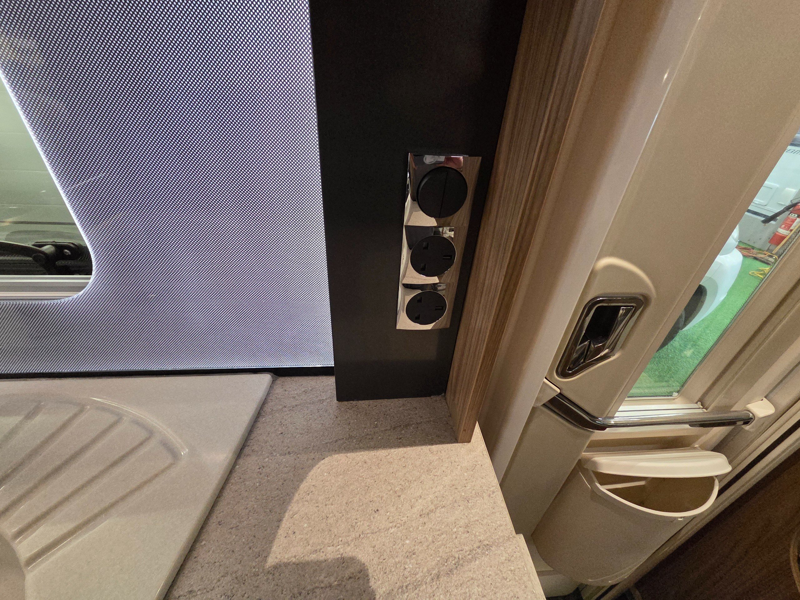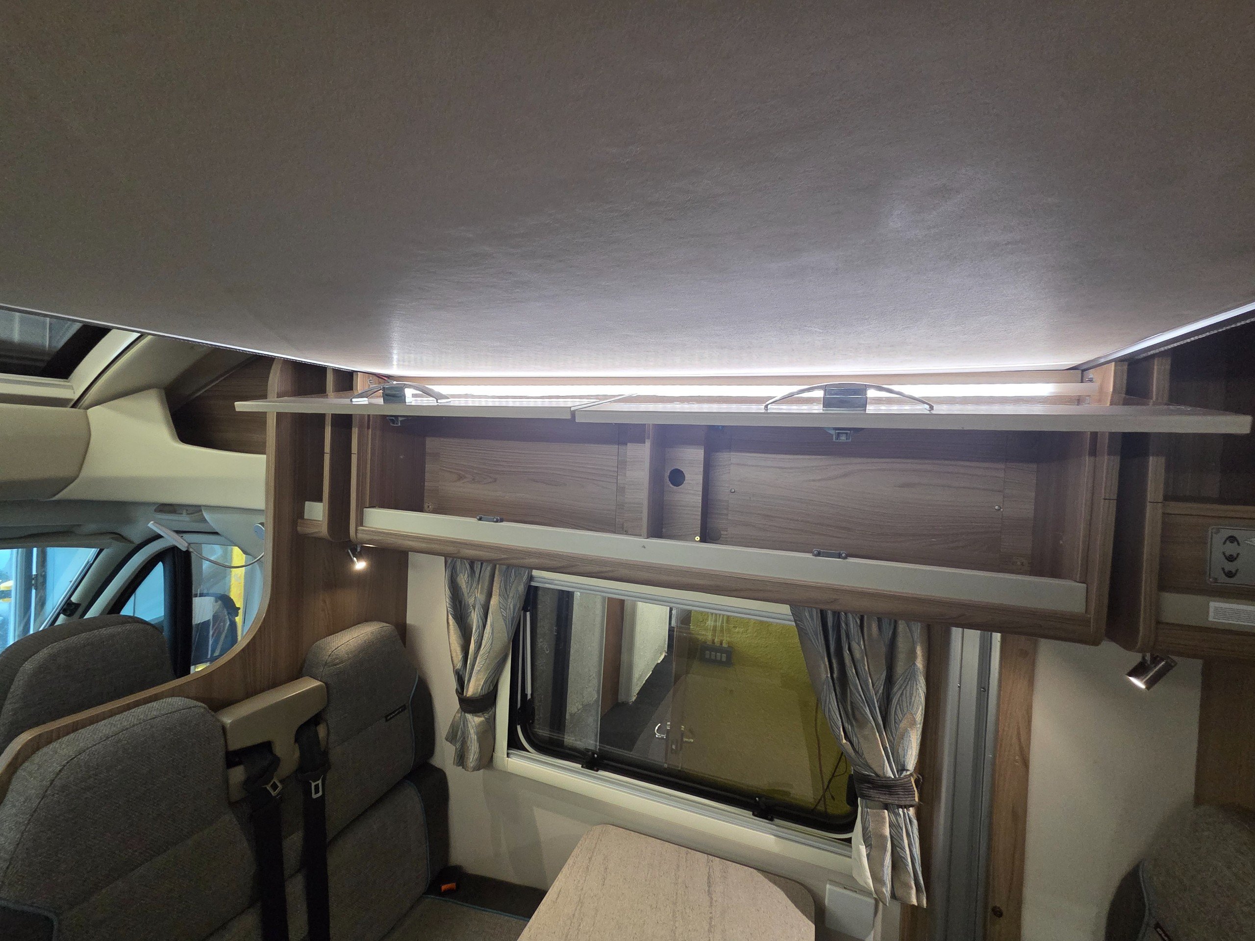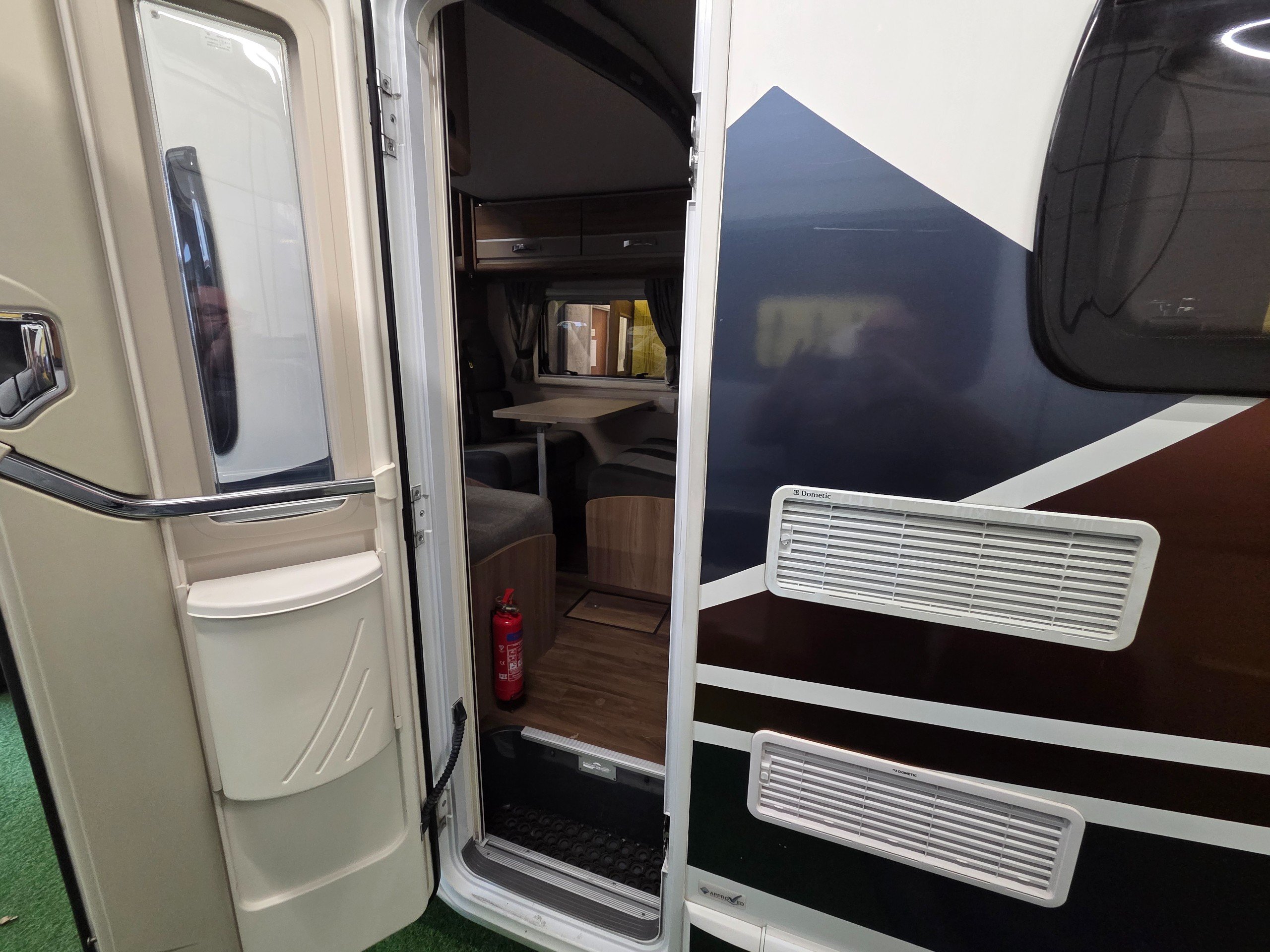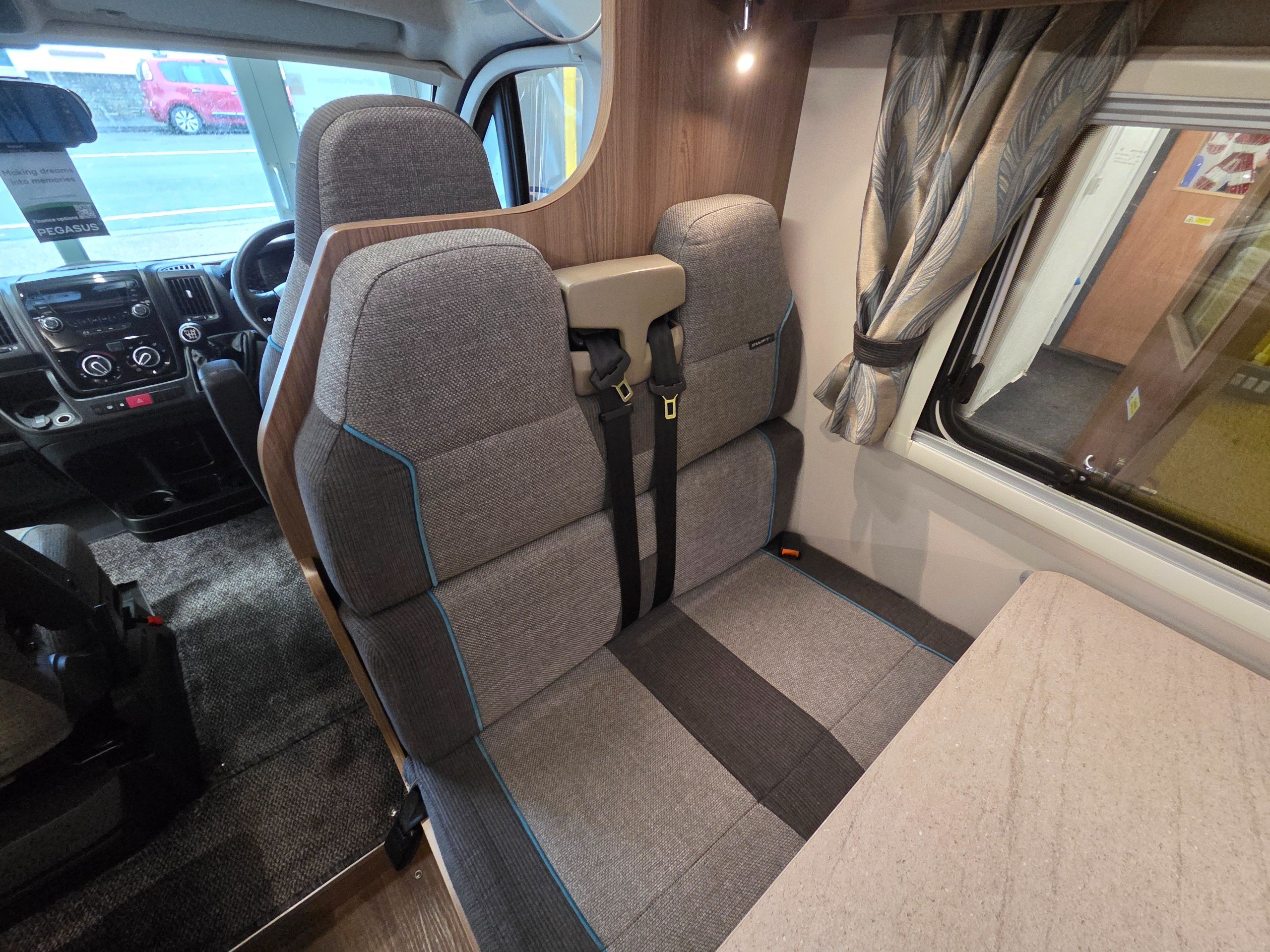 Up front is the lounge this makes into a double bed and also has an electric bed that drops down from above. There is a dinnette which houses 4 x 3 point seat belts and a side bench settee too so a very social space to be.