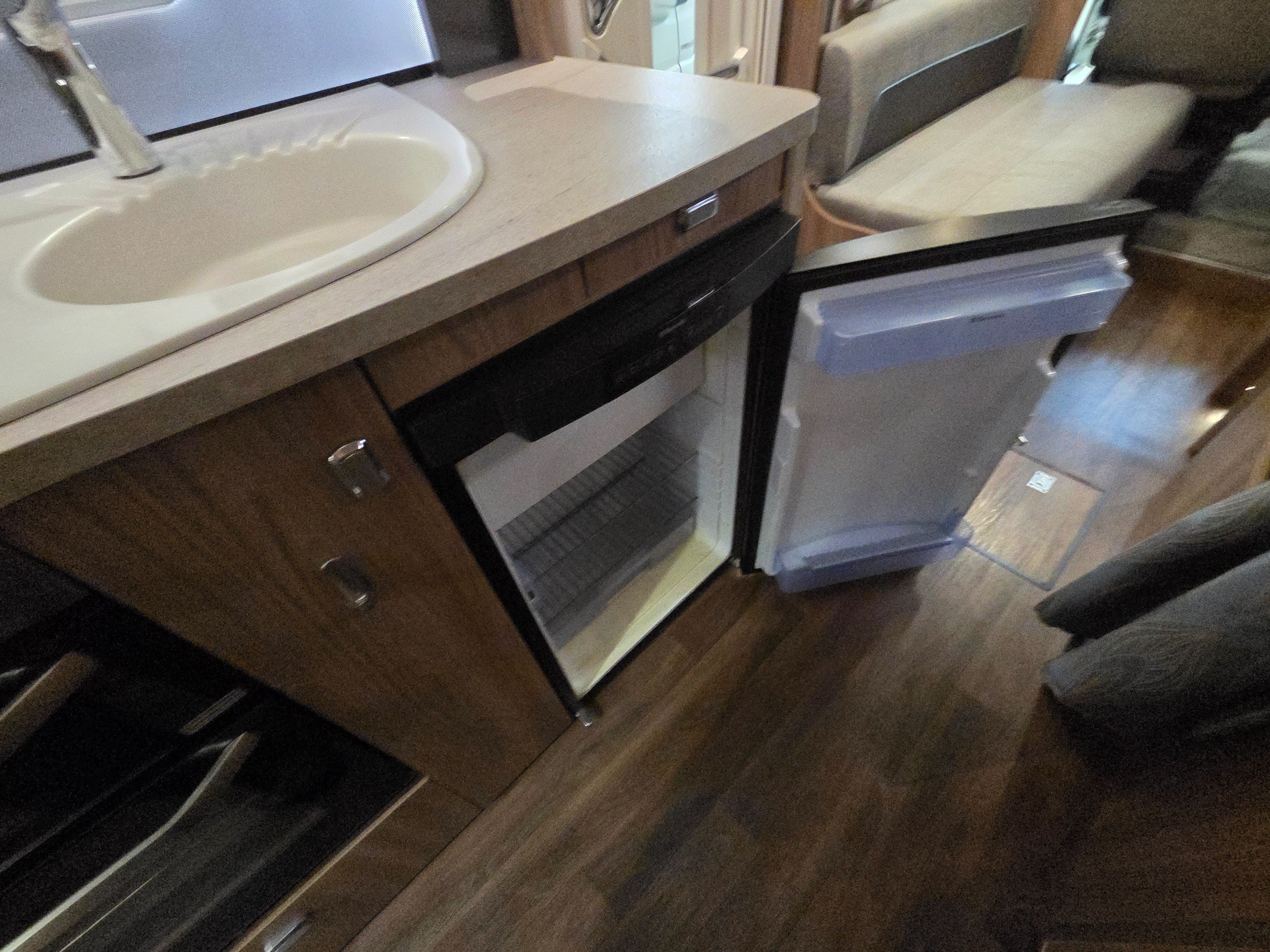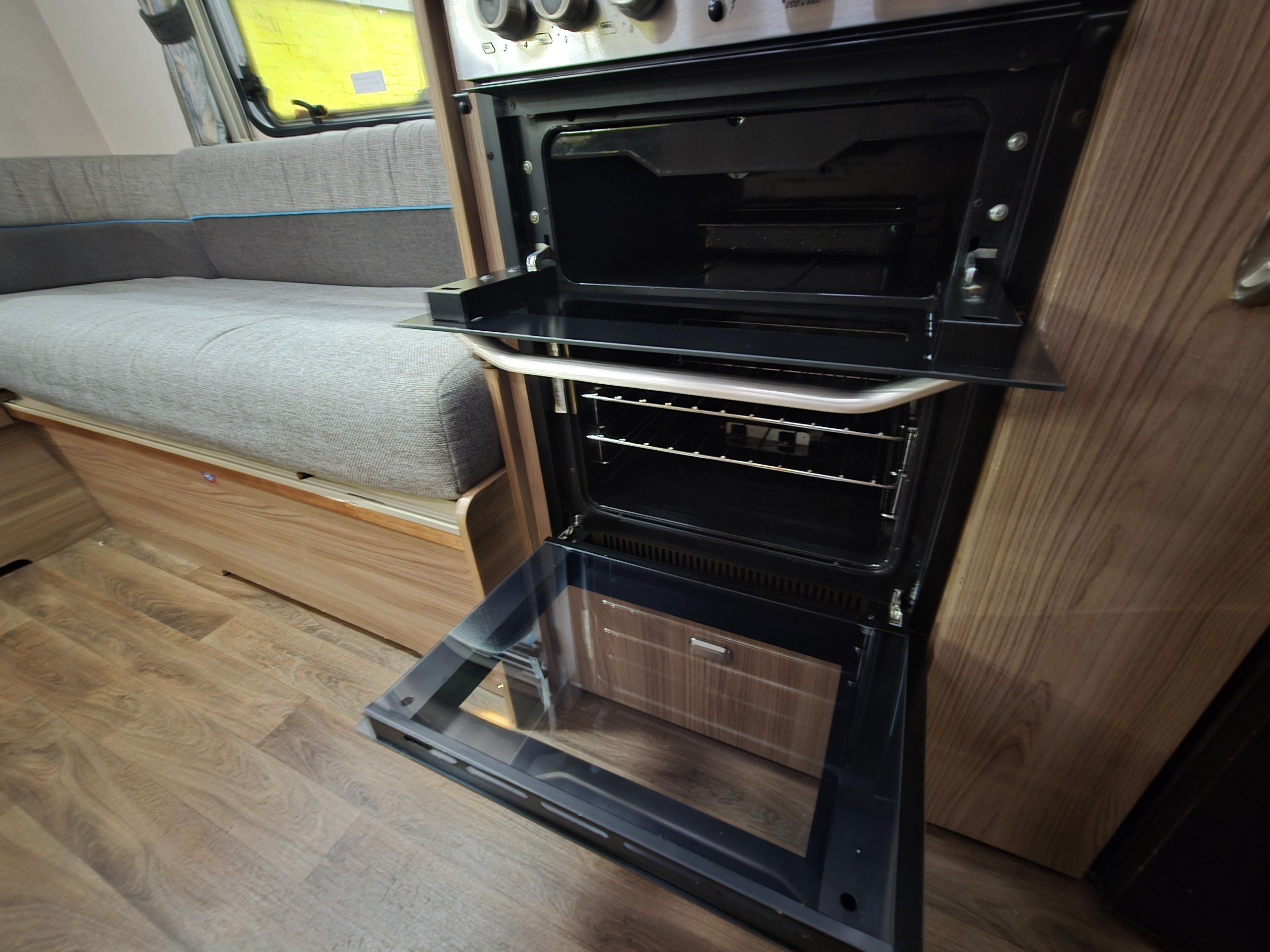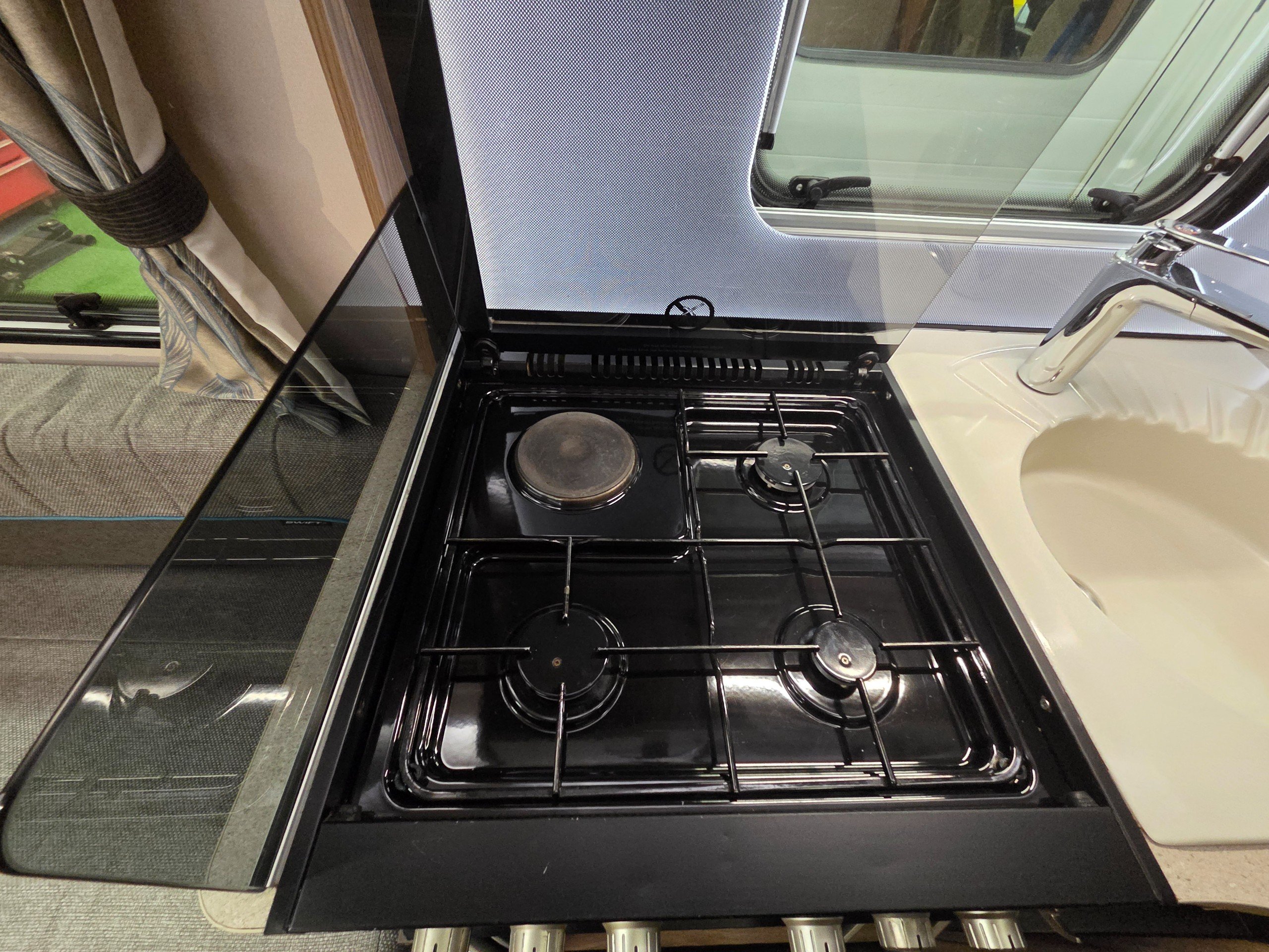 The kitchen is to the nearside placed centrally with a 3 way fridge with freezer compartment, bowl sink with drainer, microwave, full cooker consisting of 3 burner gas hob, 1 electric hob, separate oven and grill, storage for the groceries too.