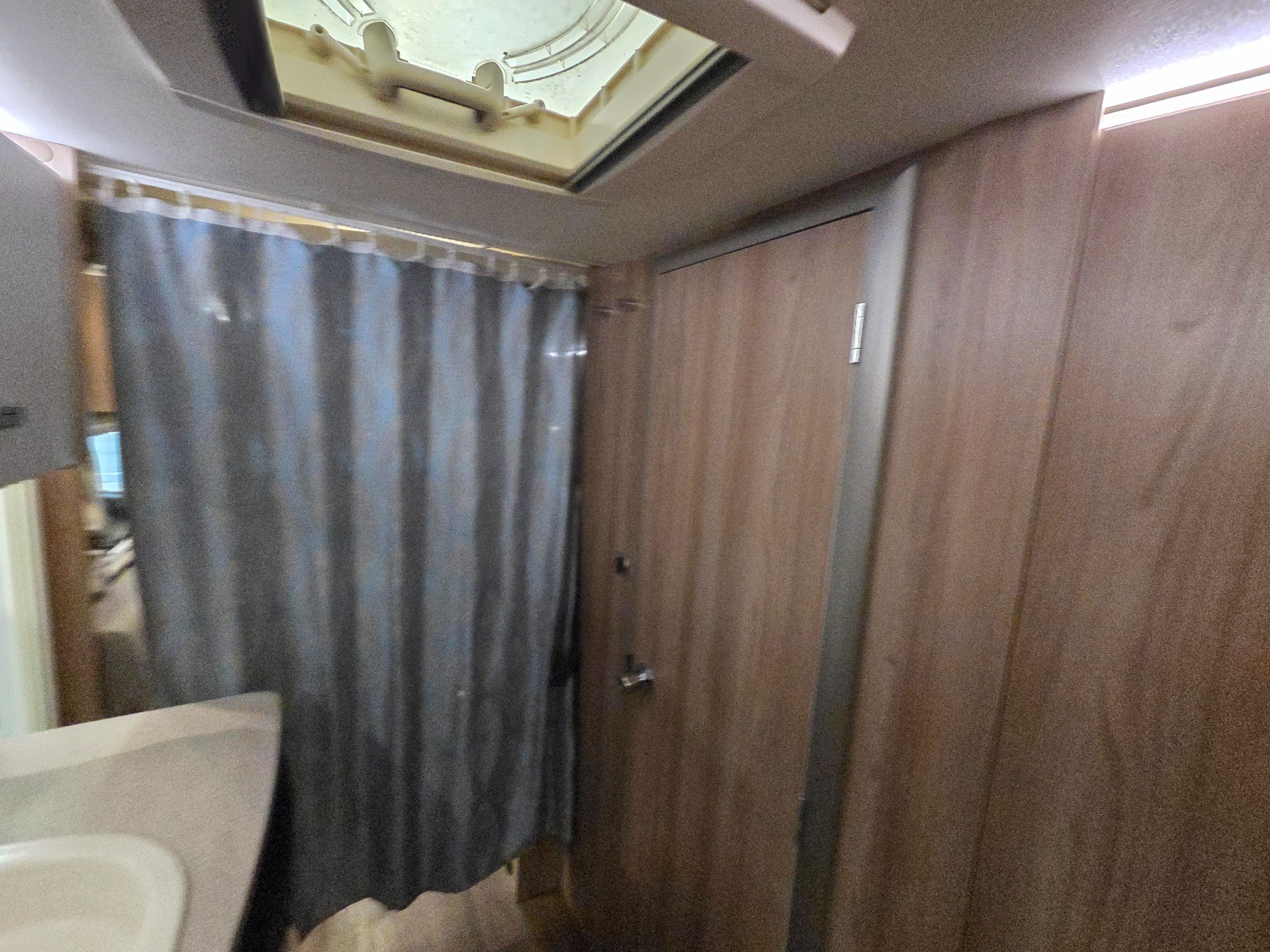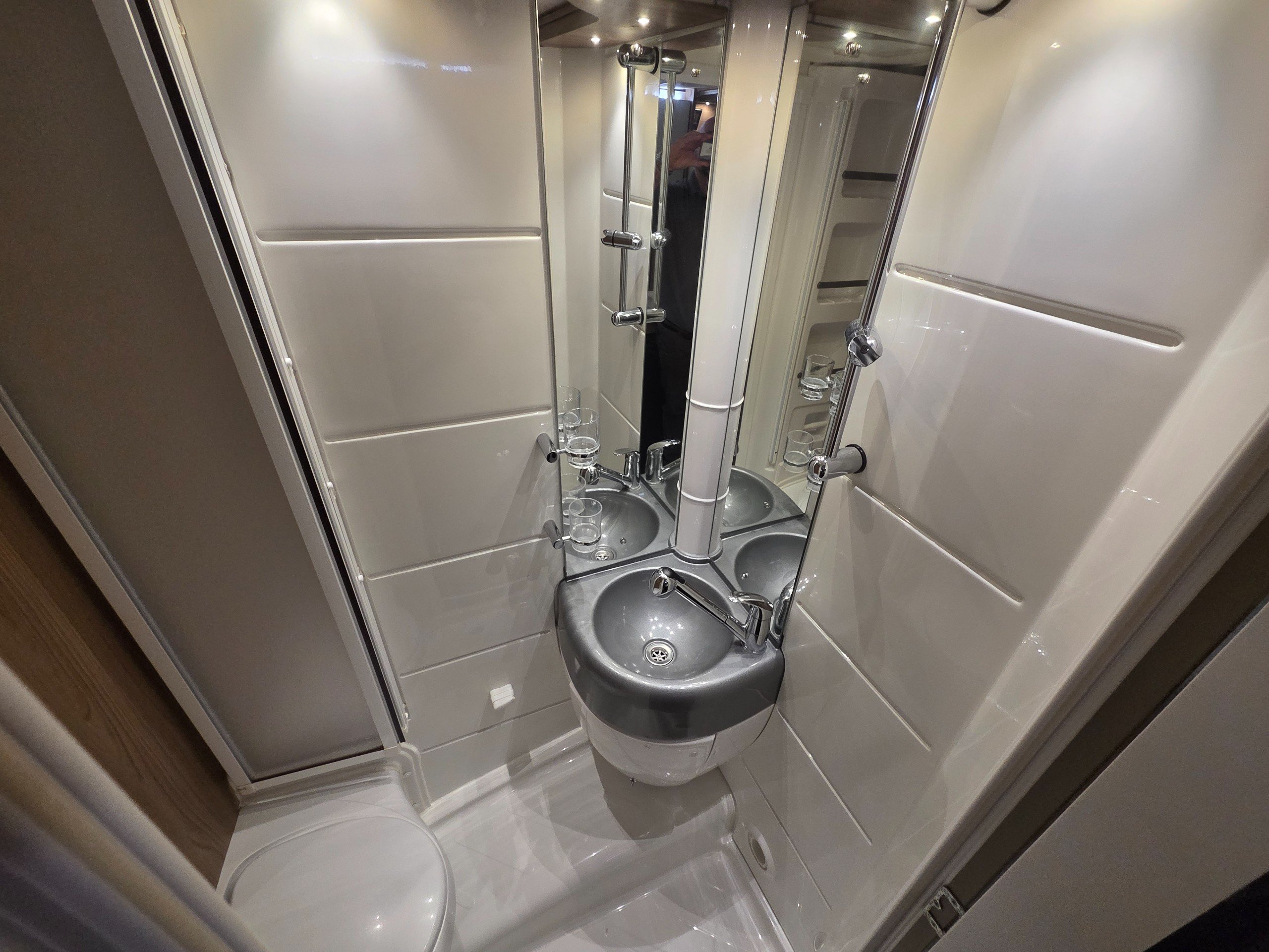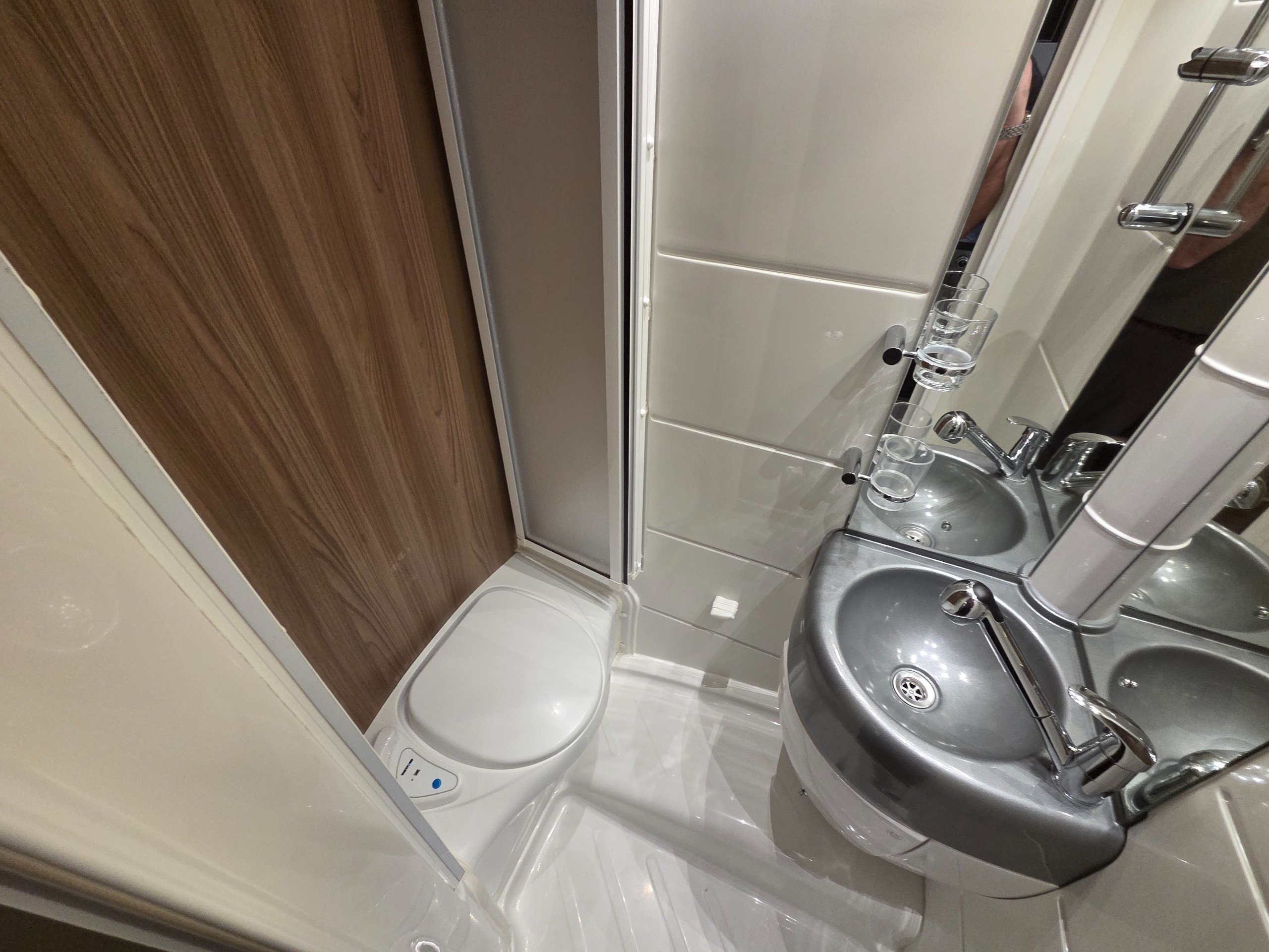 Opposite the kitchen is the washroom. This a good size shower tray, shower with a screen to prevent toilet getting wet, hand basin, vanity mirror, cup holders, towel holder, and storage for the toiletries.