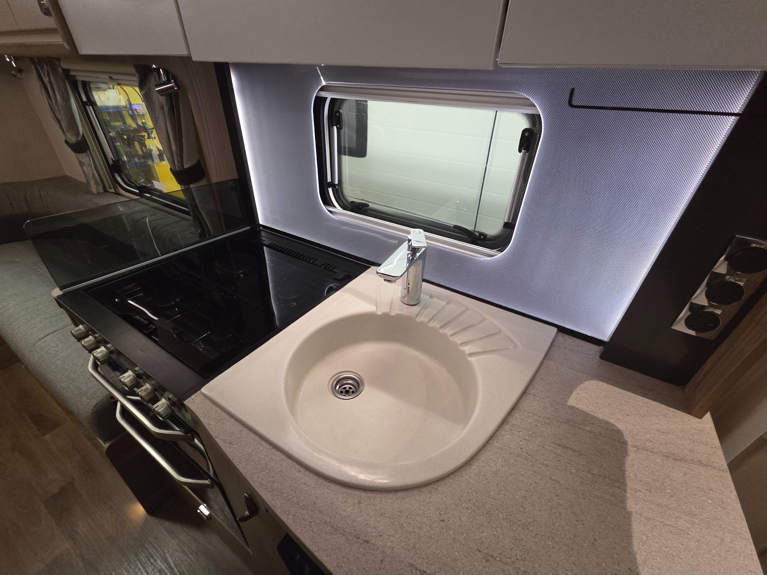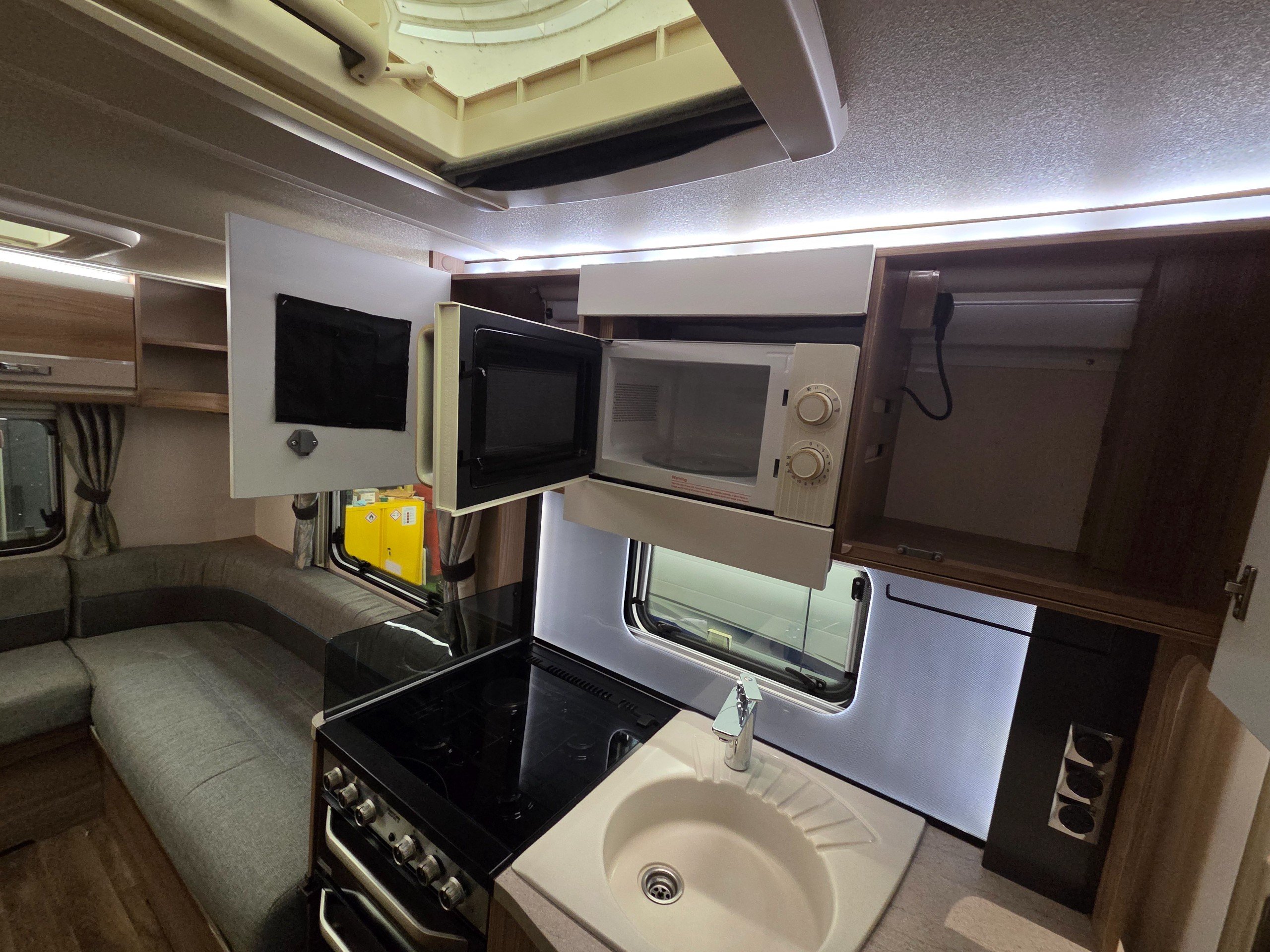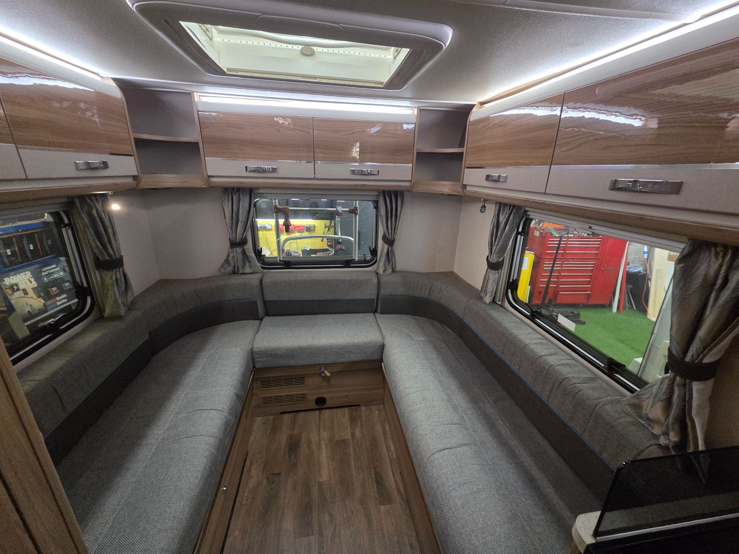 The rear U shaped lounge is a very social space to be. This the ability to be slept in as 2 single beds or a as a double bed which is great. There are wrap around over head cupboards and storage under the seating too which will prove useful, the lounge is open and bright thanks to the 3 large windows which give 180 degree views of your destination. There is a bracket ready fitted for a TV if you wish to take one.