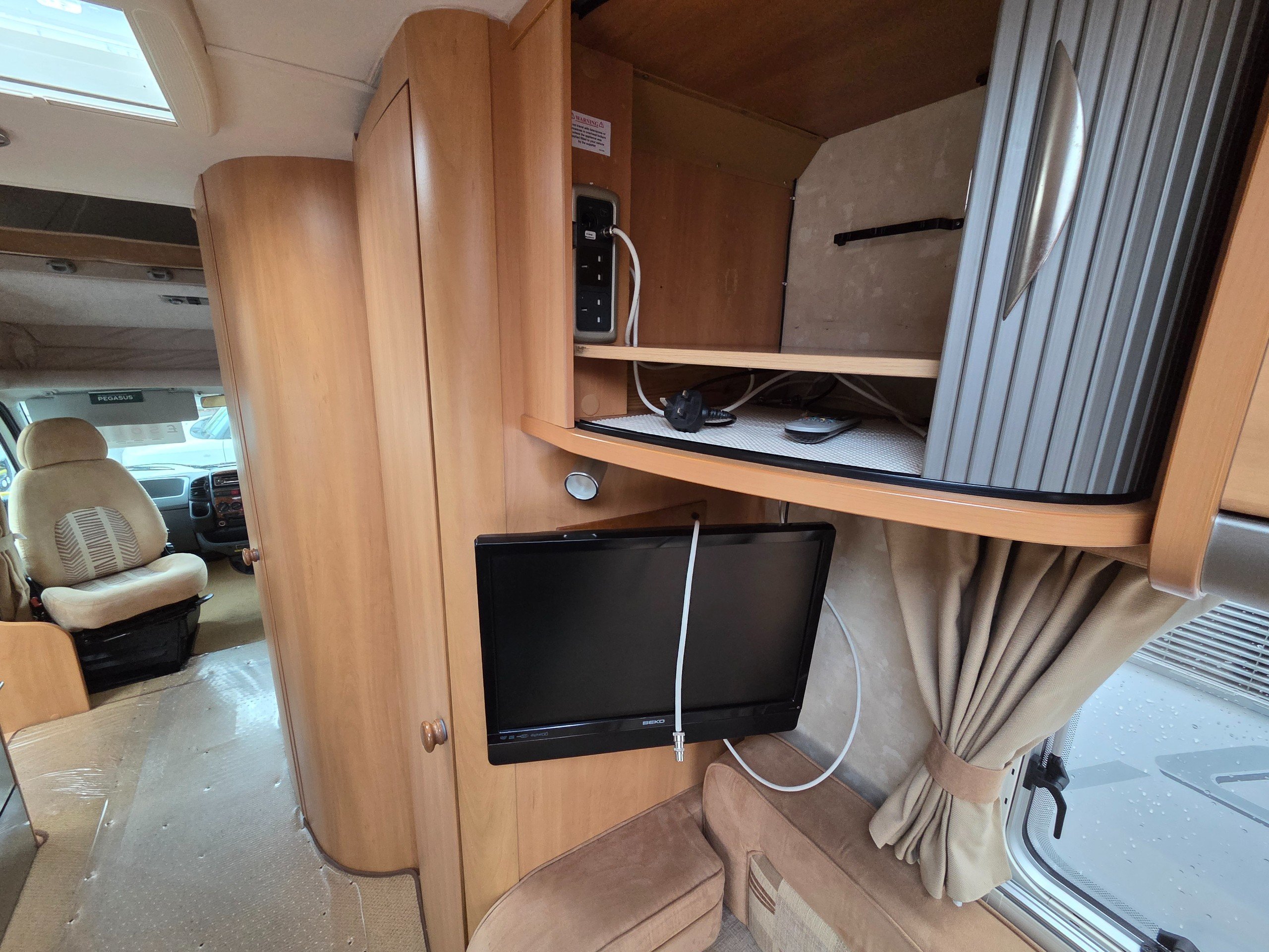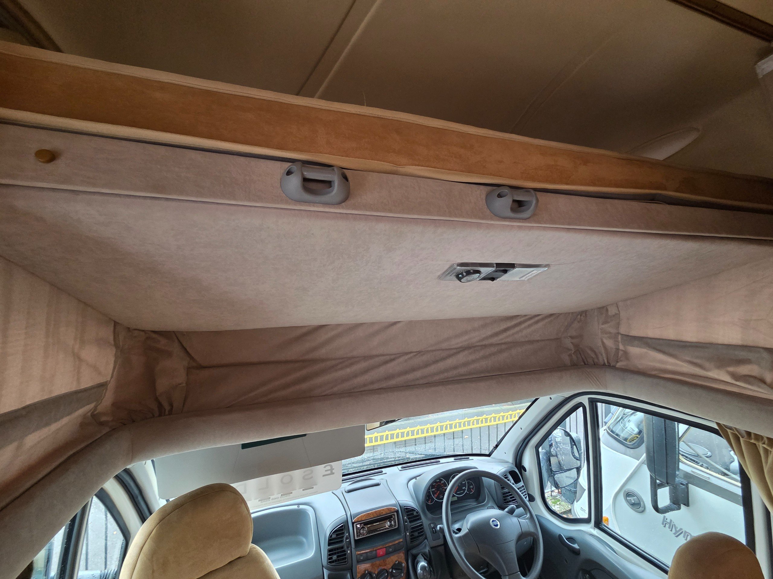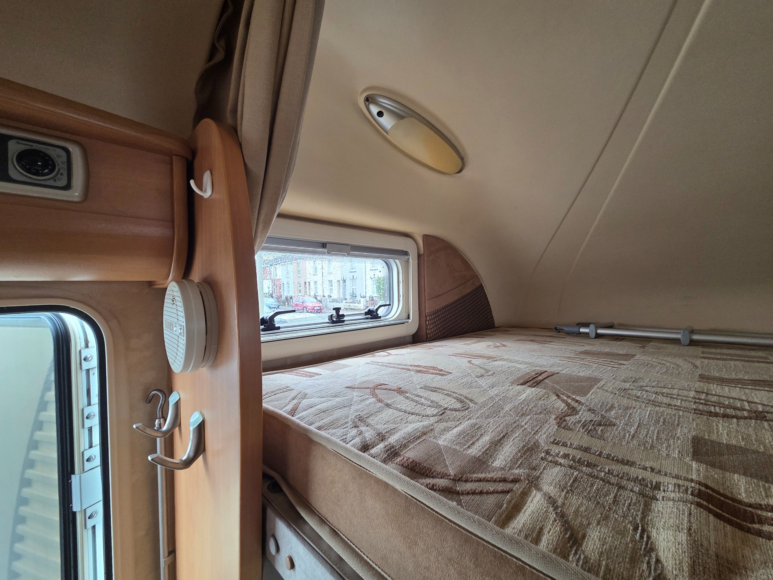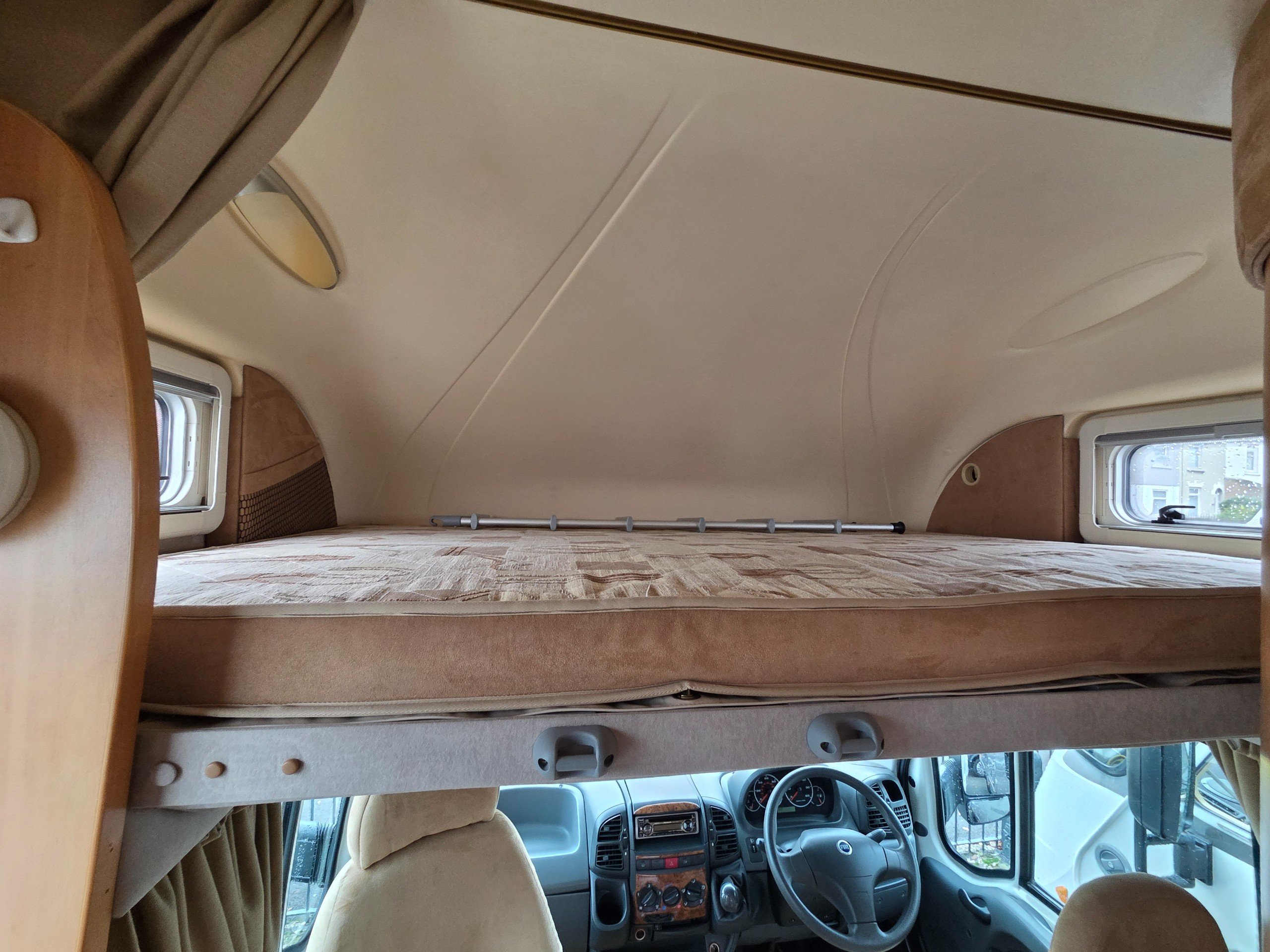Over the cab is a double bed this is accessed via a ladder and can be pushed back when not in use, so you dont bang your head.