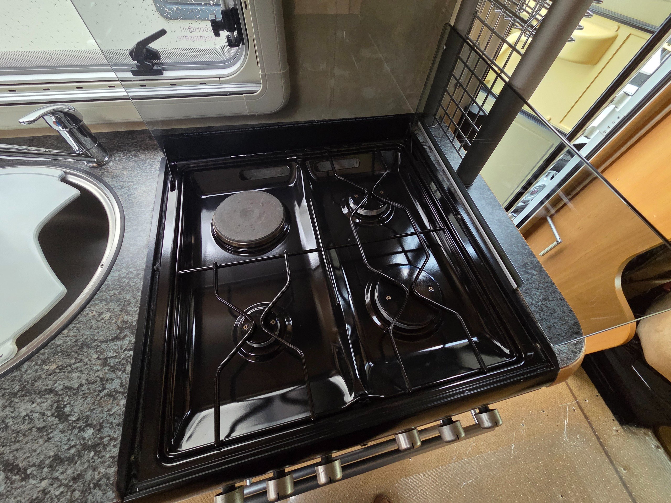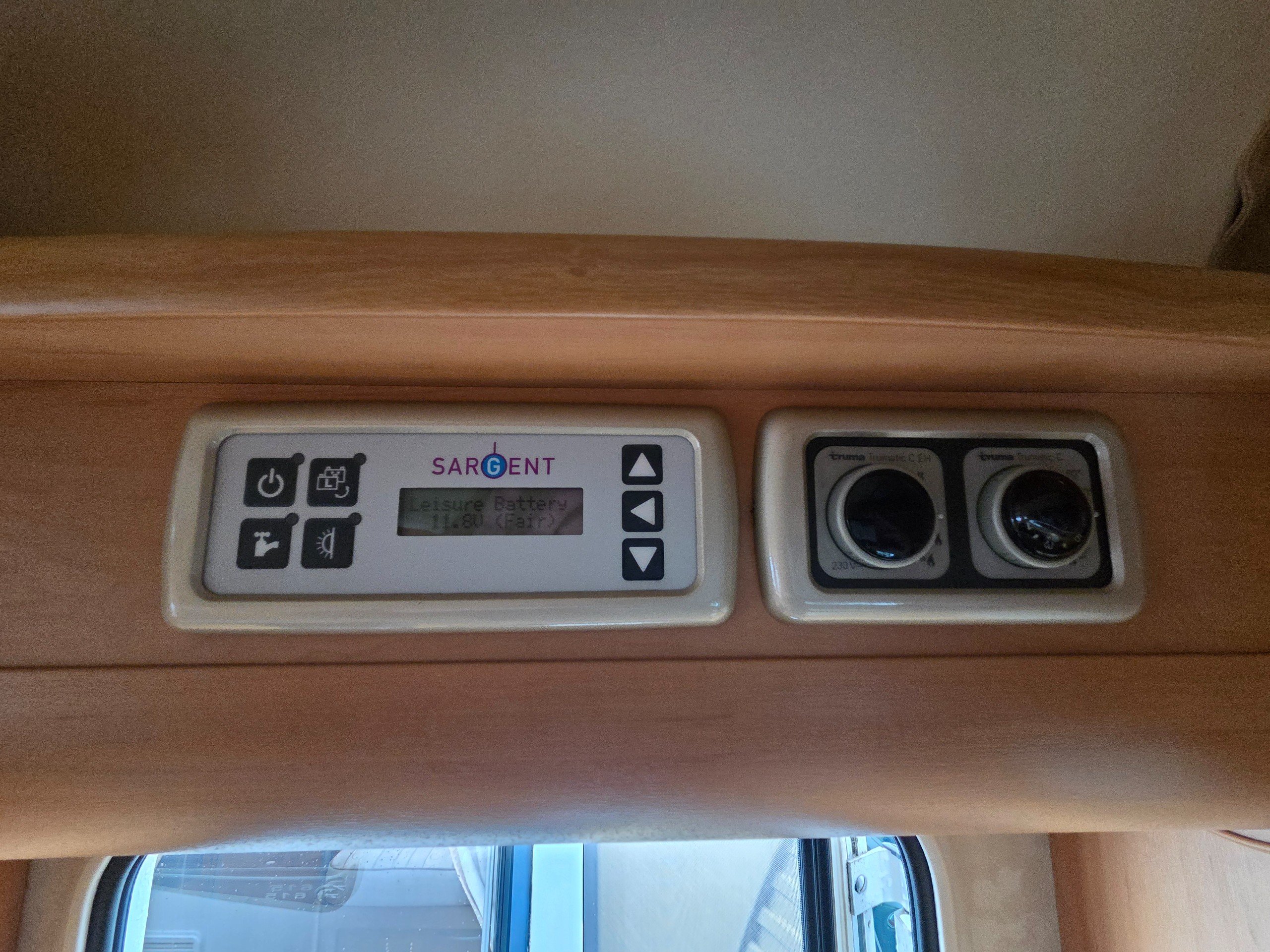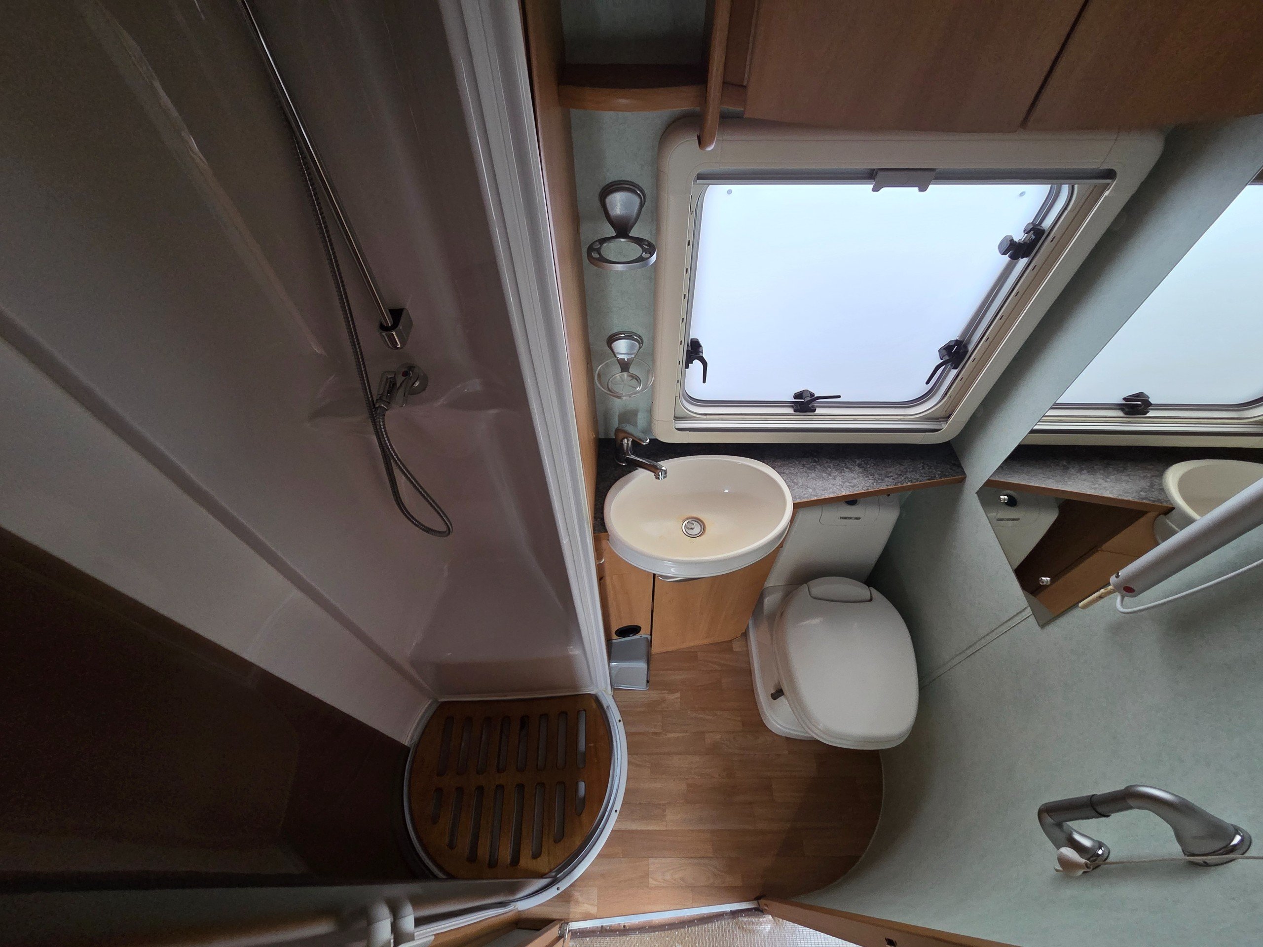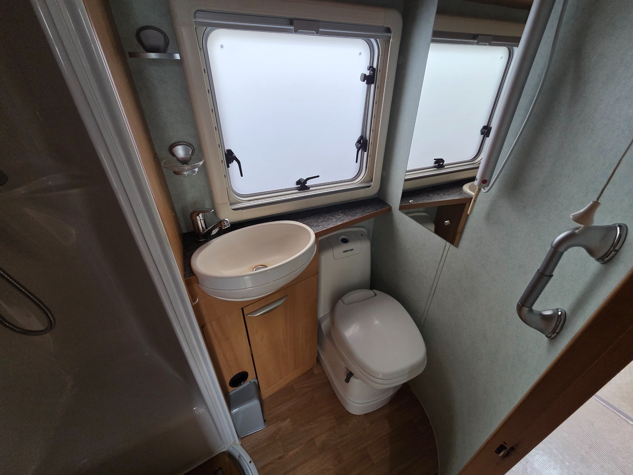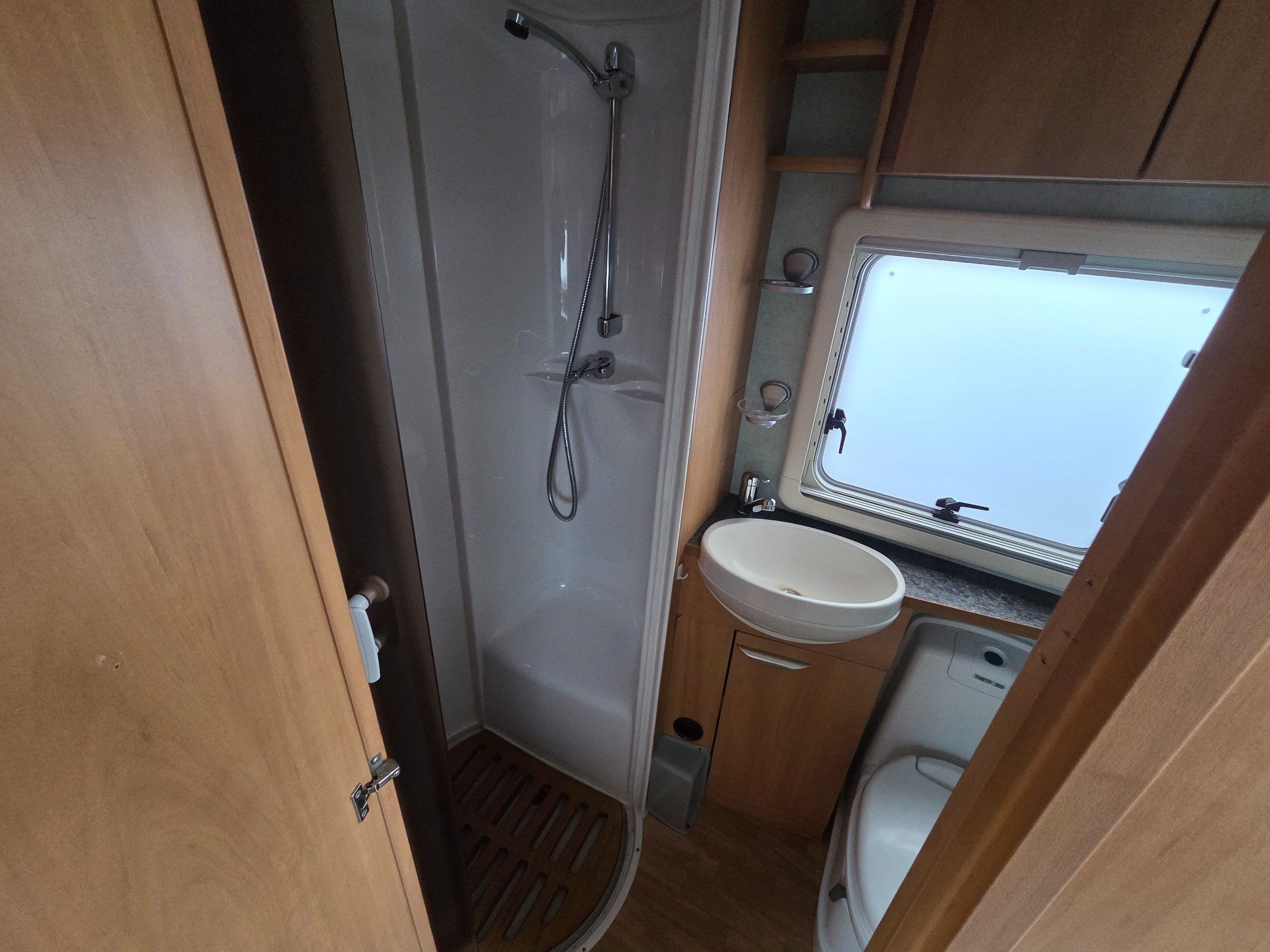 The washroom is opposite to the offside and has a separate shower with roll around shower screen, swivel electric flushing toilet, oval hand basin and work surface for the toiletries, vanity mirror, large window for great ventilation and toiletries storage cupboard too.