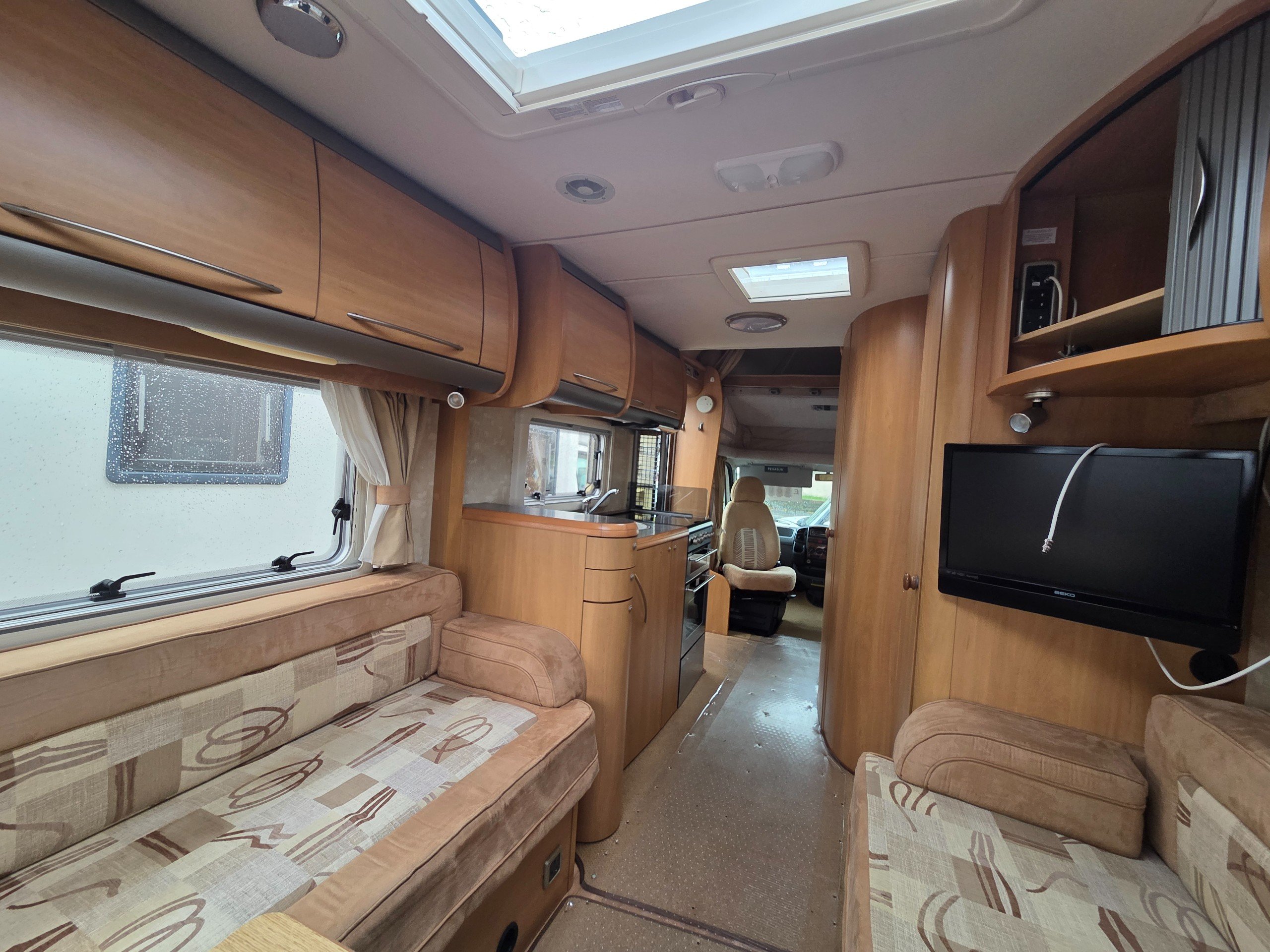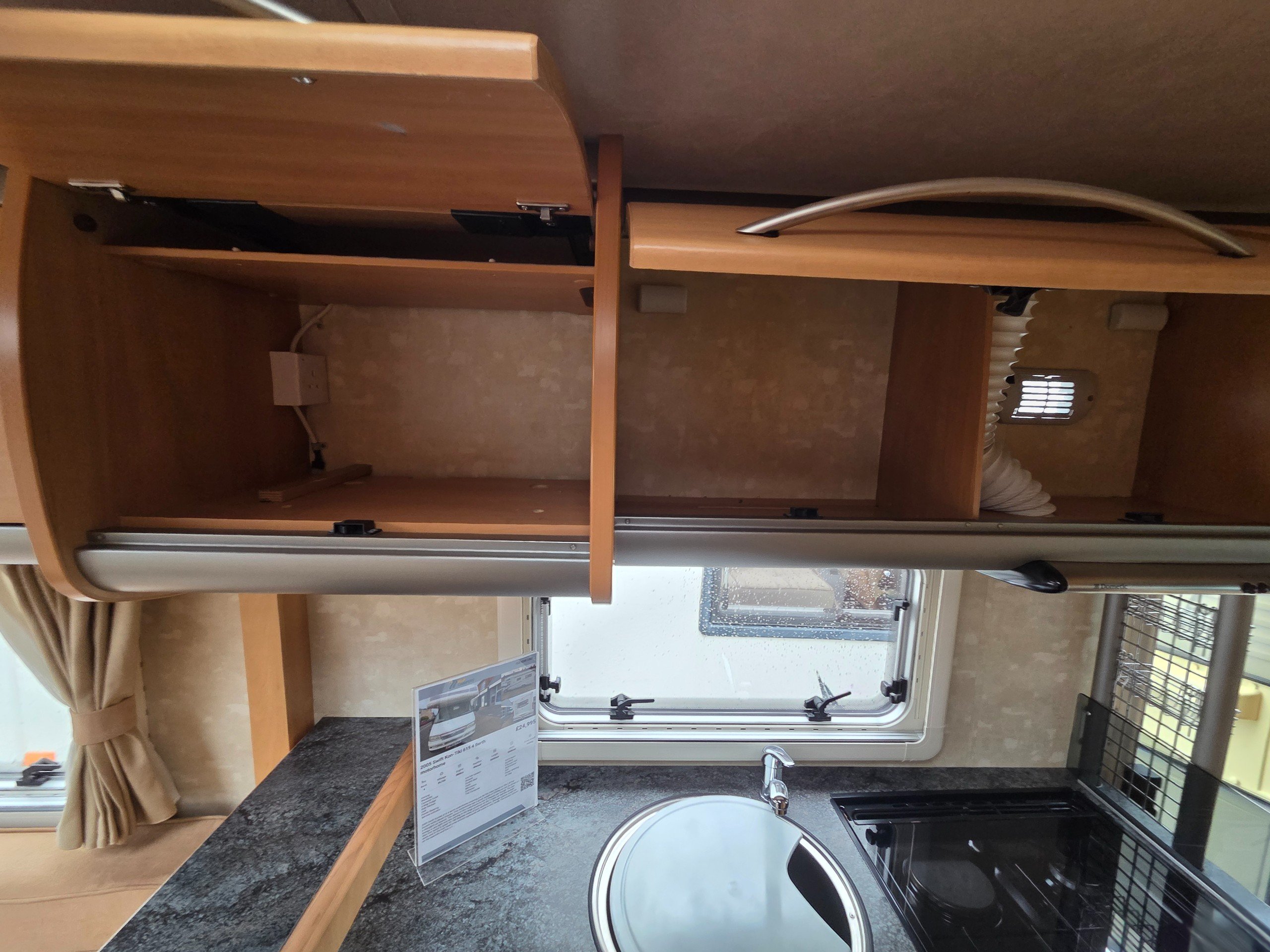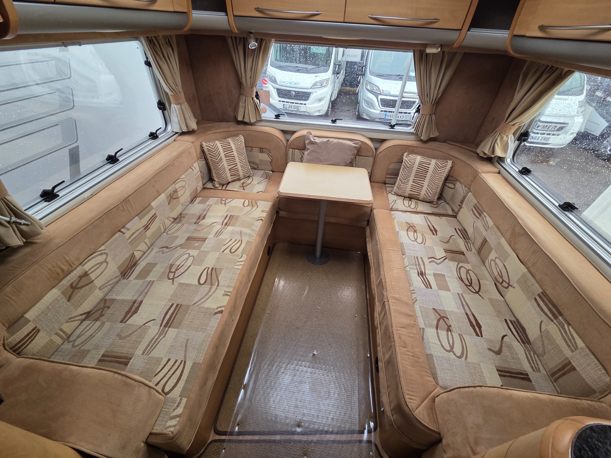 The rear lounge is very light and airy owning to the large windows on the 3 sides as well the skylight. Also this layout is great for 180 degrees views of your destiniation. Storage options under the seats and in the over head wrap around cupboards will come in very handy.