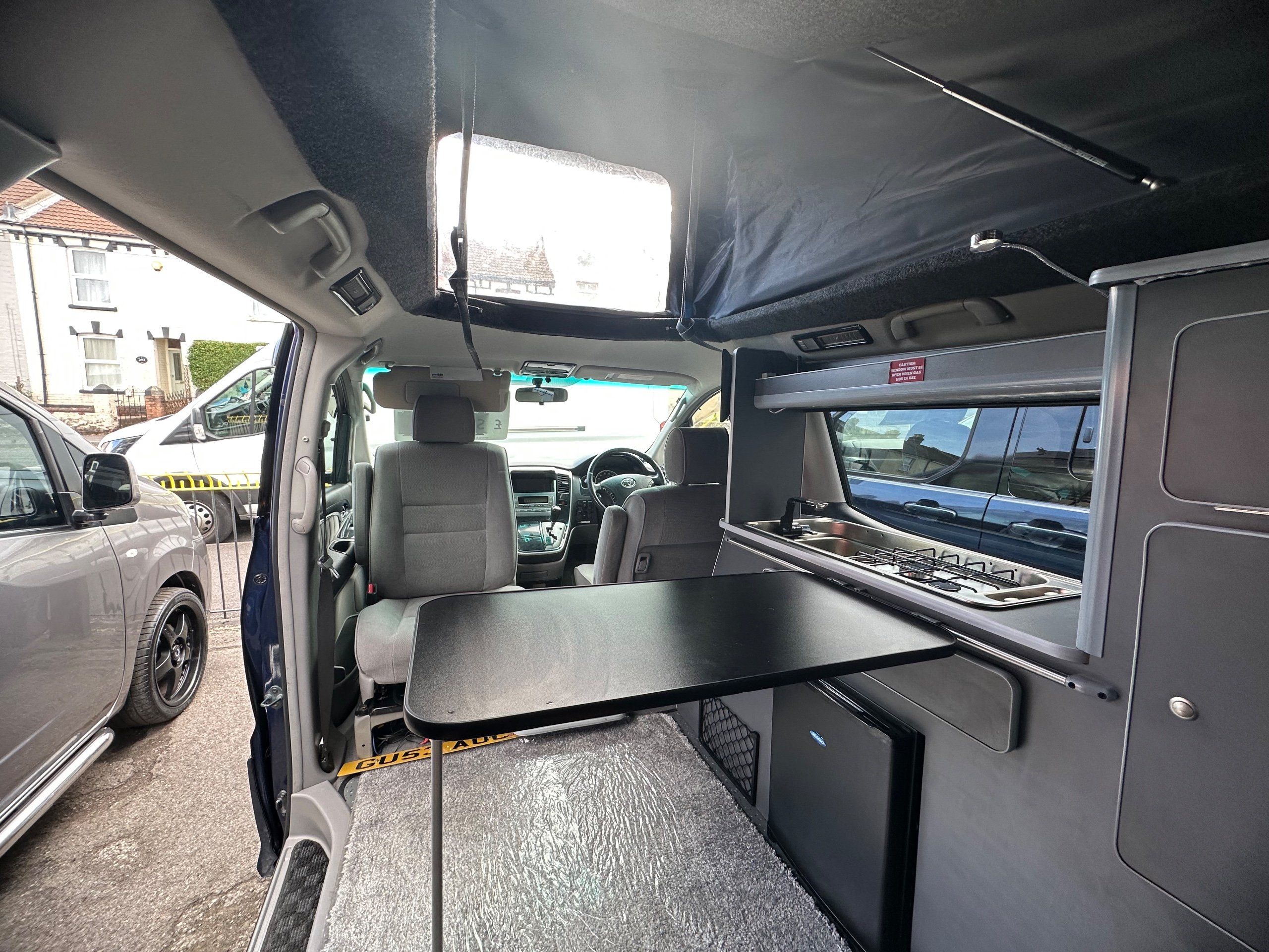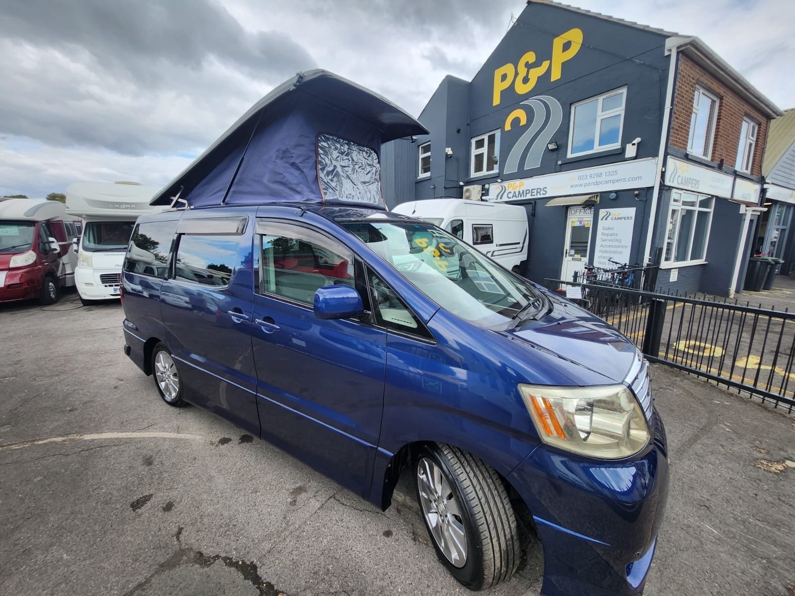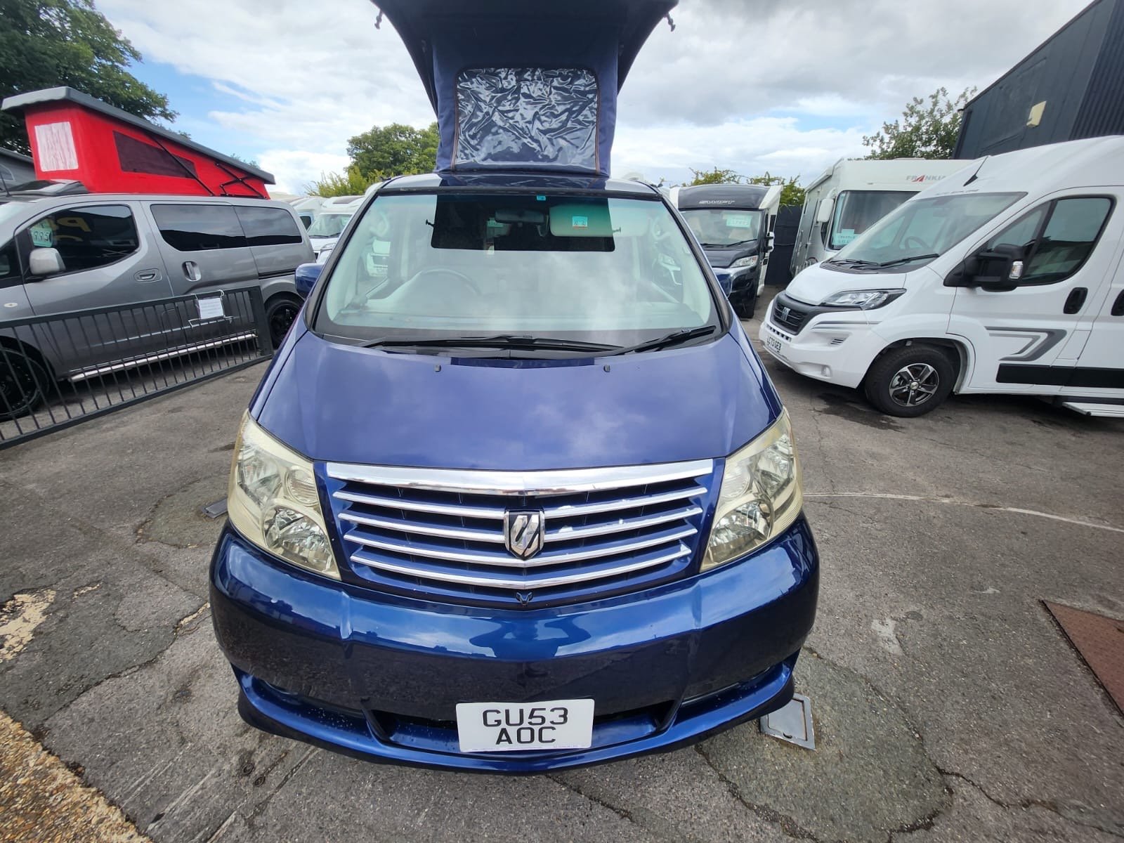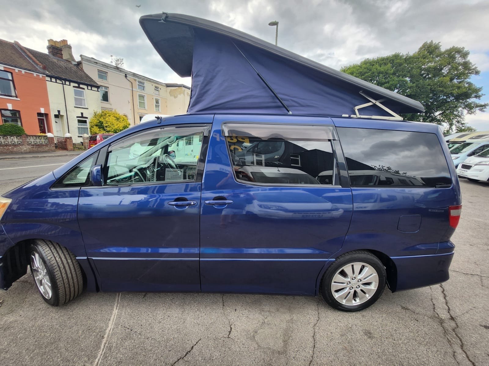 Automatic 2003 Toyota Alphard 2+2 berth side conversion camper. Based on a 2.4 petrol chassis covering just 66322 miles from new. ( the dash clocks read in km at 106736km) This requires just a standard car licence to drive and would also make a great mobile beach hut. 4WD