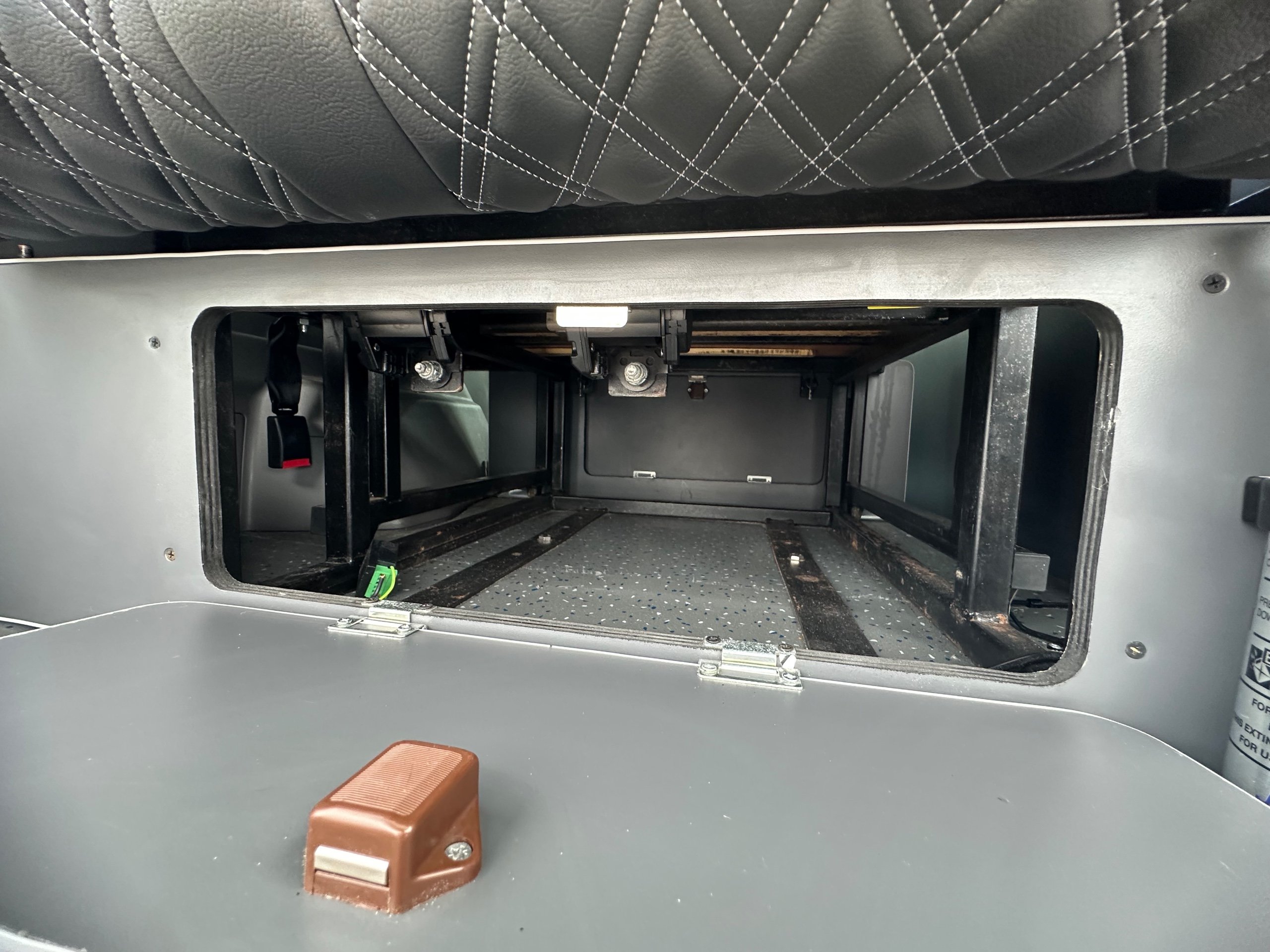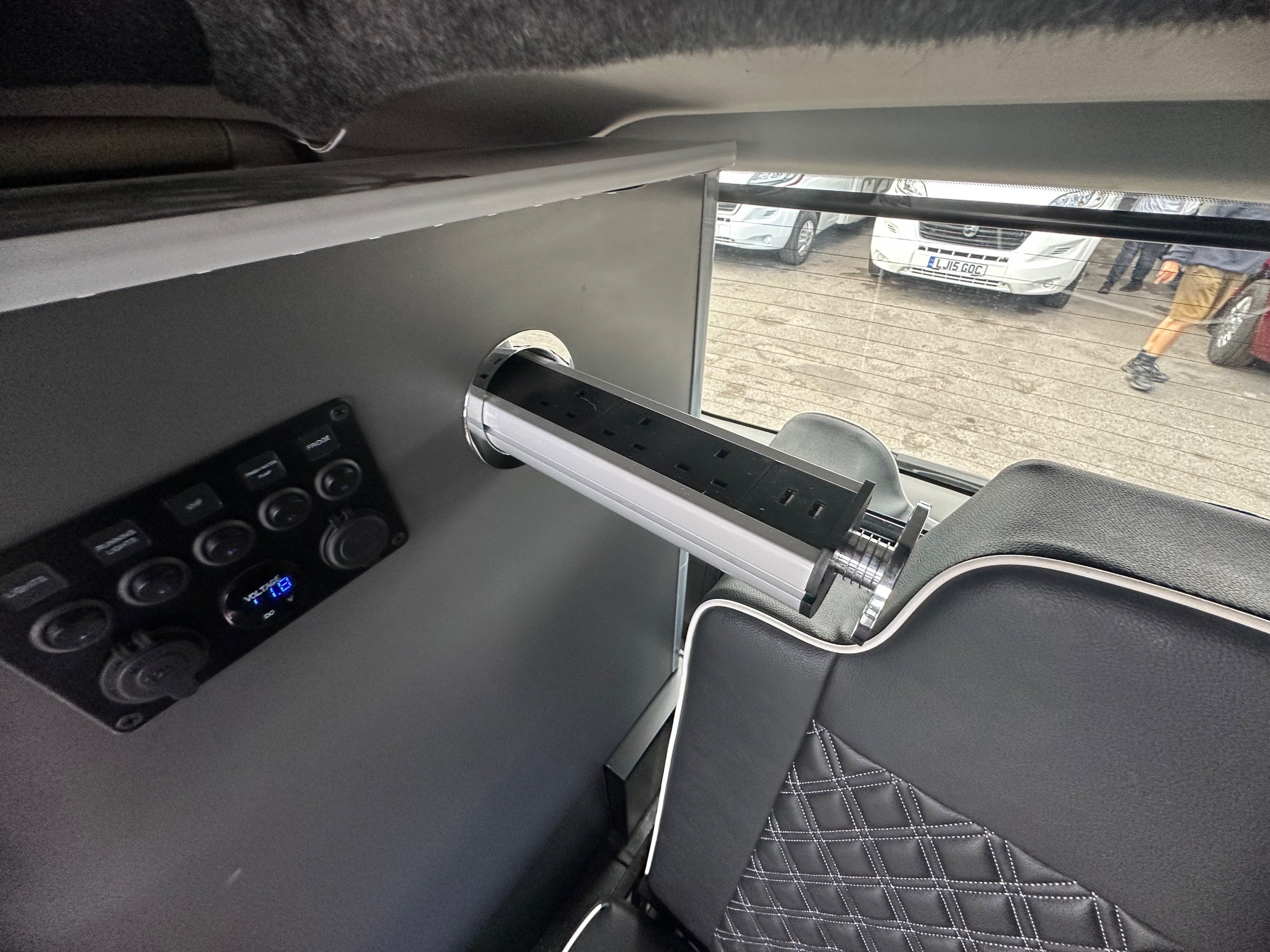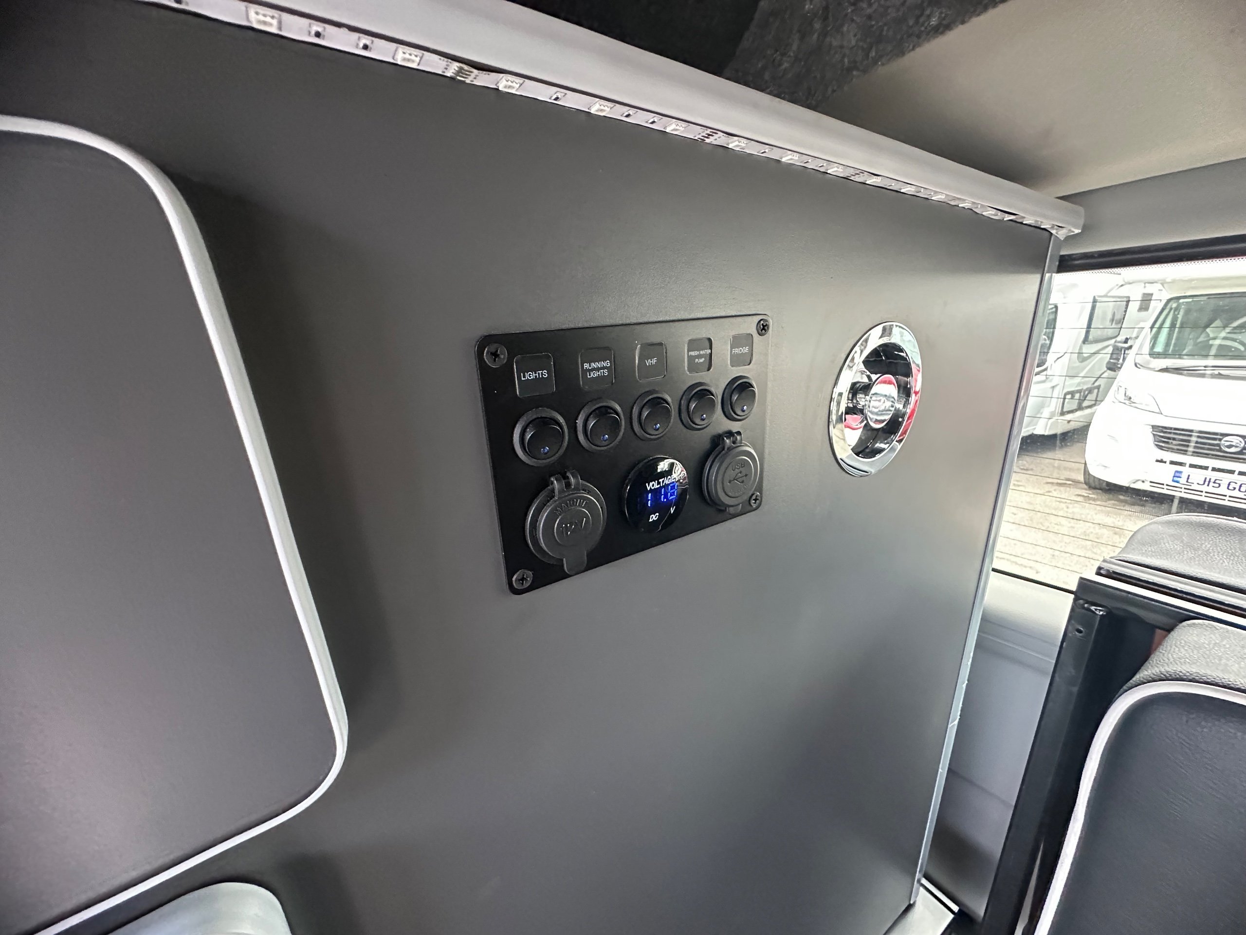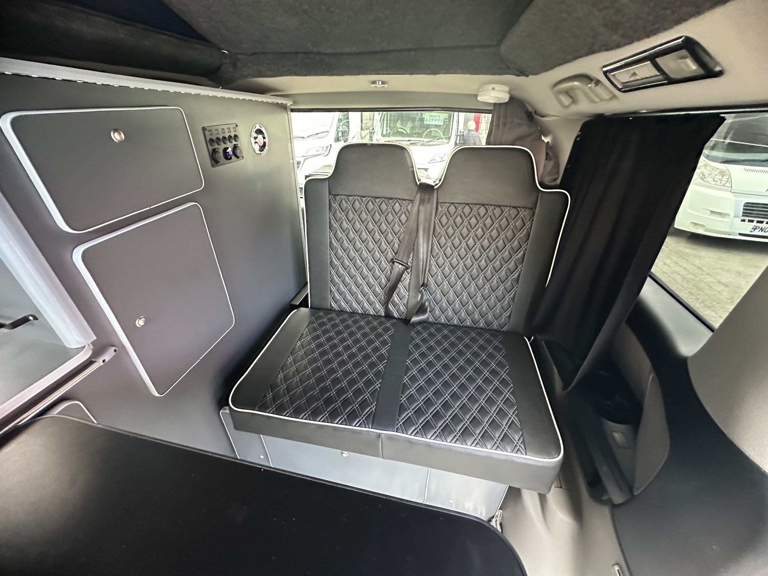 Passenger cab front swivel seat opens the space up too. The rear lounge seat rolls opens up to form a double bed and also houses 2 extra travelling seat belts both are 3 point belts. There are 230v sockets availbale for when you are on hook up.