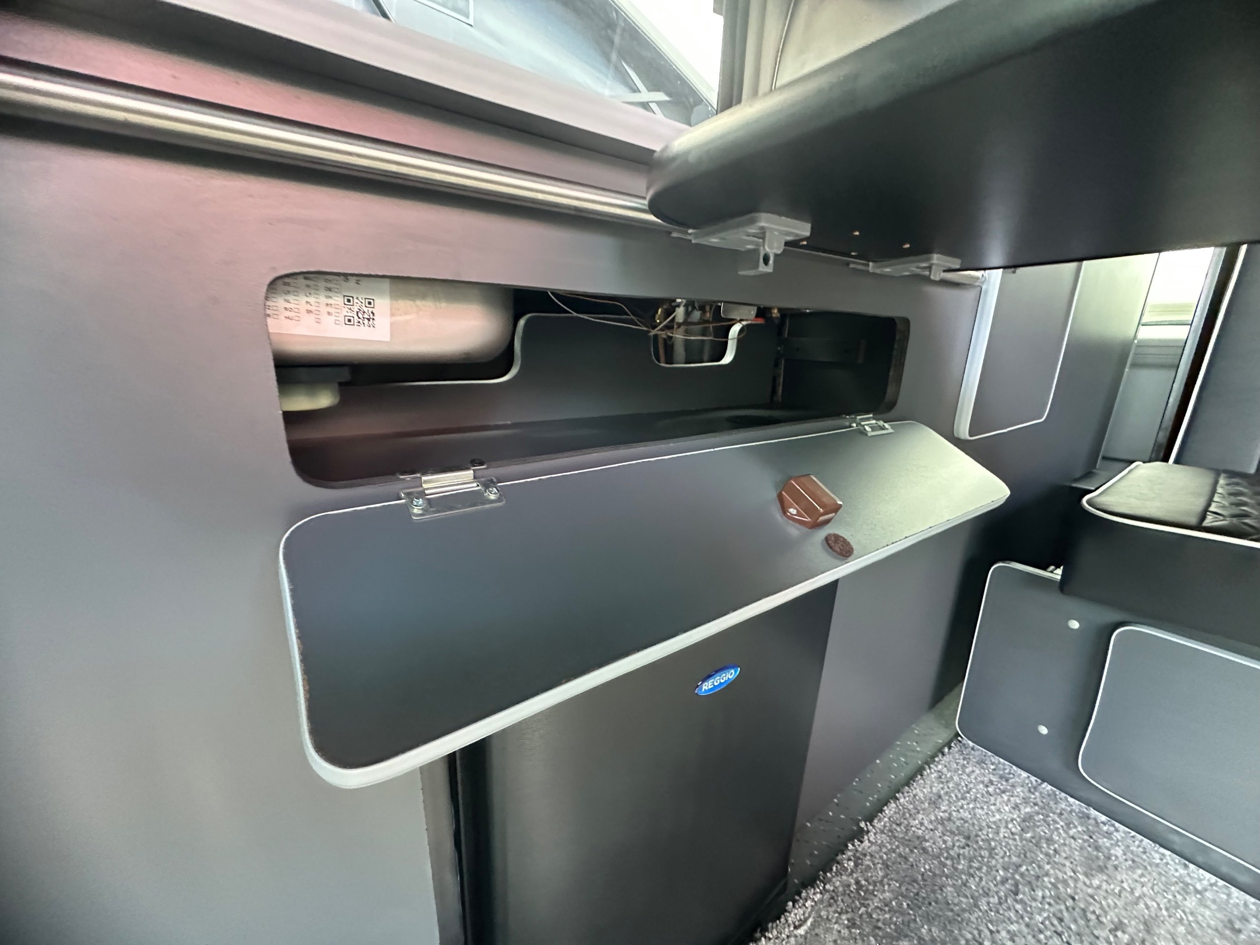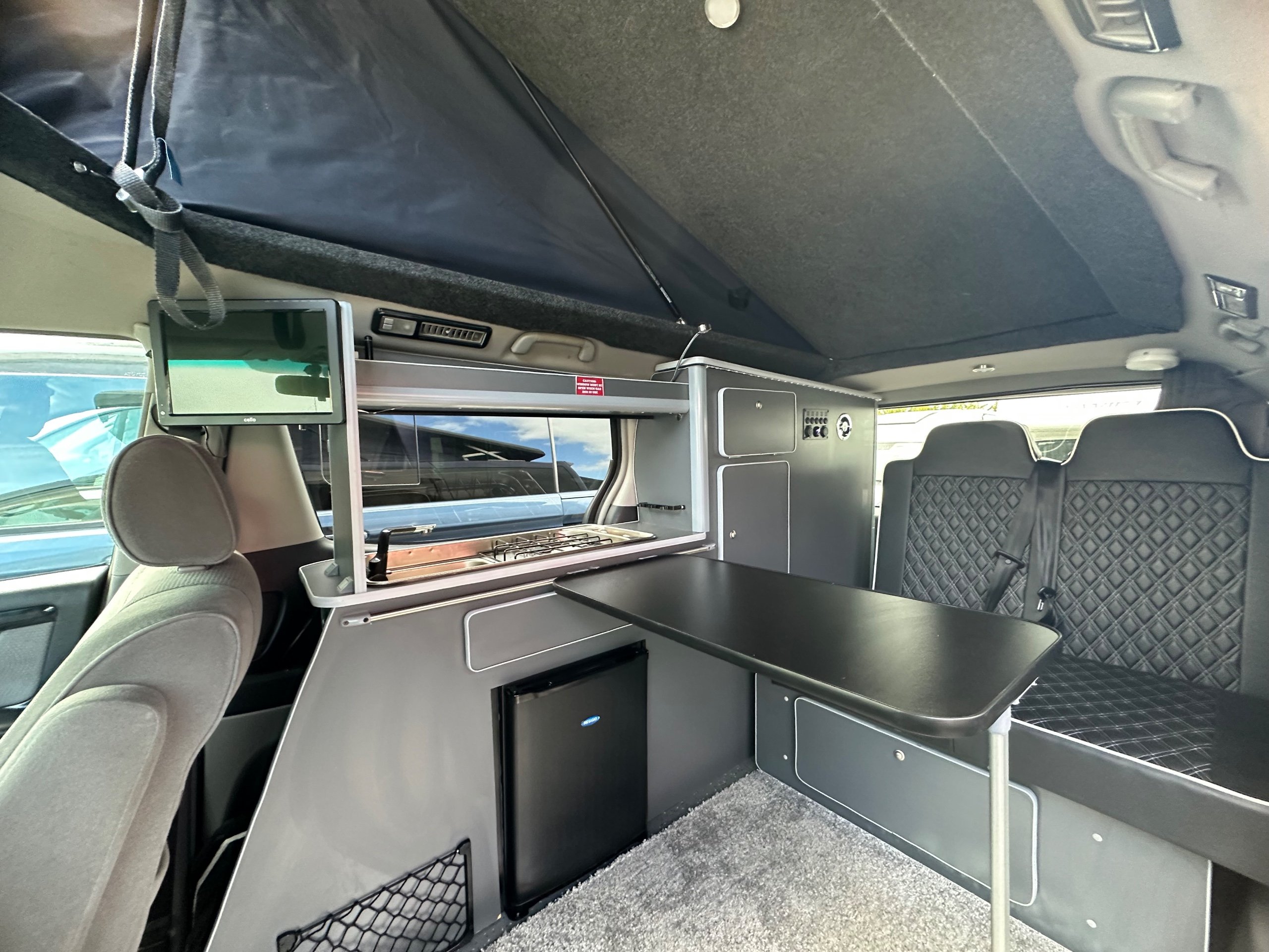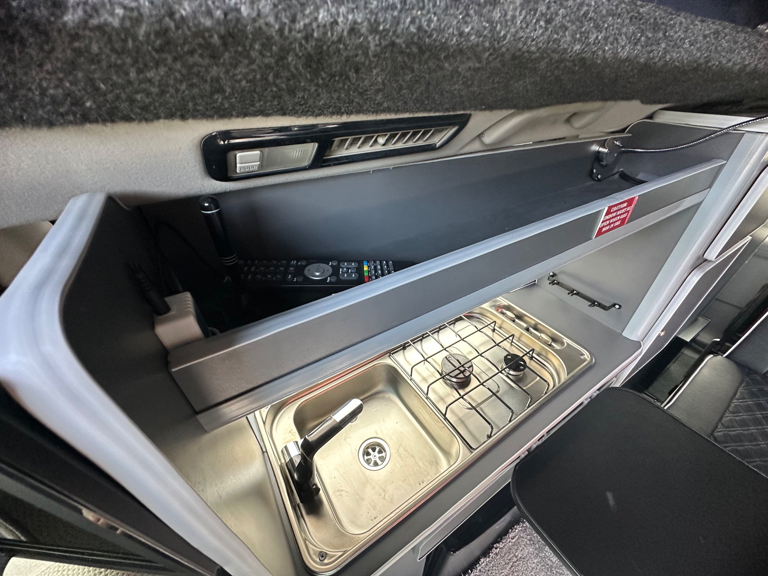 The side conversion has all you would expect with a 12v/230v fridge, 2 burner gas hob, sink , over cooker storage great for the tea, coffee, sugar etc. Storage to the rear with a small wardrobe. Mini TV.