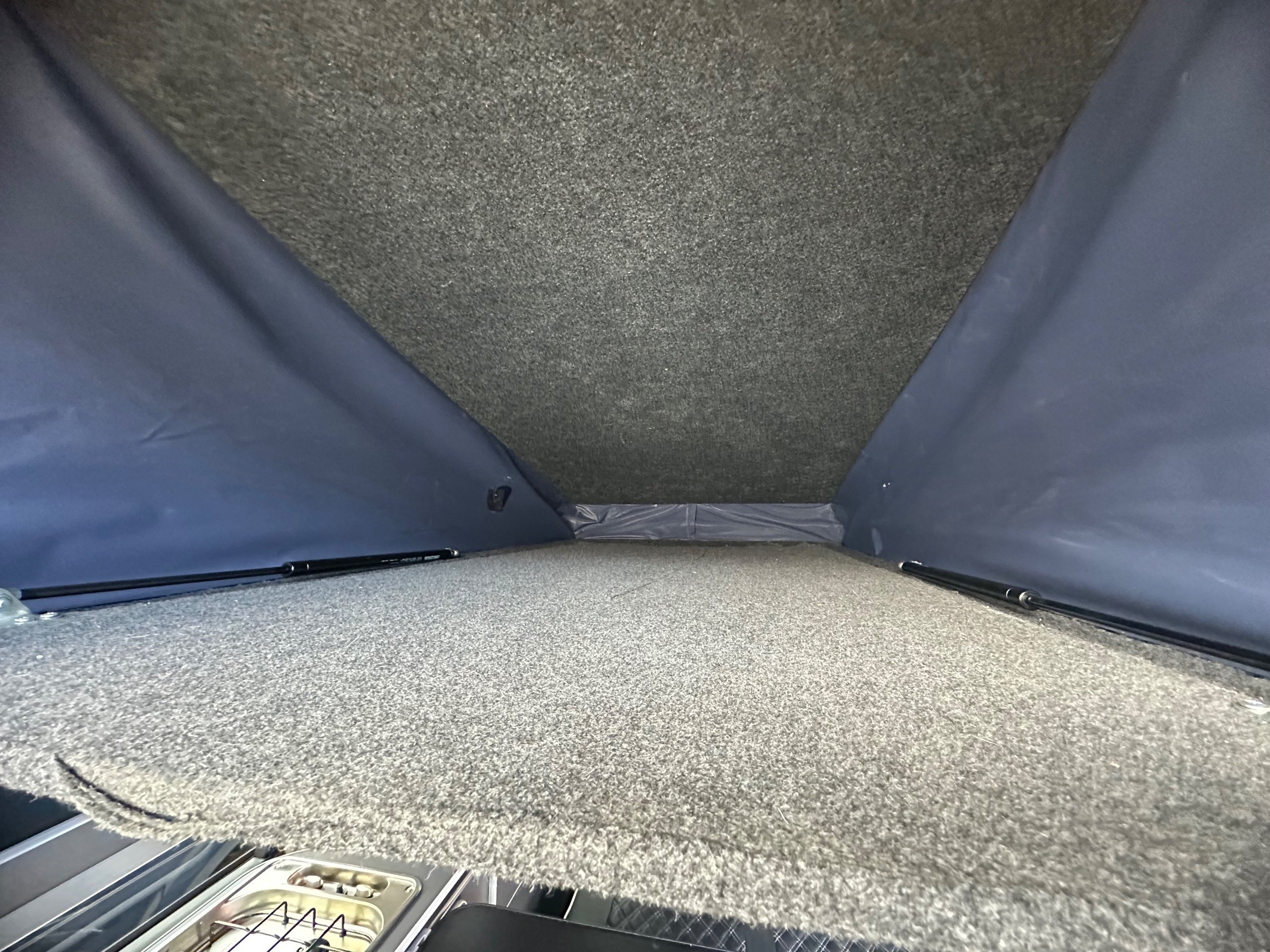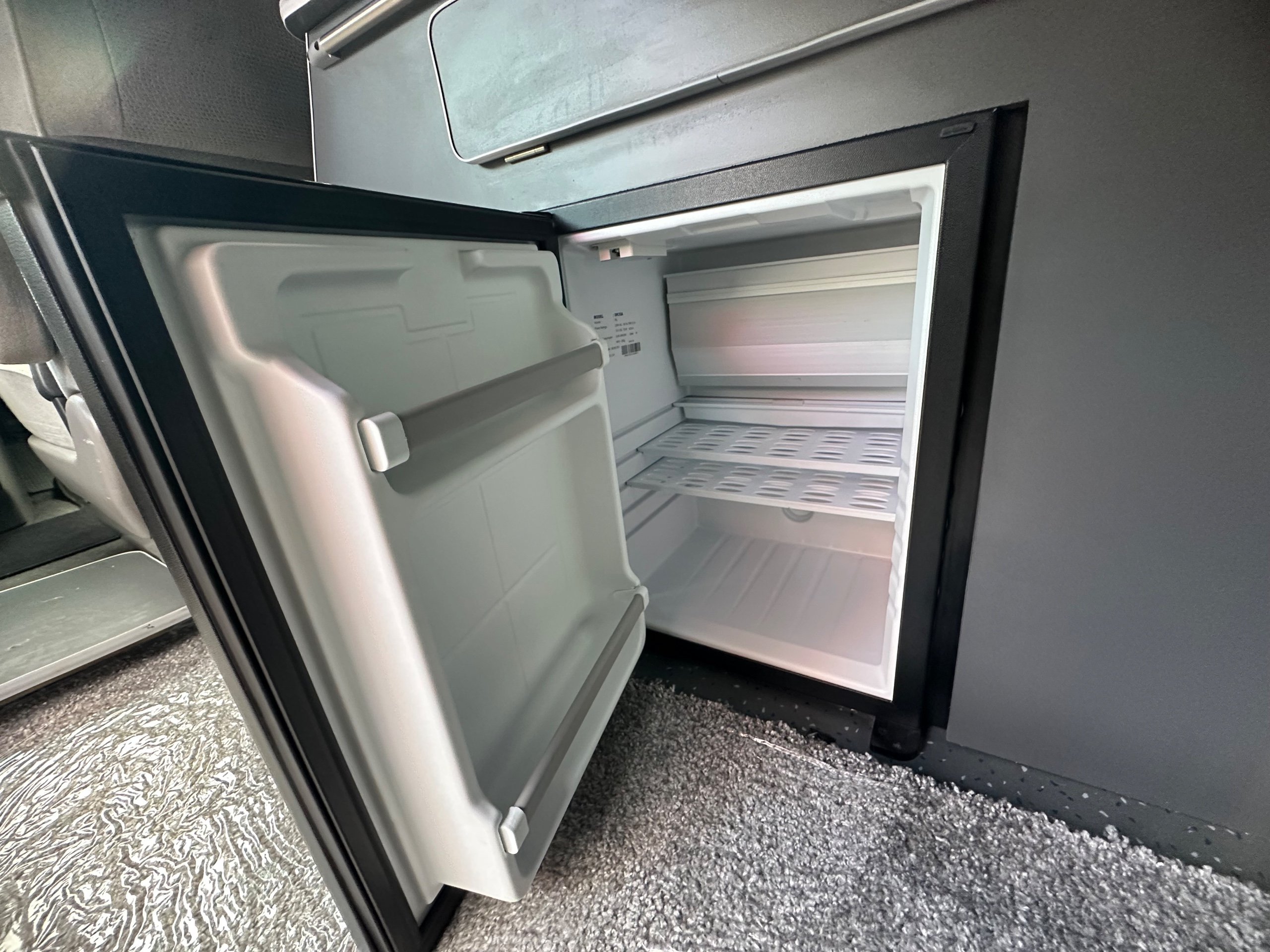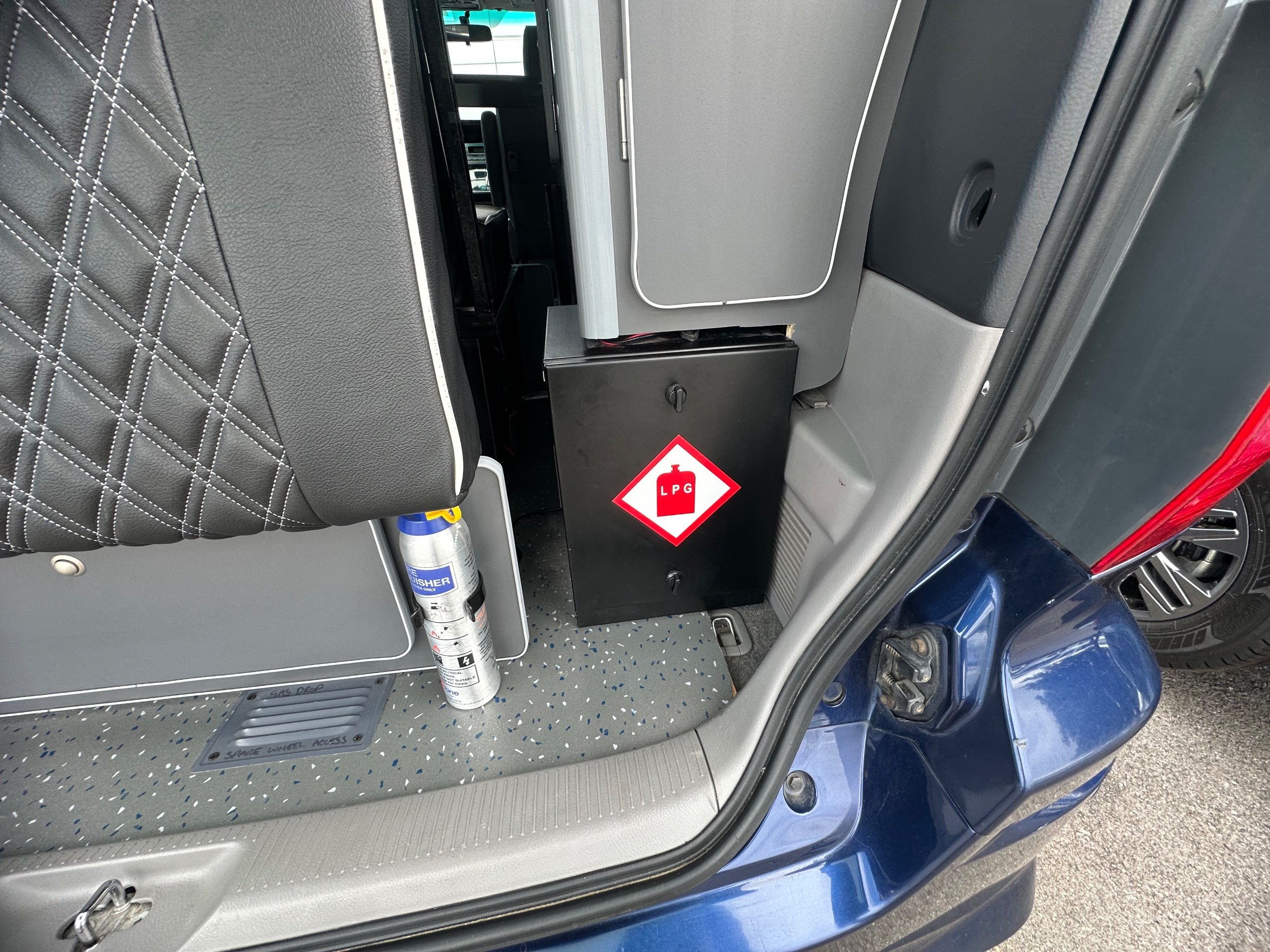 The side conversion has all you would expect with a 12v/230v fridge, 2 burner gas hob, sink , over cooker storage great for the tea, coffee, sugar etc. Storage to the rear with a small wardrobe. Mini TV.